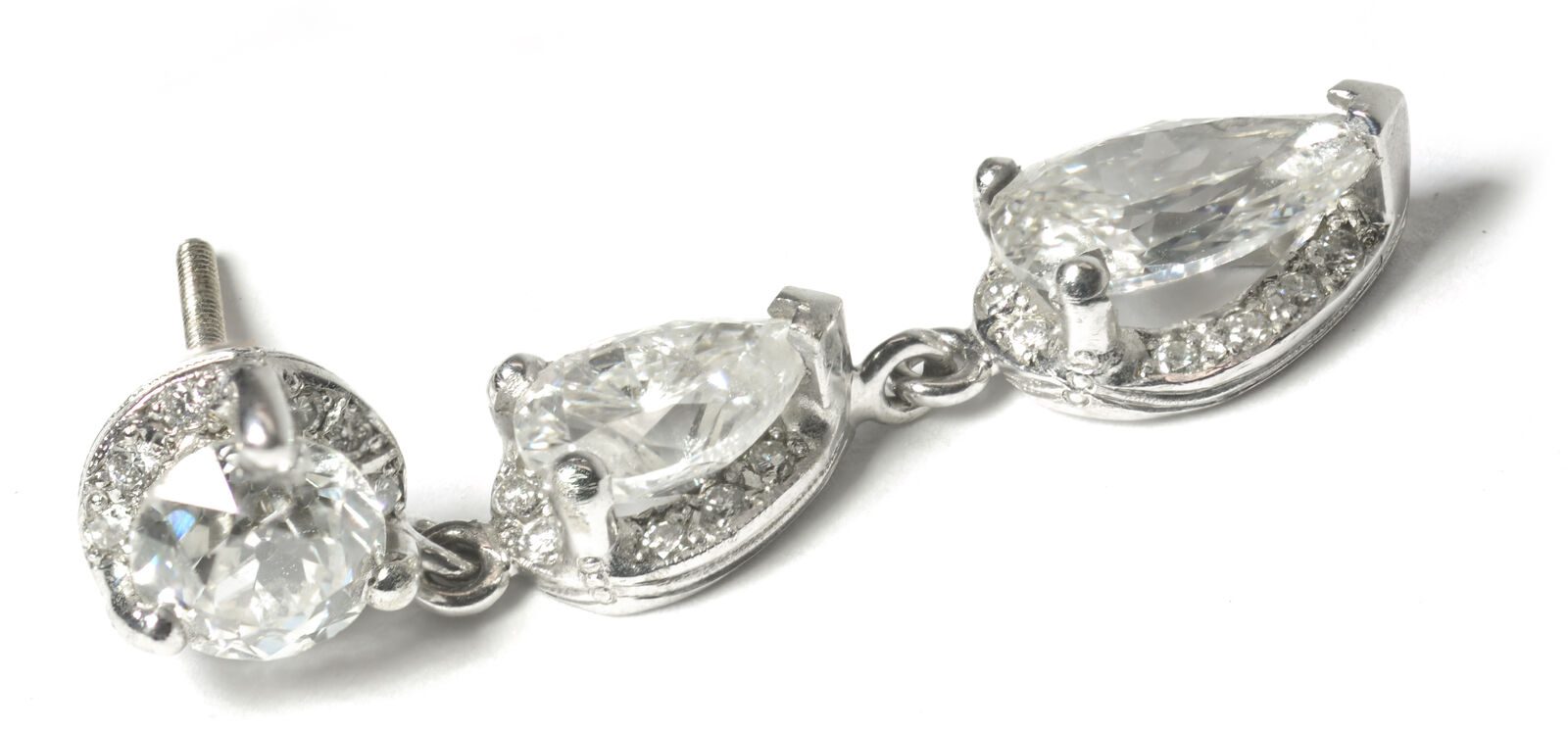 these magnificent dangle earrings features two pear and one round diamond on each earring, with a diamond outline underneath each of the larger stones to give it an extra sparkle.