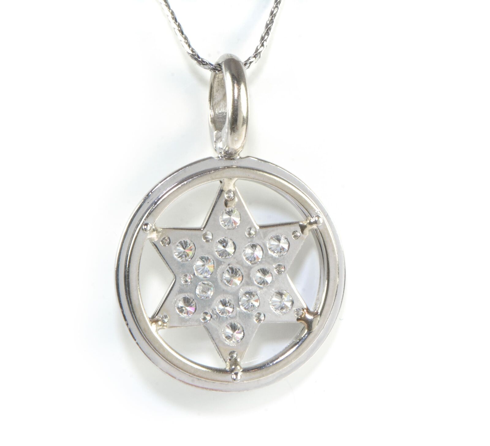 this stunning sauro star of david pendant is crafted in 18k white gold. It weighs 7.49 grams. The diameter is 25mm. This pendant features 2 carats of vs clarity and g color diamonds. The chain is not included with this pendant. Please contact us if you want to purchase a chain with this pendant, we will help you find the perfect one!