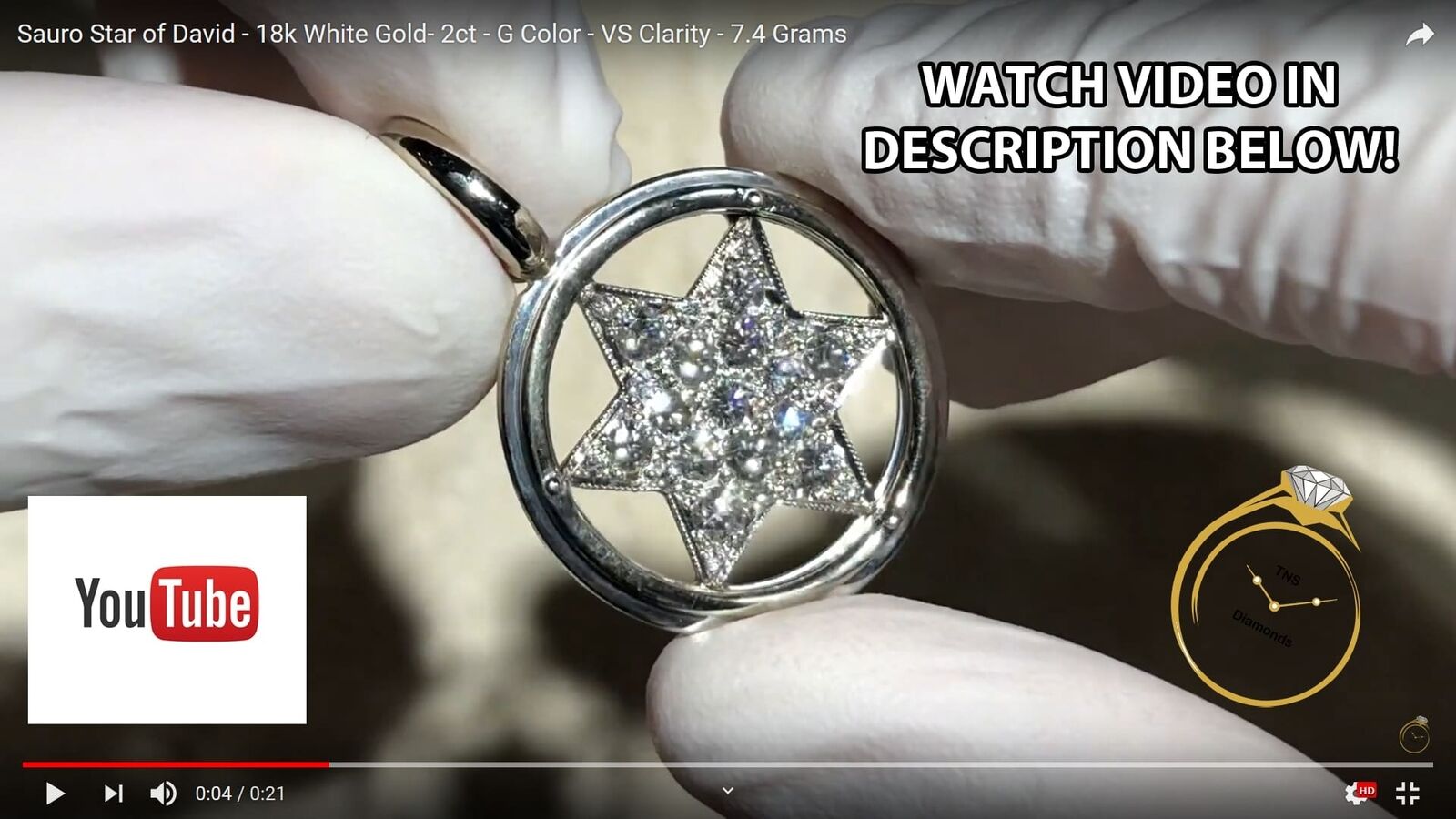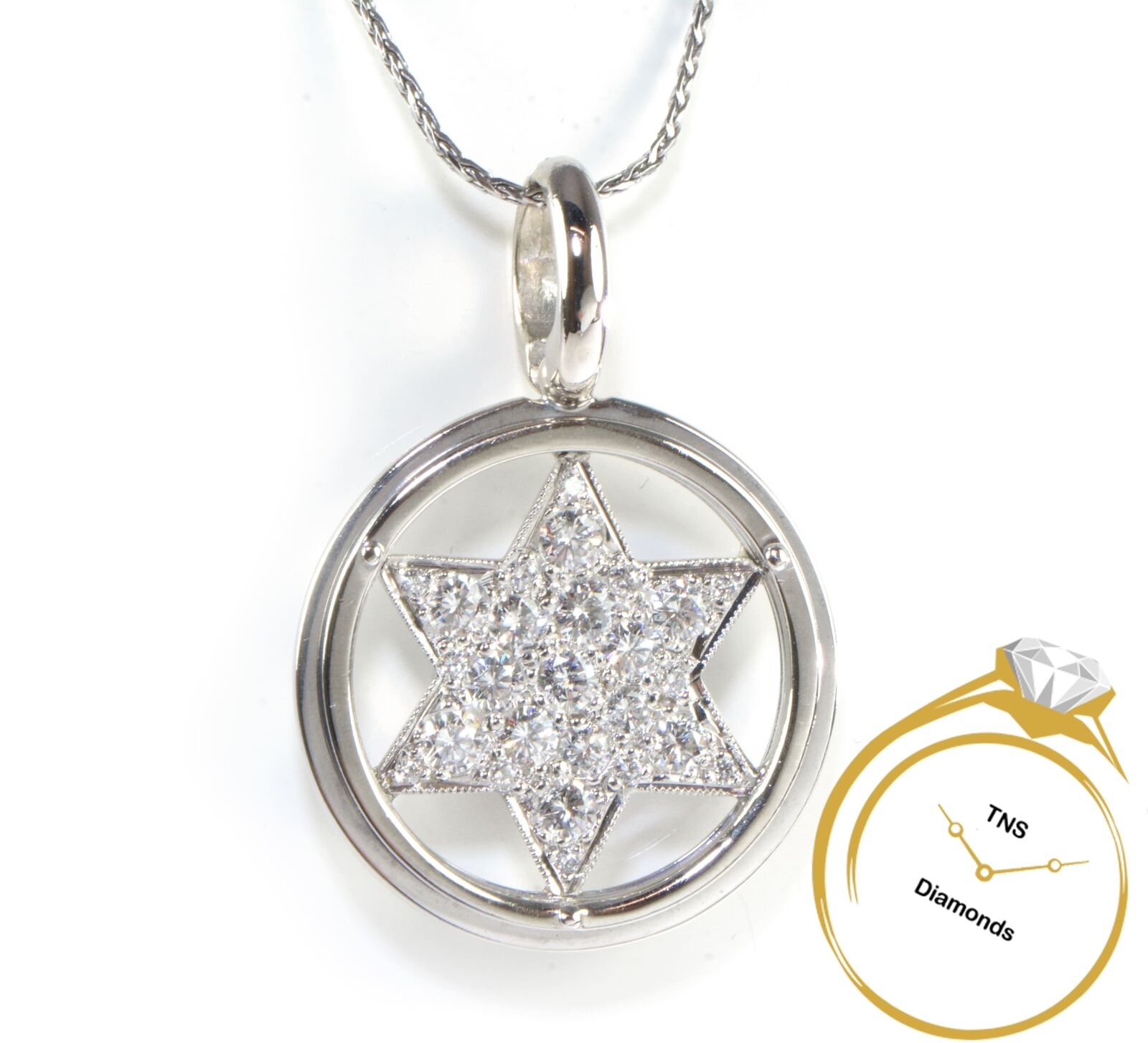 Product Description: This stunning sauro star of David pendant is crafted in 18k white gold. It weighs 7.49 grams. The diameter is 25mm. This pendant features 2 carats of VS clarity and G color diamonds. The chain is not included with...