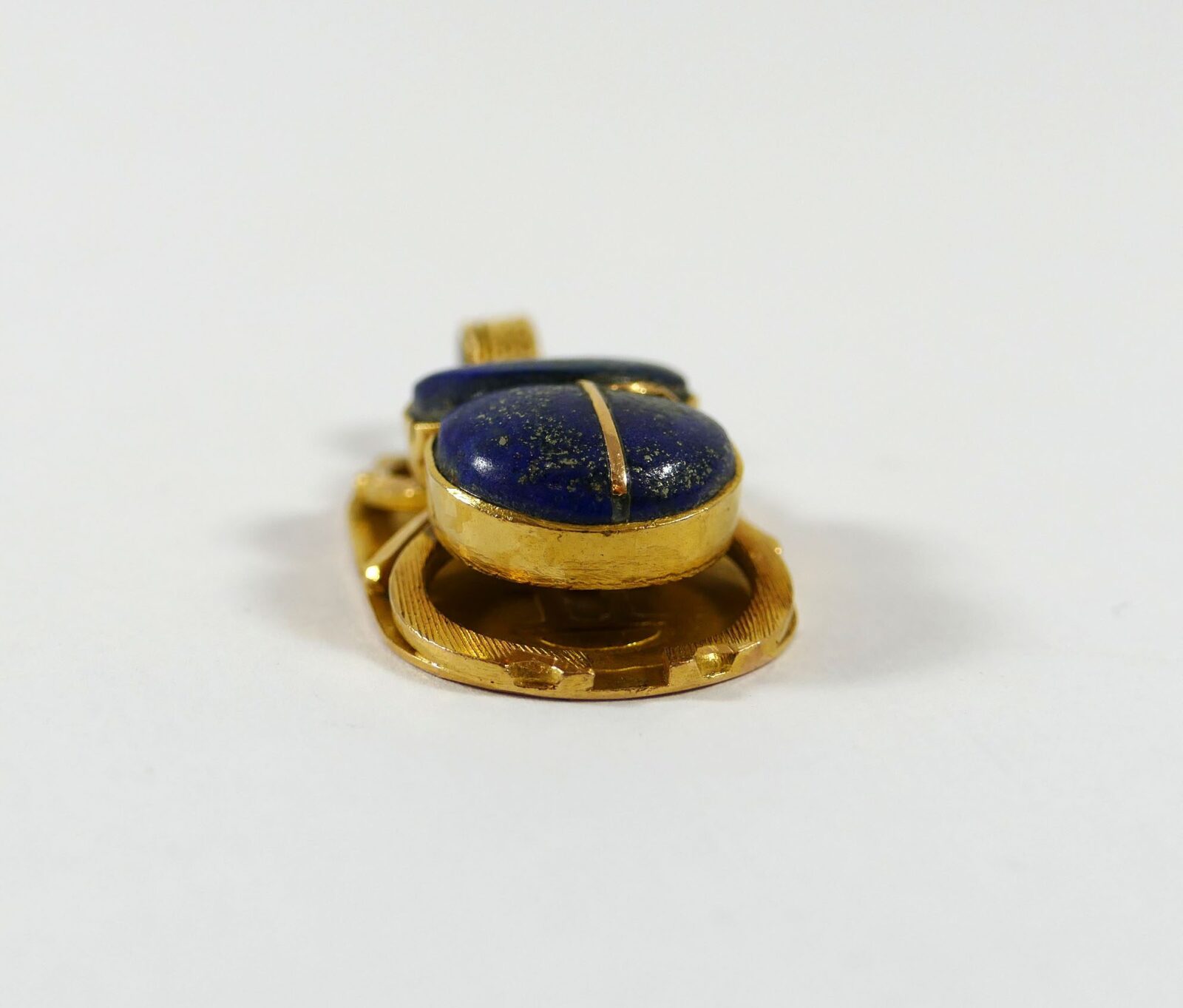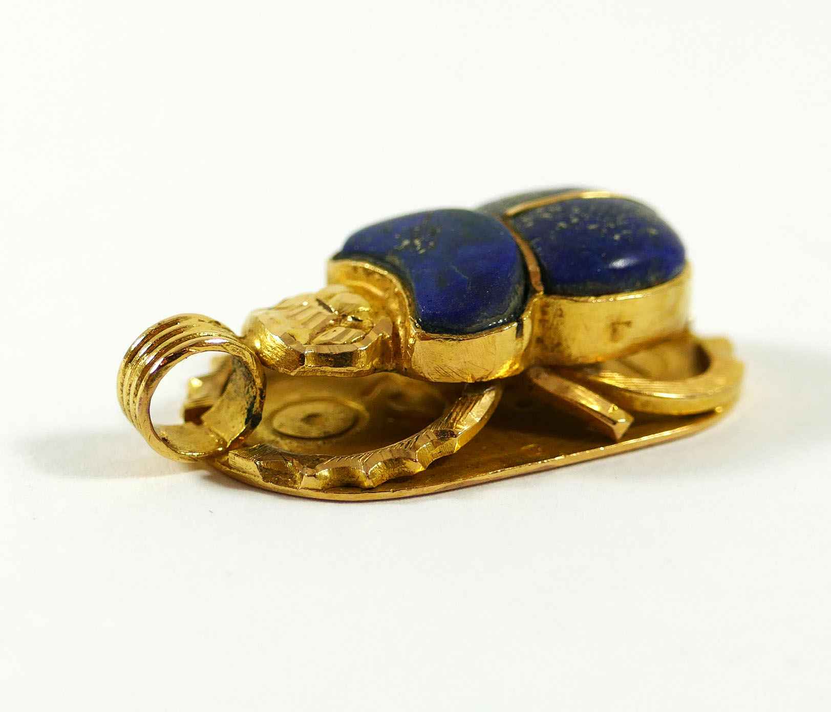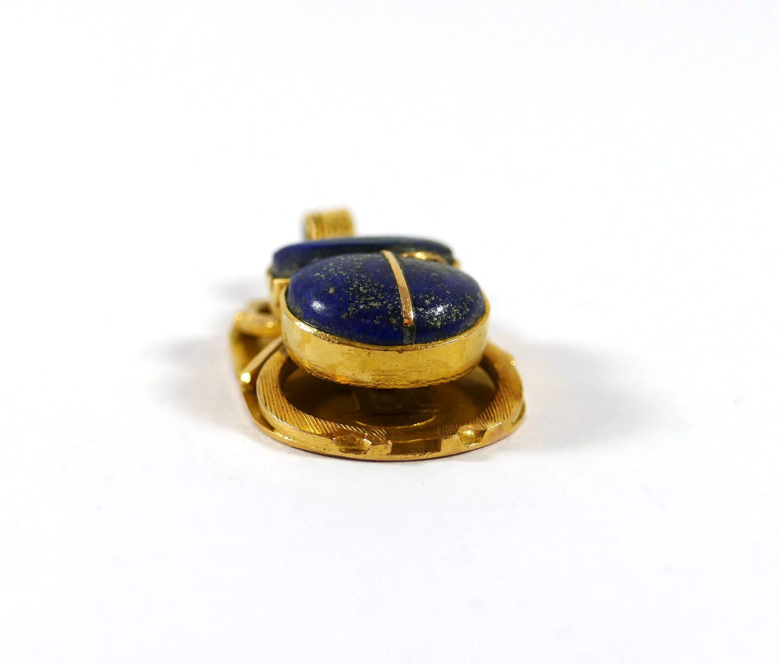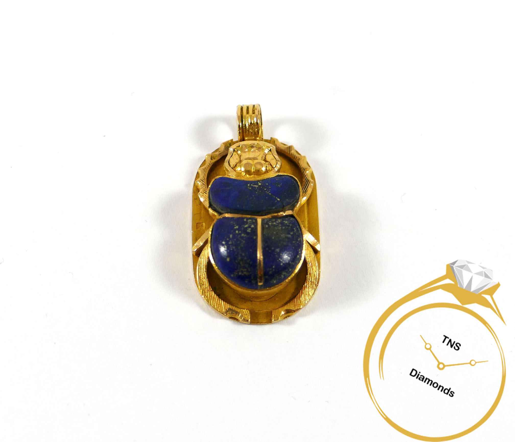 Description: This Antique Scarab Beetle pendant is unique and beautiful, with the body of the beetle being a deep blue Lapis Lazuli sitting on a hefty and bright 18k yellow ...