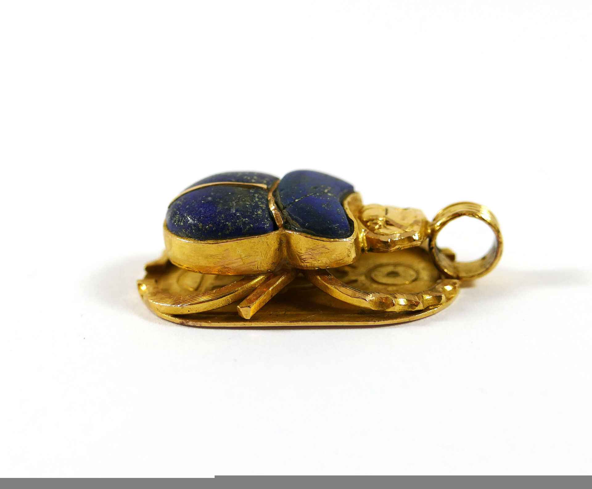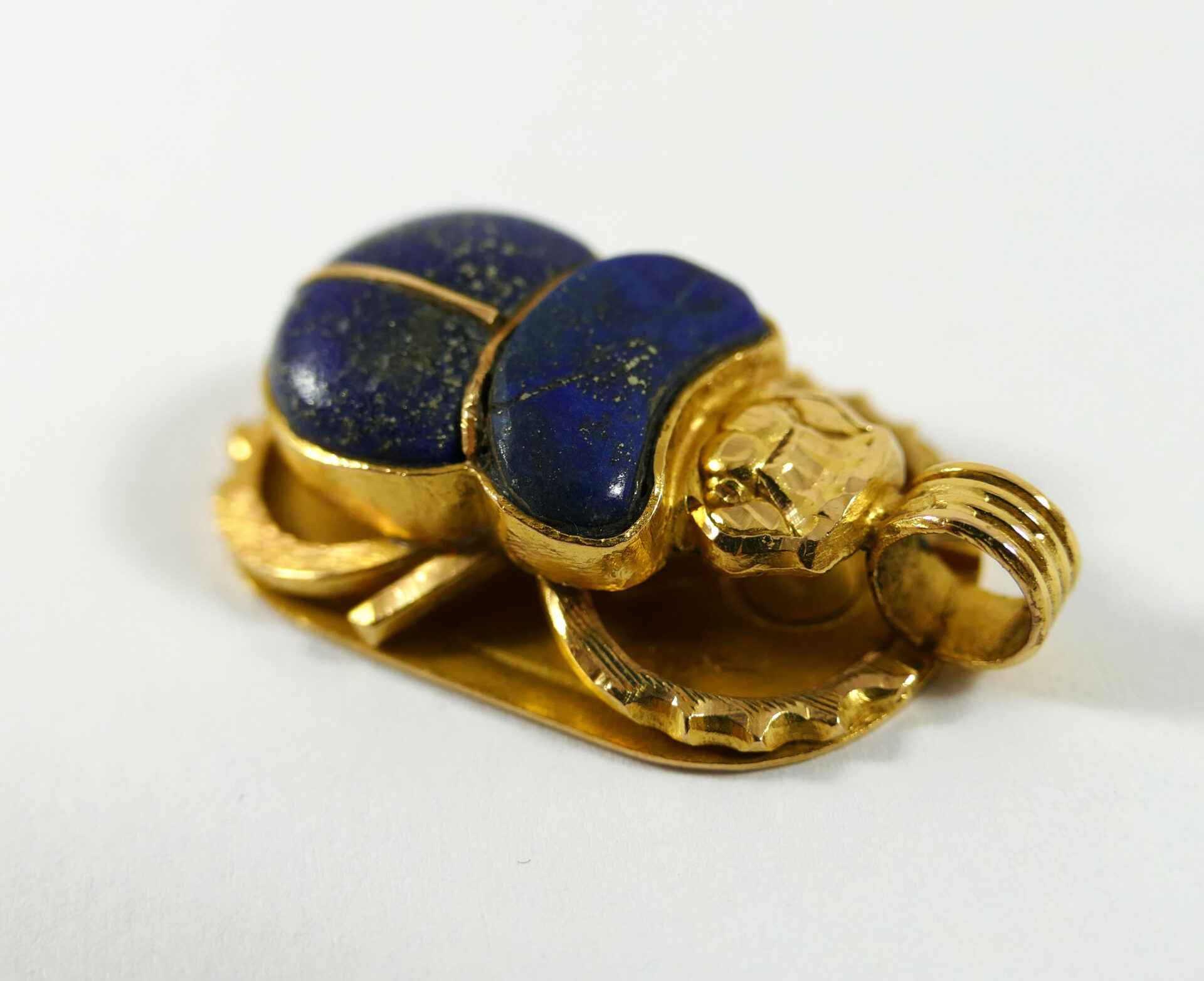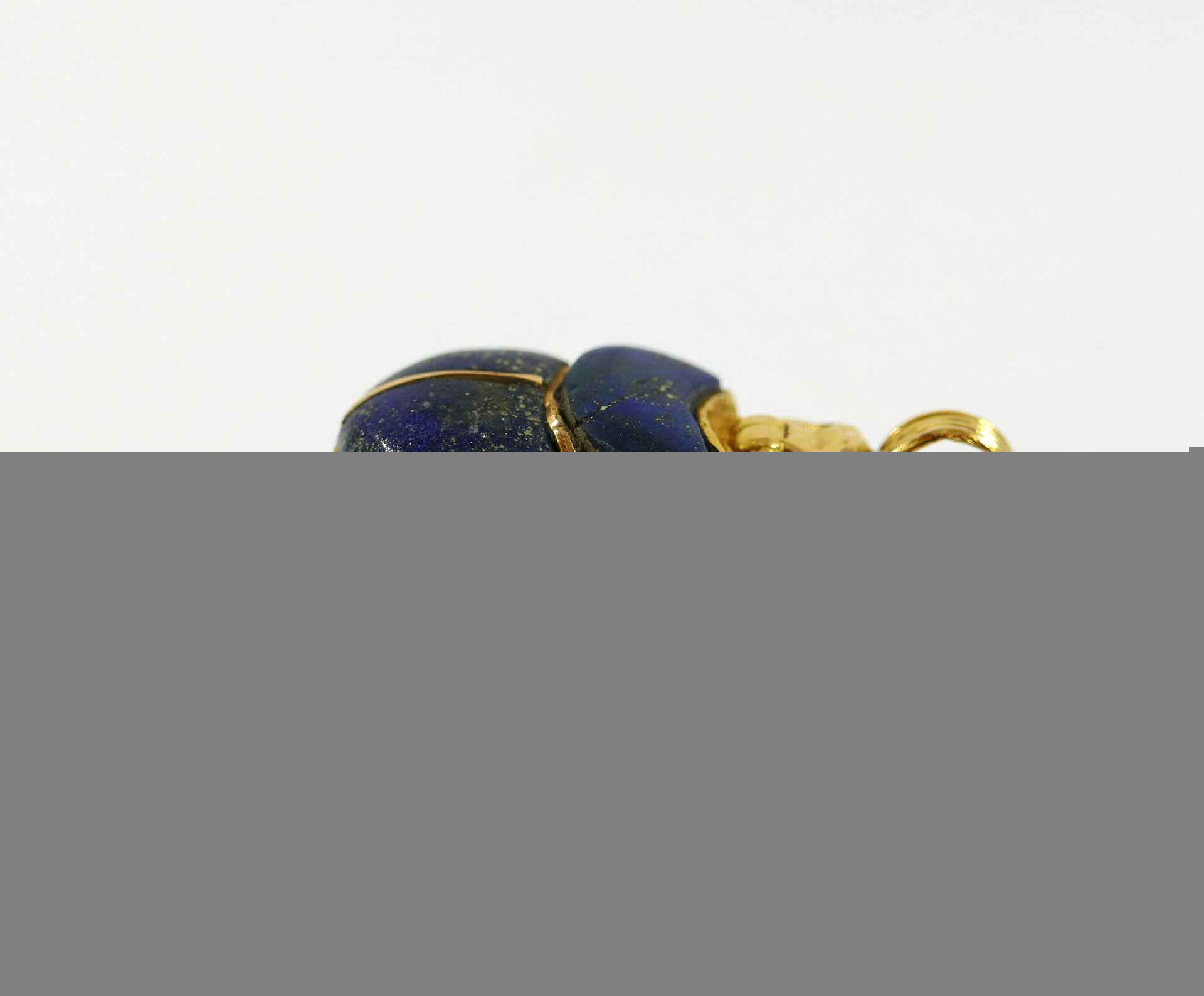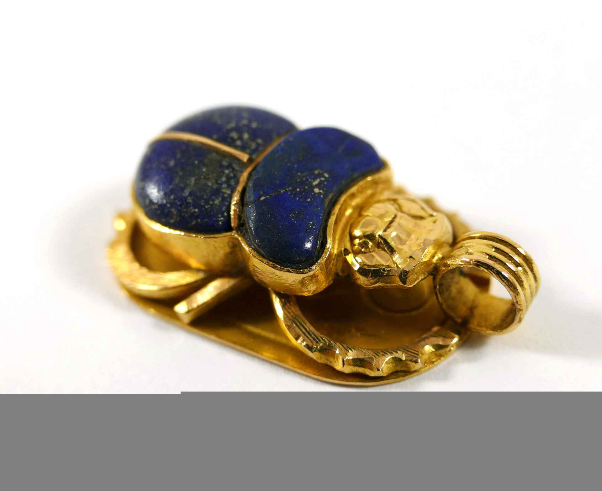 Description: This Antique Scarab Beetle pendant is unique and beautiful, with the body of the beetle being a deep blue Lapis Lazuli sitting on a hefty and bright 18k yellow ...