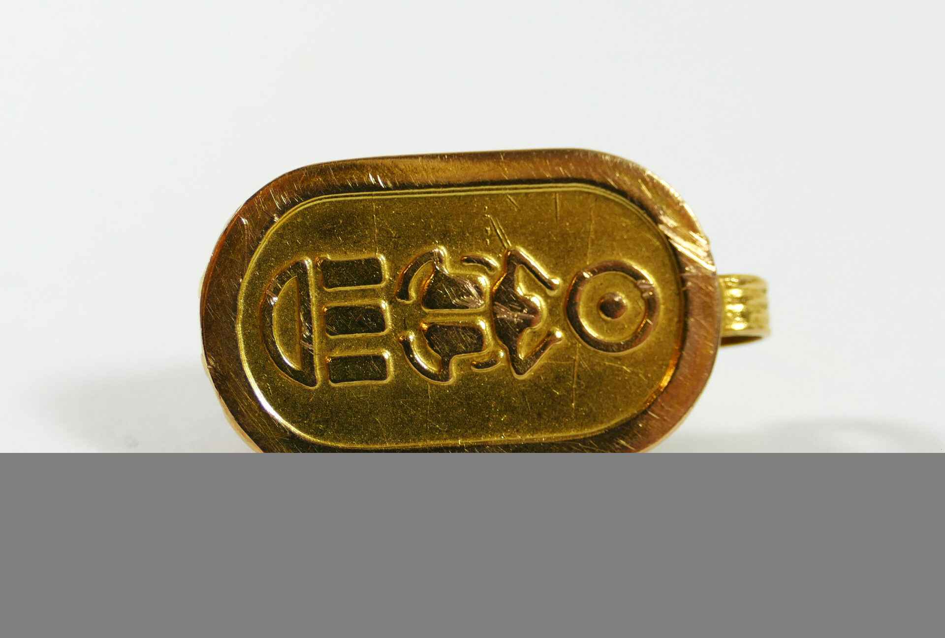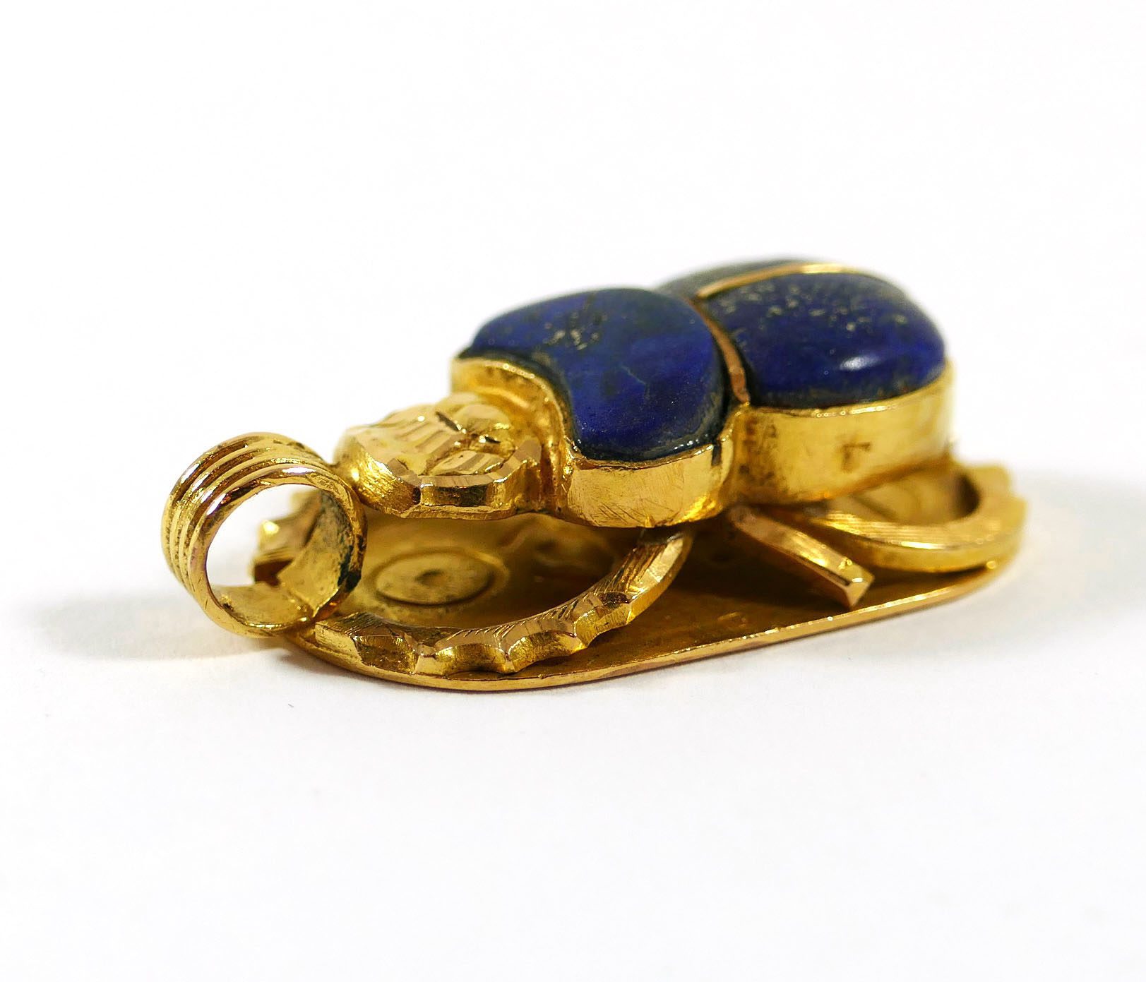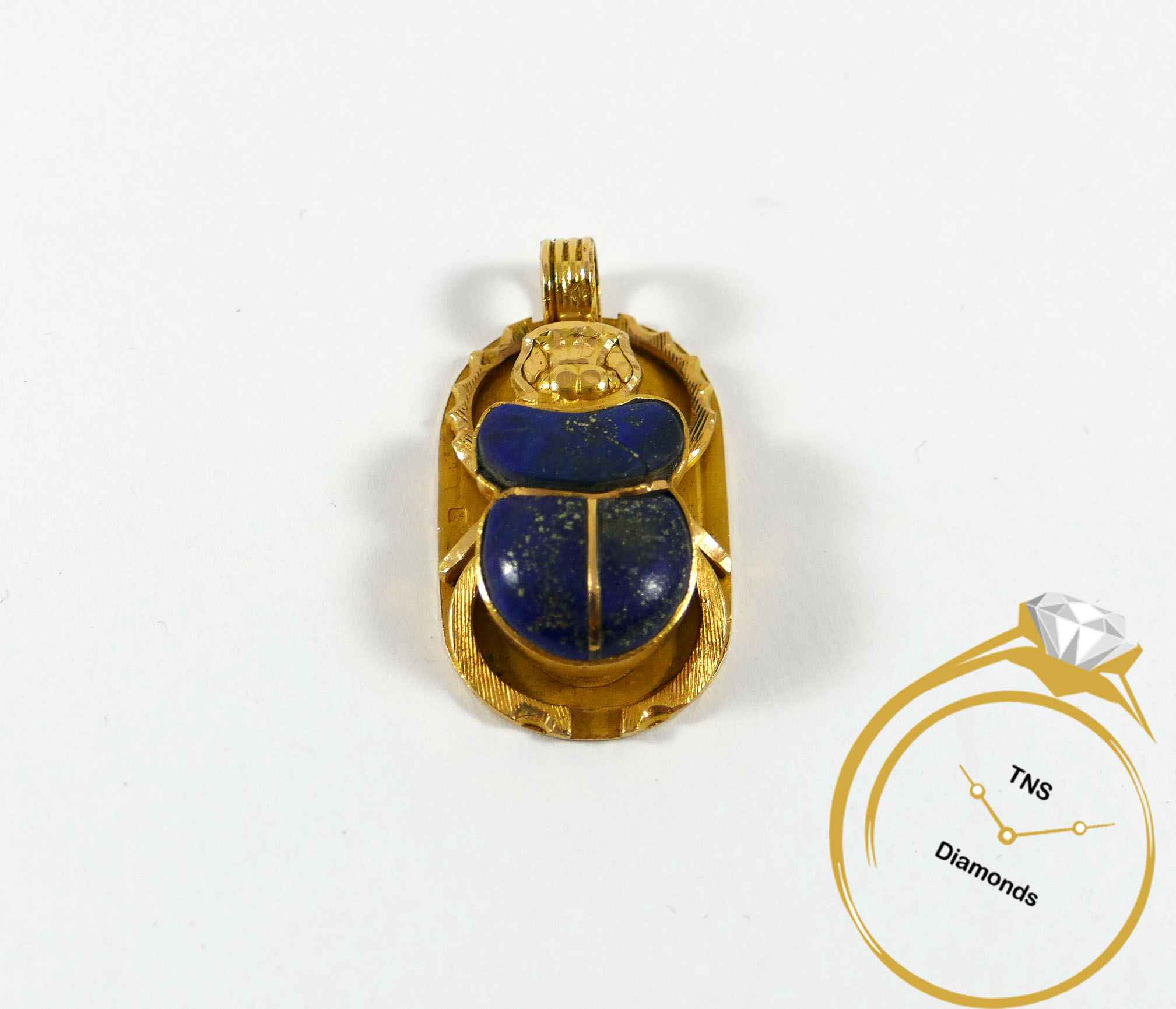 this antique scarab beetle pendant is unique and beautiful, with the body of the beetle being a deep blue lapis lazuli sitting on a hefty and bright 18k yellow gold. The pendant is 3d, with the scarab beetle sitting on a slate of gold with aztec symbols on the back of the pendant.