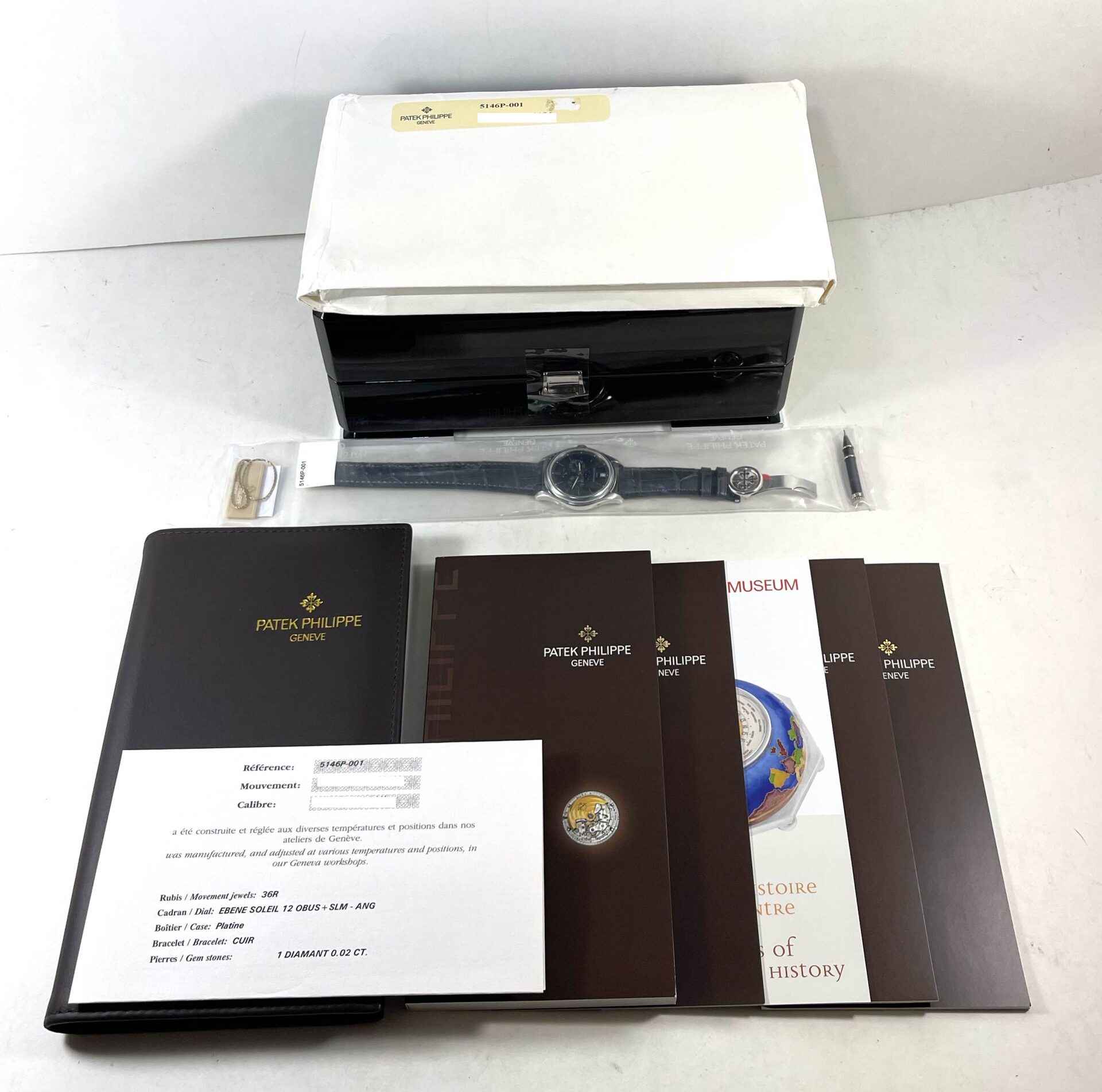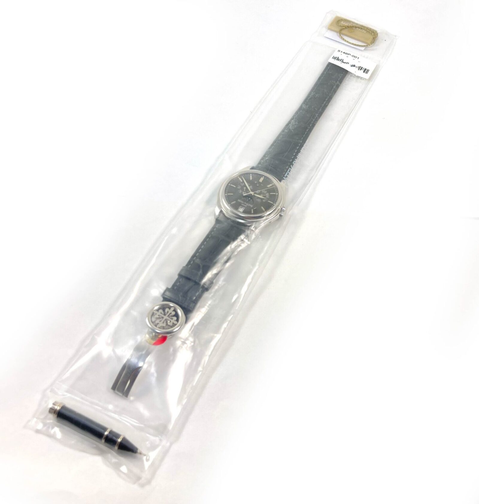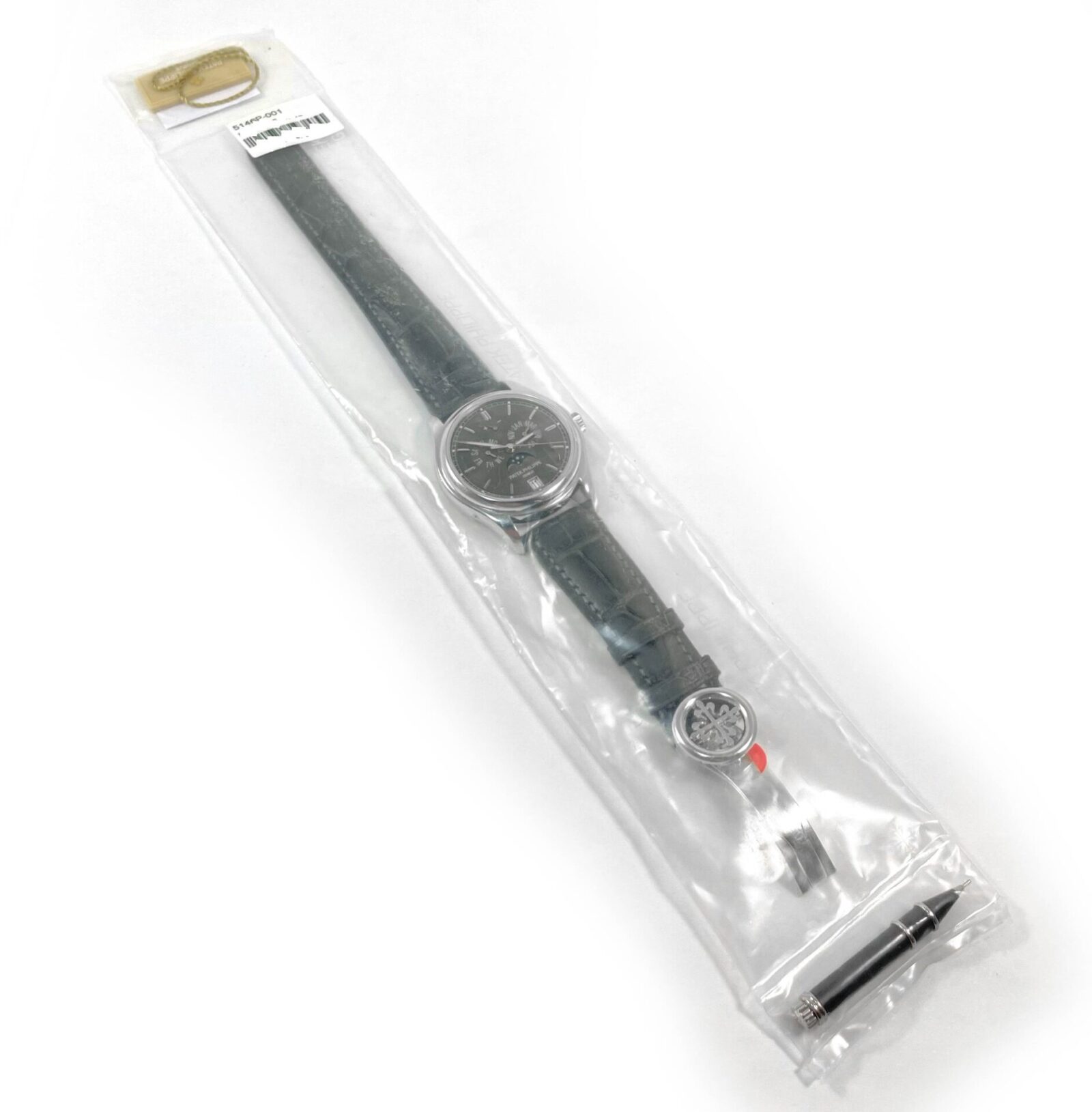 Read Morethis patek philippe is new and comes sealed in its original packaging as shown in the photos attached. This watch also comes with its box, papers, patek tool, hang tag, and warranty papers dated april 16th, 2012. This watch features a platinum case that surrounds a grey dial displaying the hour, day, date, month, and moonphase. This watch is in stock and available to ship immediately!