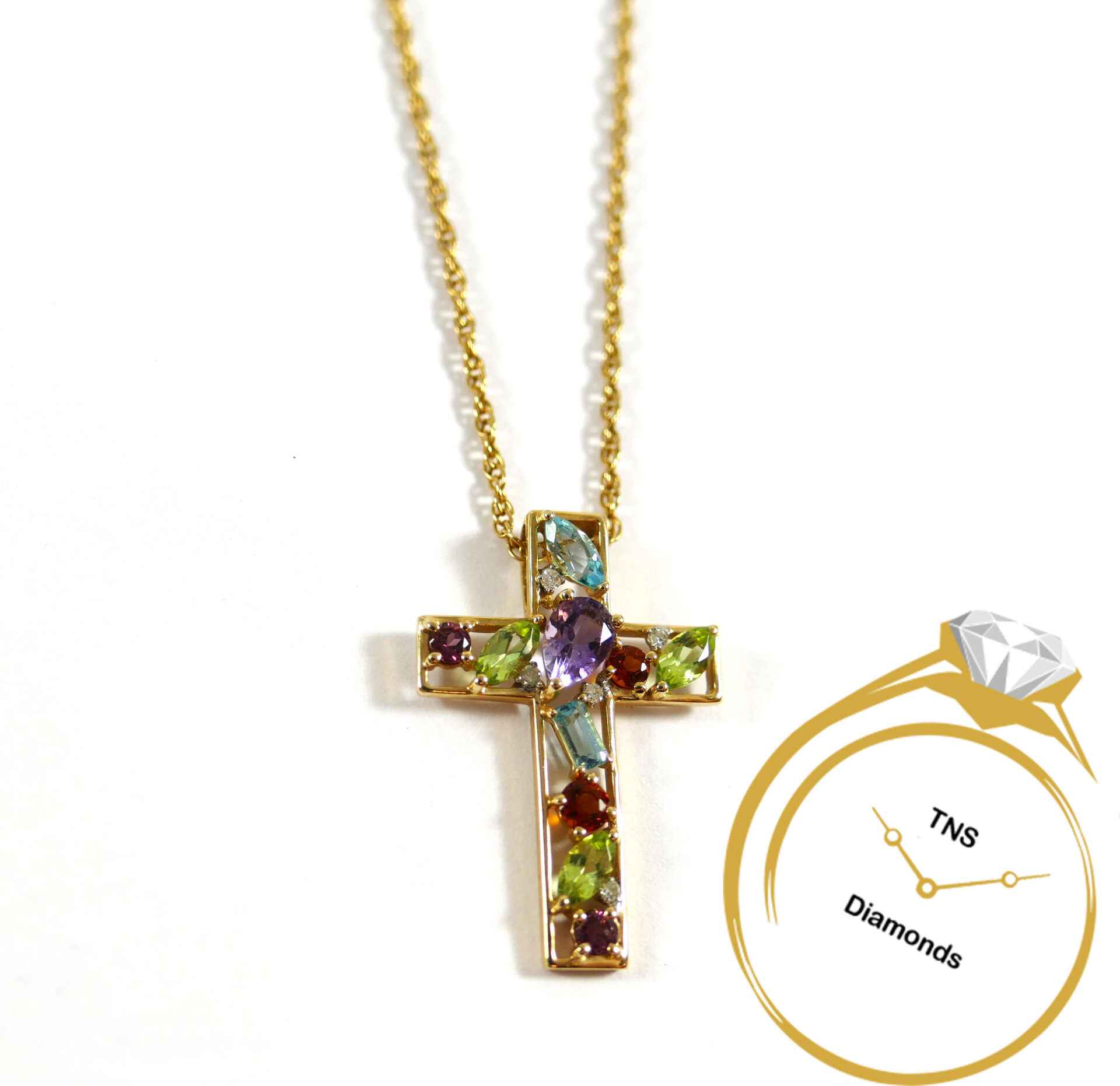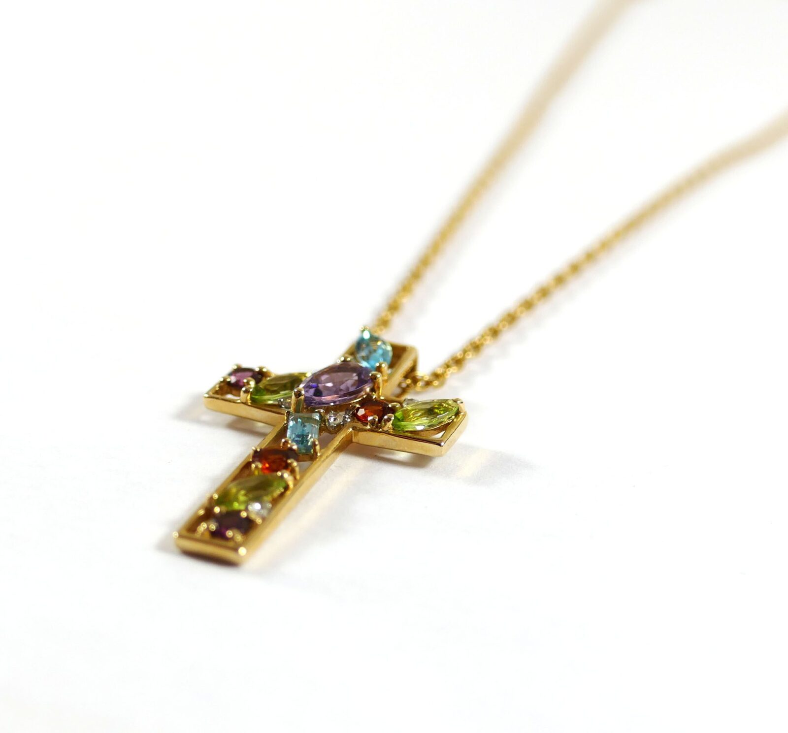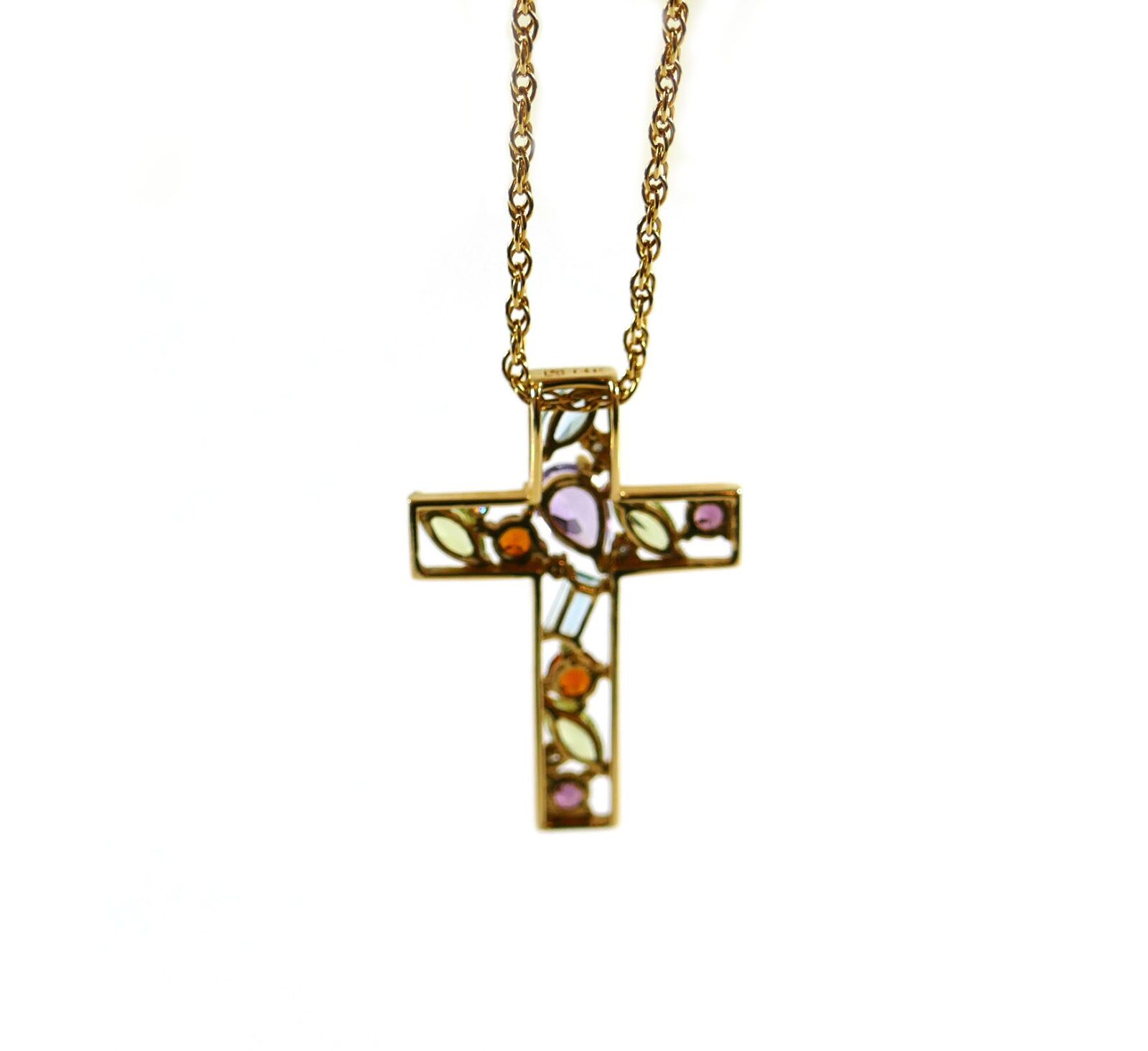 this is an absolutely beautiful 14k yellow gold cross with semi-precious stones such as blue topaz, citrine, amethyst, peridot, and rubellite. They almost look like they’re floating, because there’s space in between each one and you are able to see through the pendant in certain spots.