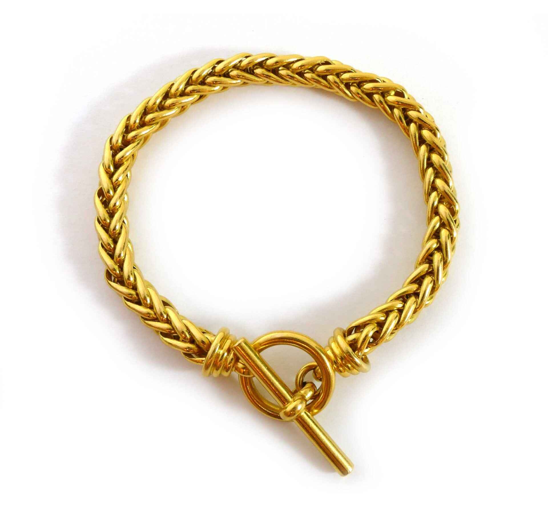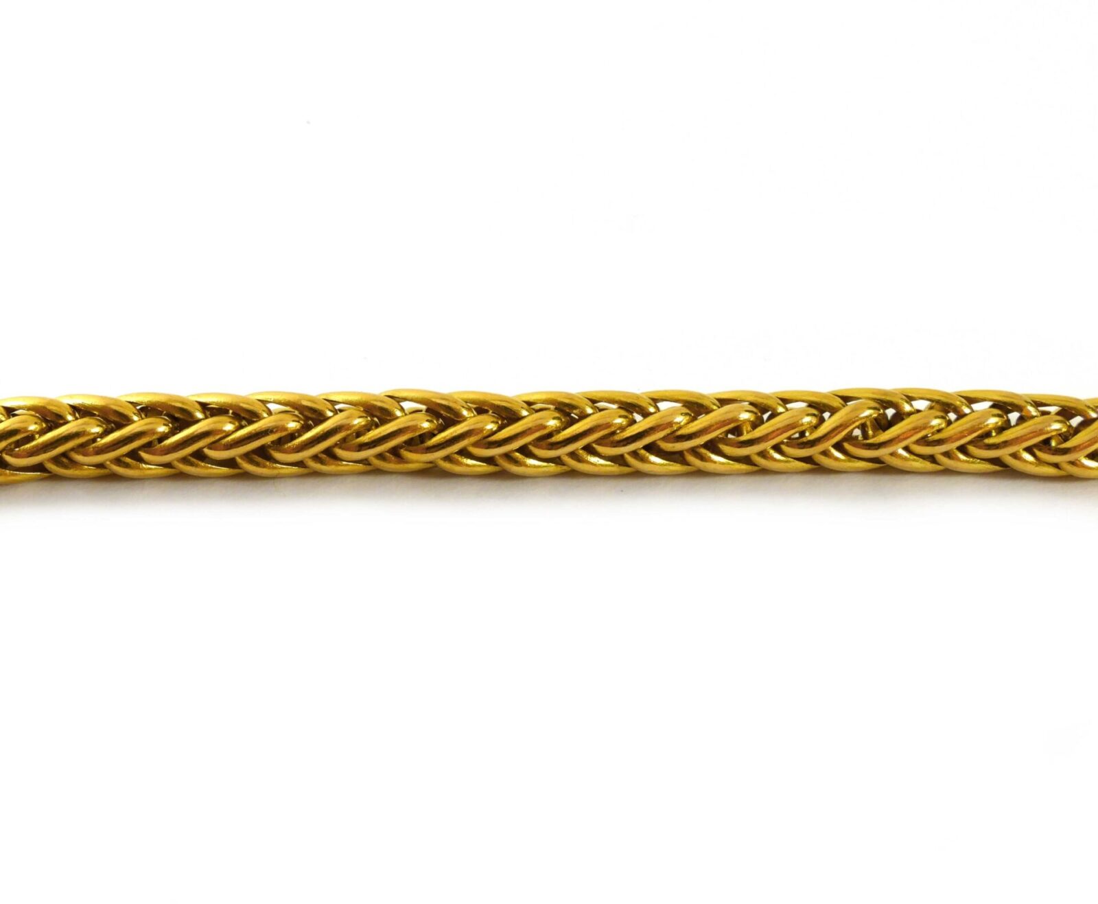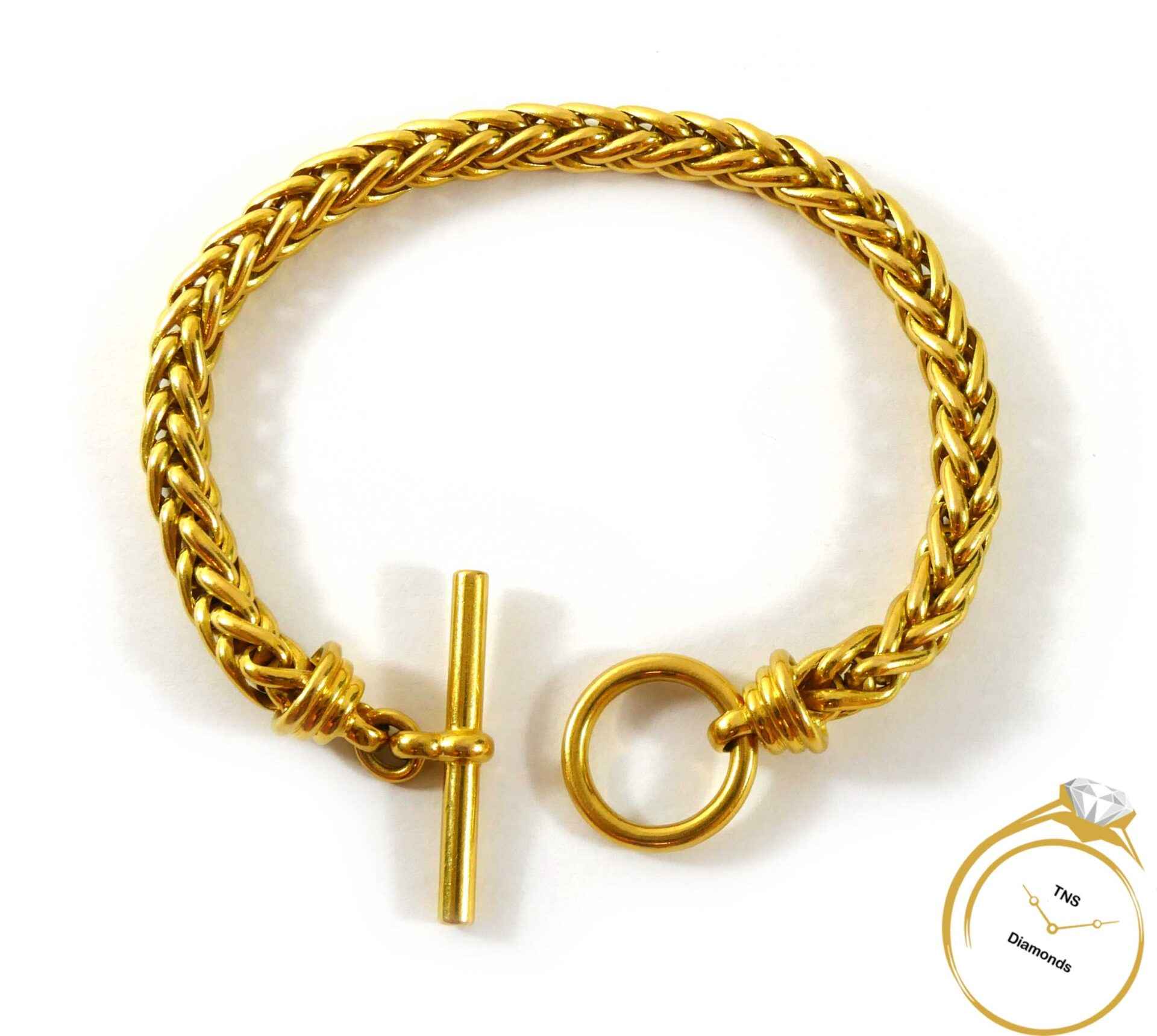 this solid 18k yellow gold franco link chain bracelet is 8.25 inches, and 6mm wide. This bracelet weighs 56.2 grams, and has a toggle clasp to ensure safety and security on the neck.