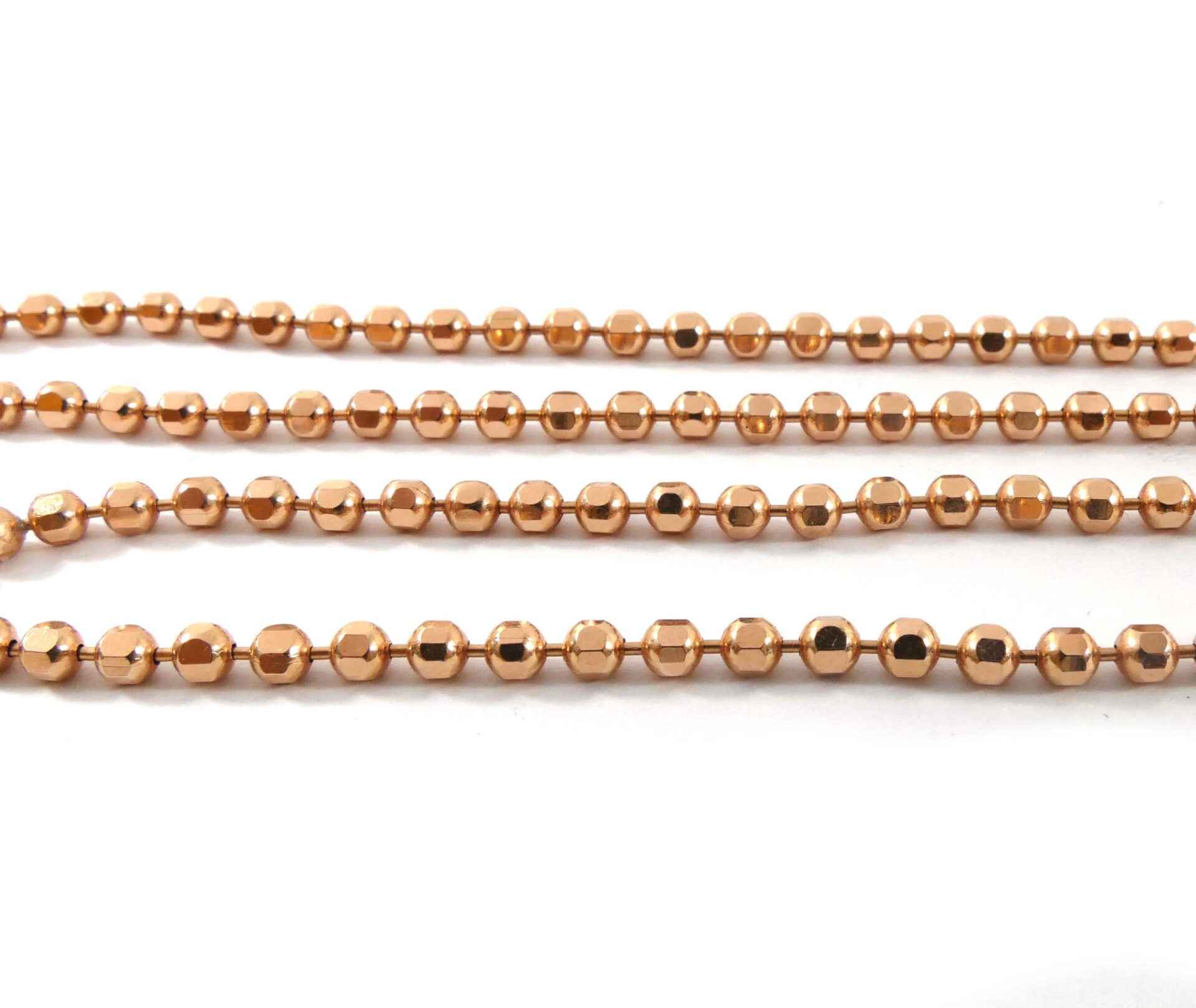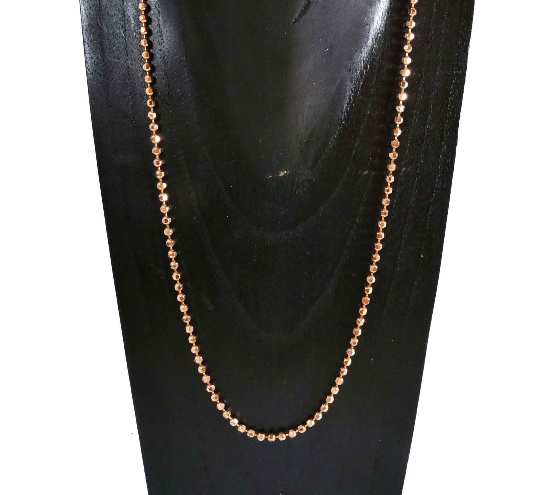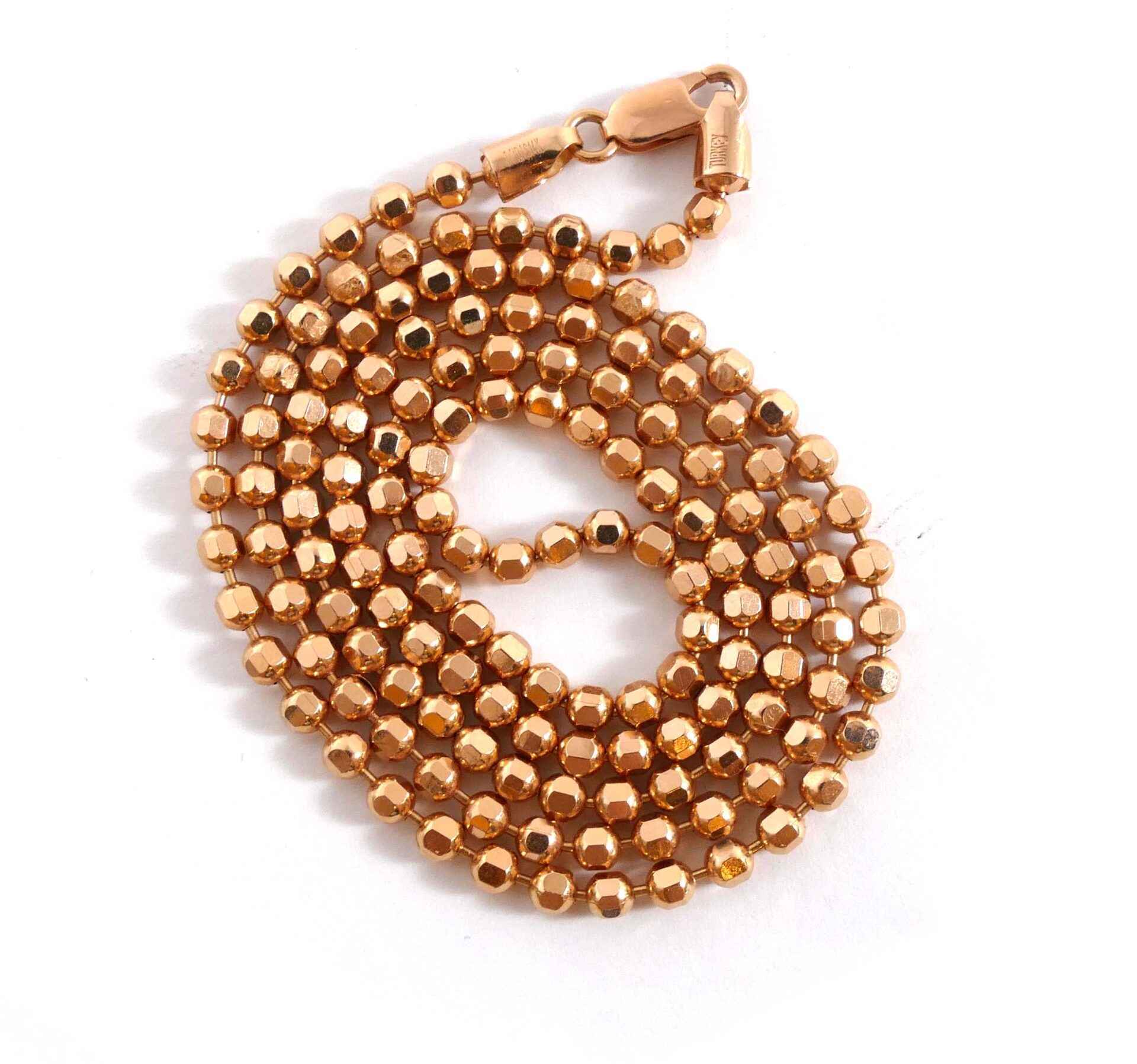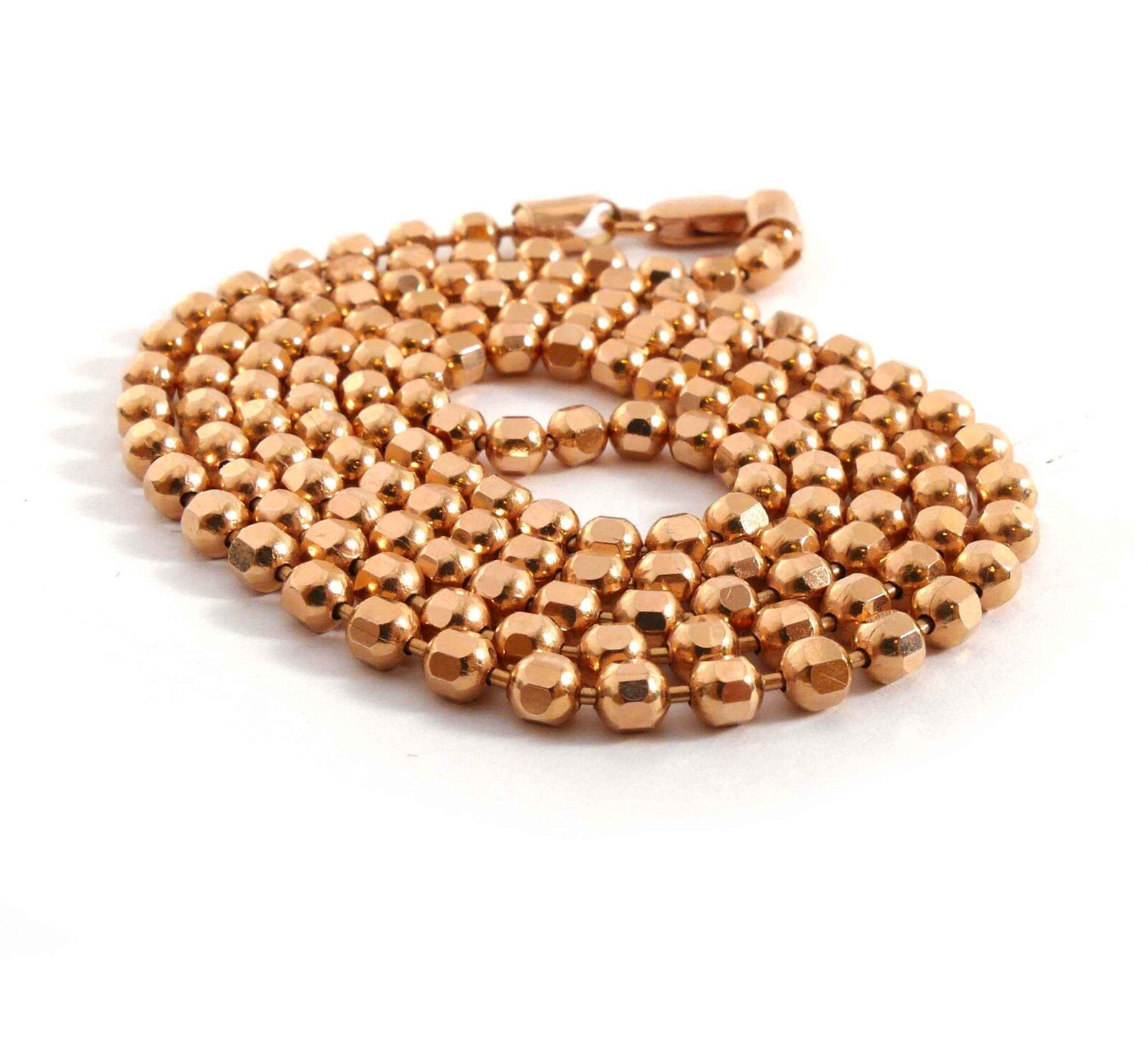 Read Morethis is a solid 14k rose gold ball/bead chain, made in turkey. It is 26 inches long, 3.5mm wide and weighs 27 grams.