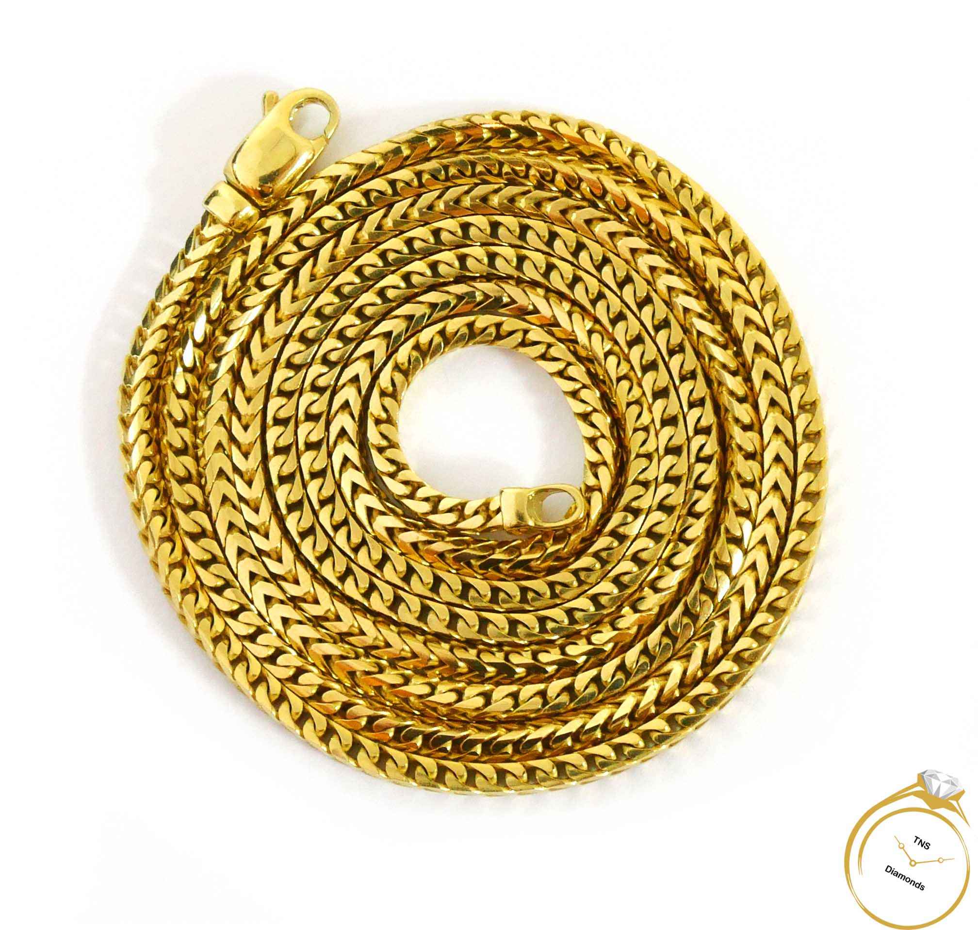 Product Description: Franco chains are a staple look that is suitable for any gender and style. This solid 10k yellow gold rope chain is 30 inches long, 2.2mm wide and weighs a total of 23.45 grams.