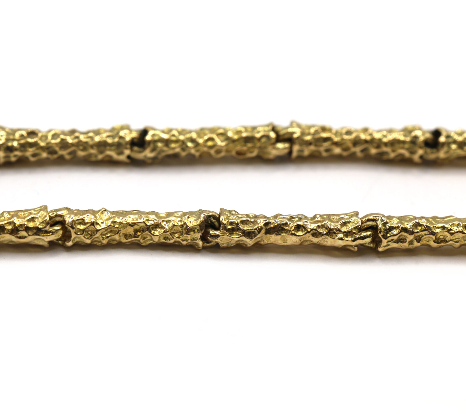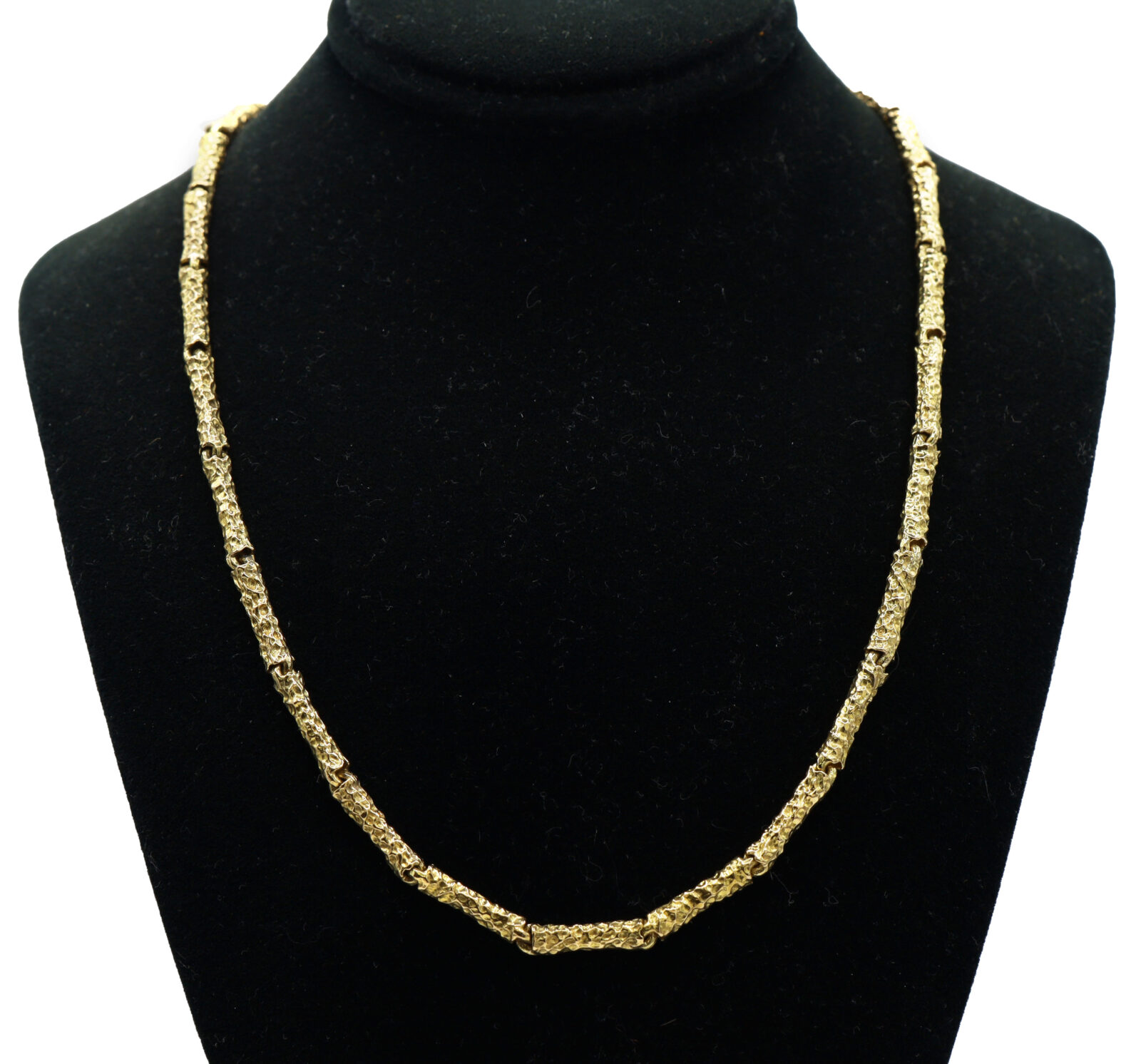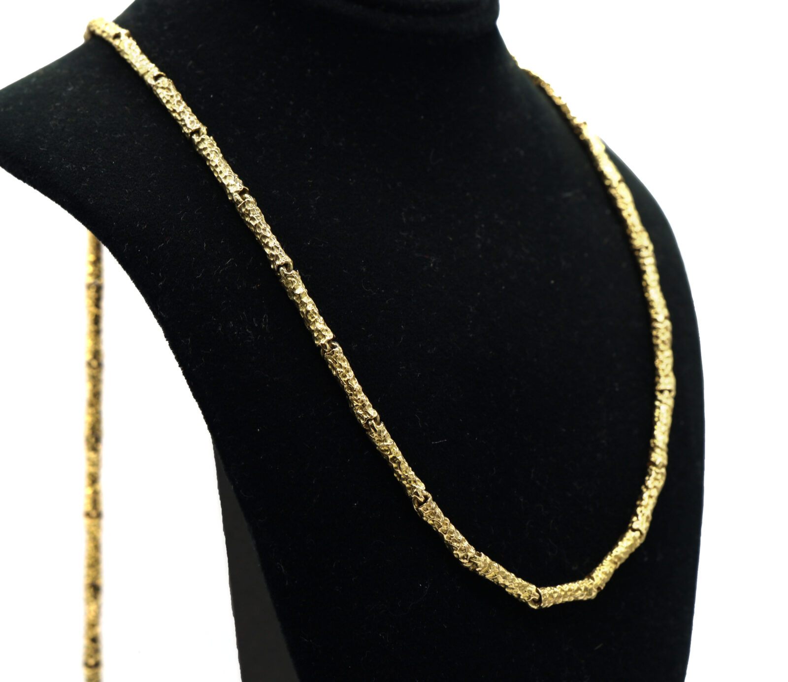 Material: 18k Yellow Gold Type: Solid Nugget Textured Link Length: 28 Inches Width: 4mm Weight: 67.4 Grams