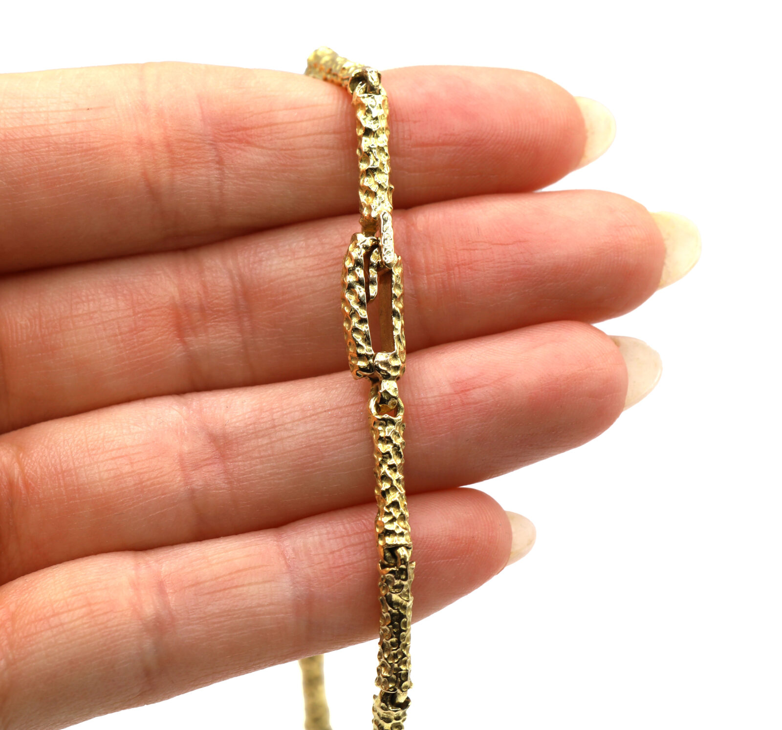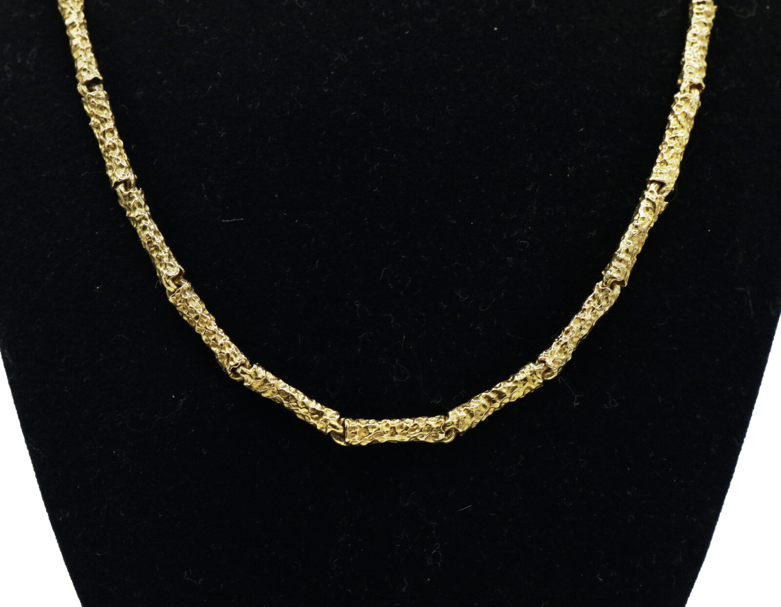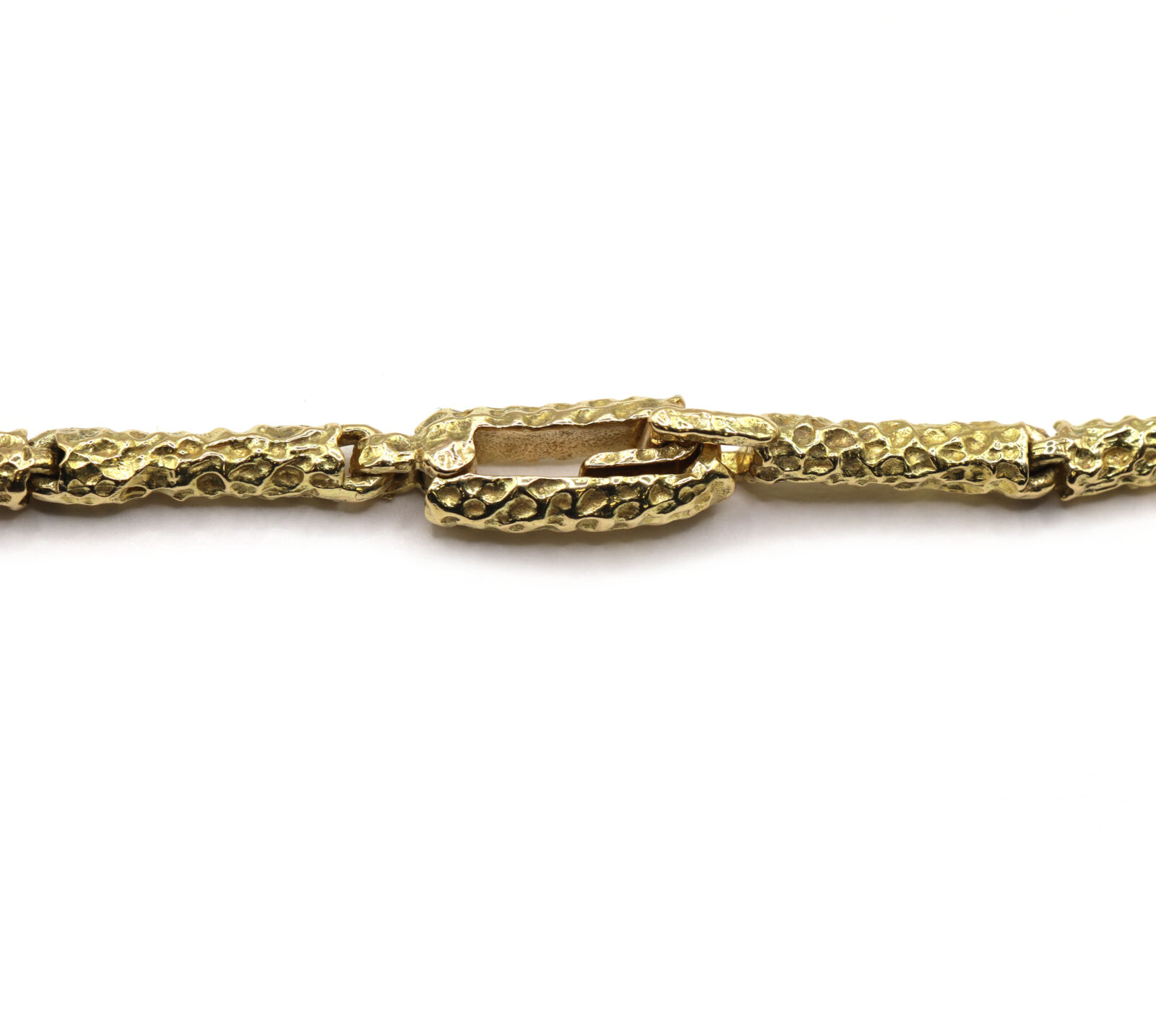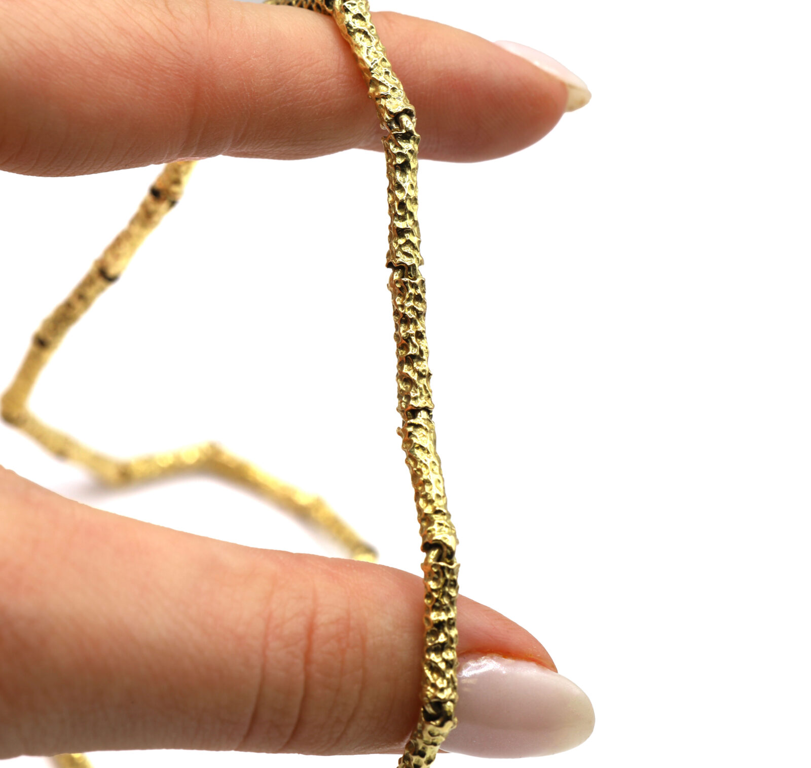 Material: 18k Yellow Gold Type: Solid Nugget Textured Link Length: 28 Inches Width: 4mm Weight: 67.4 Grams