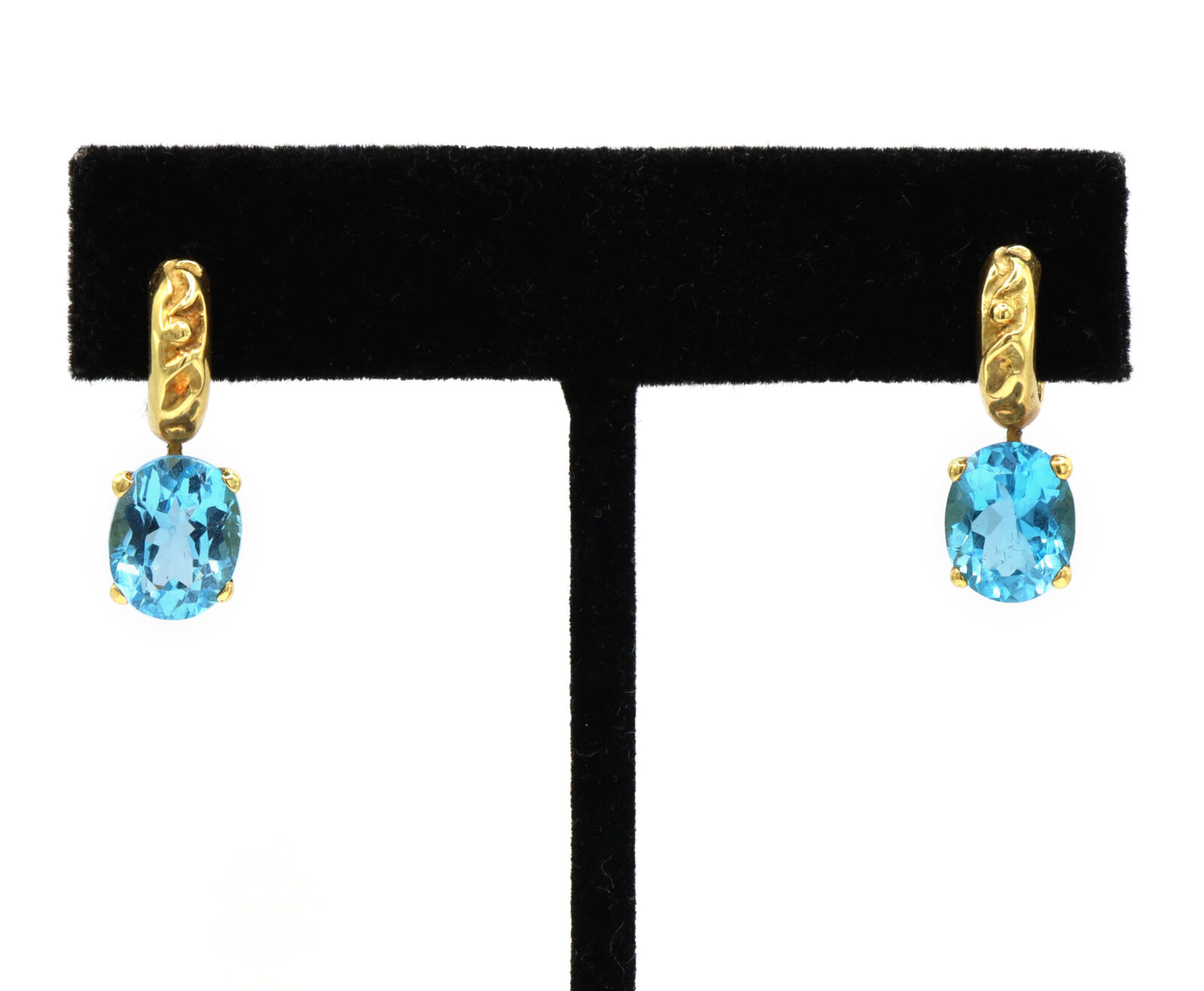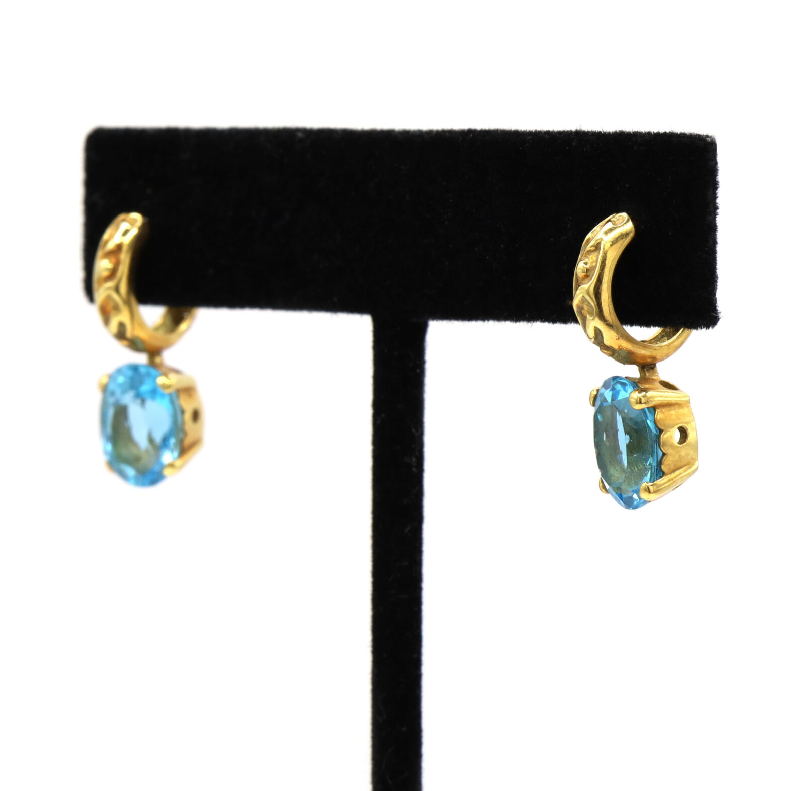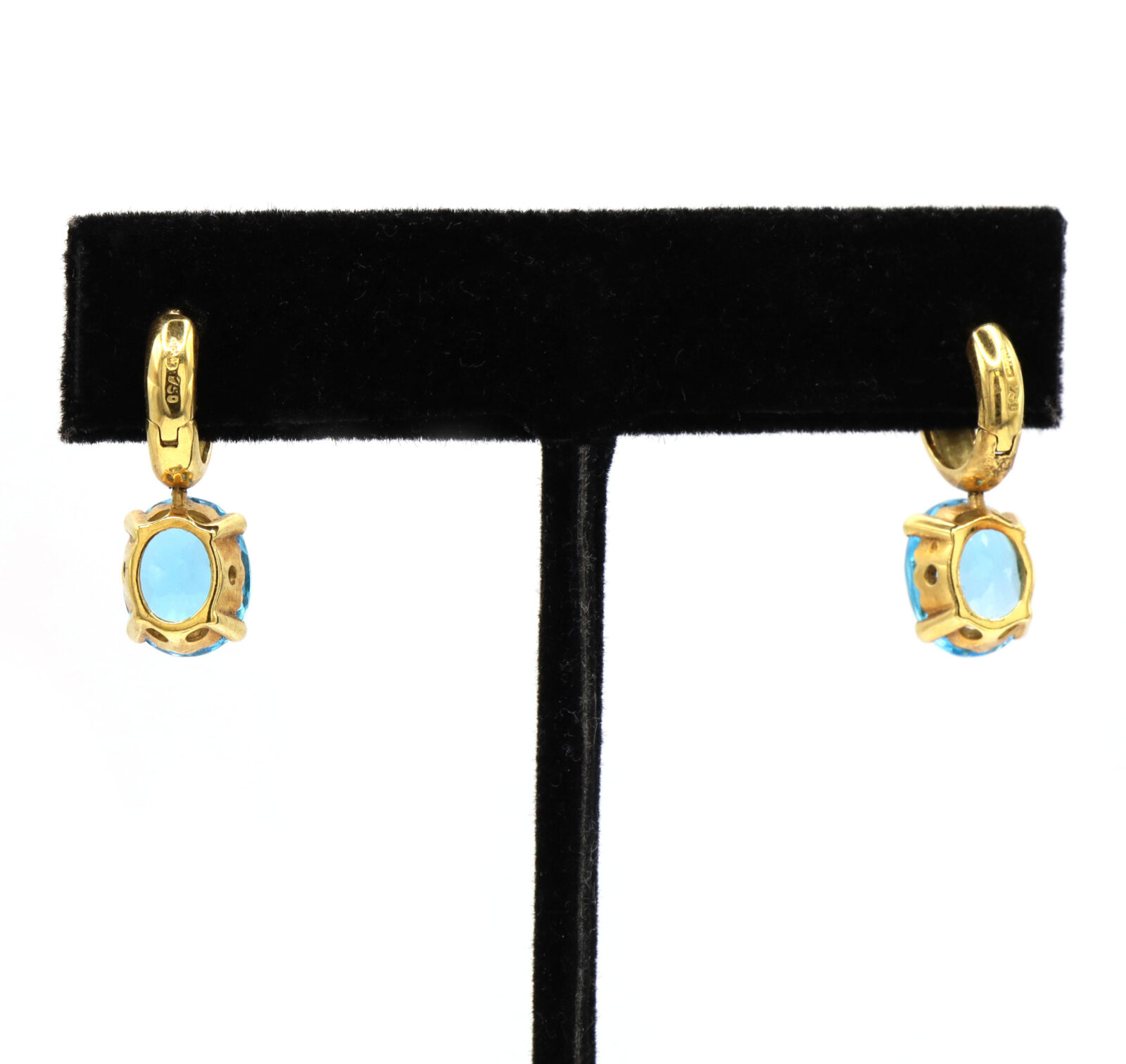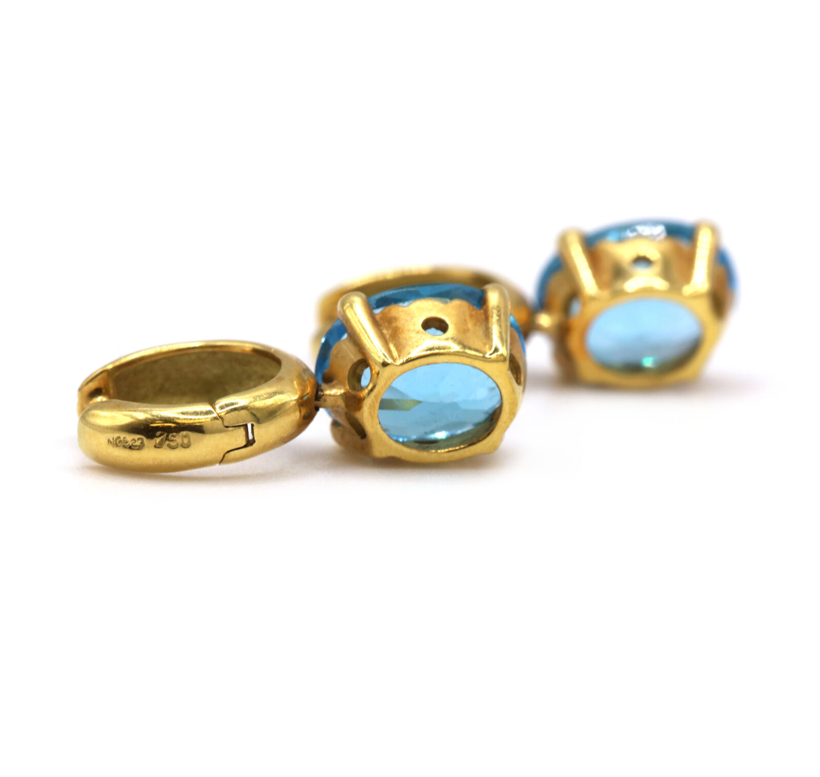 Material: 18k Yellow Gold Gemstone: Blue Topaz Cut: Oval Color: Swiss Blue Earring Measurements: 22 x 8 mm Weight: 6 Grams