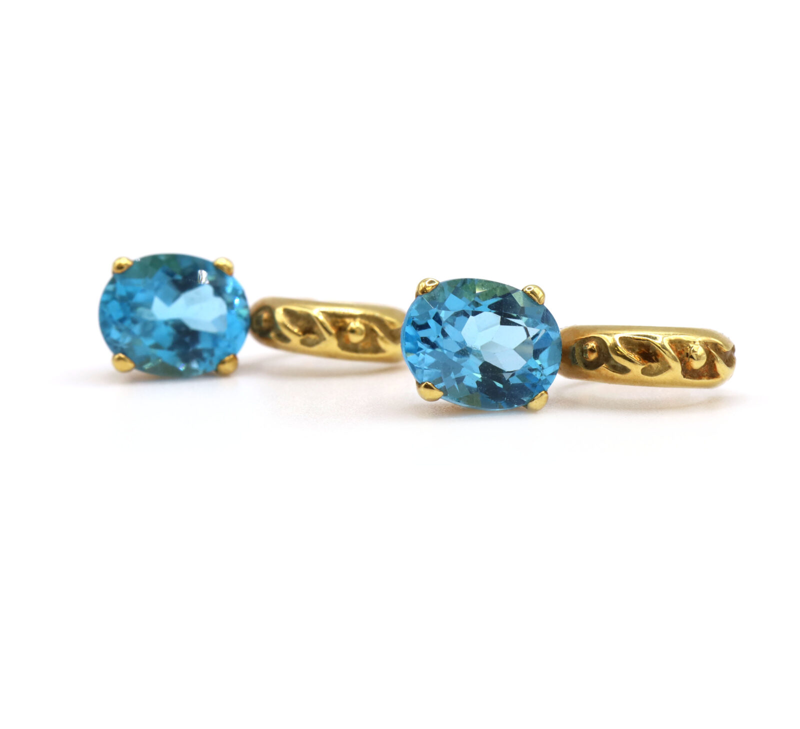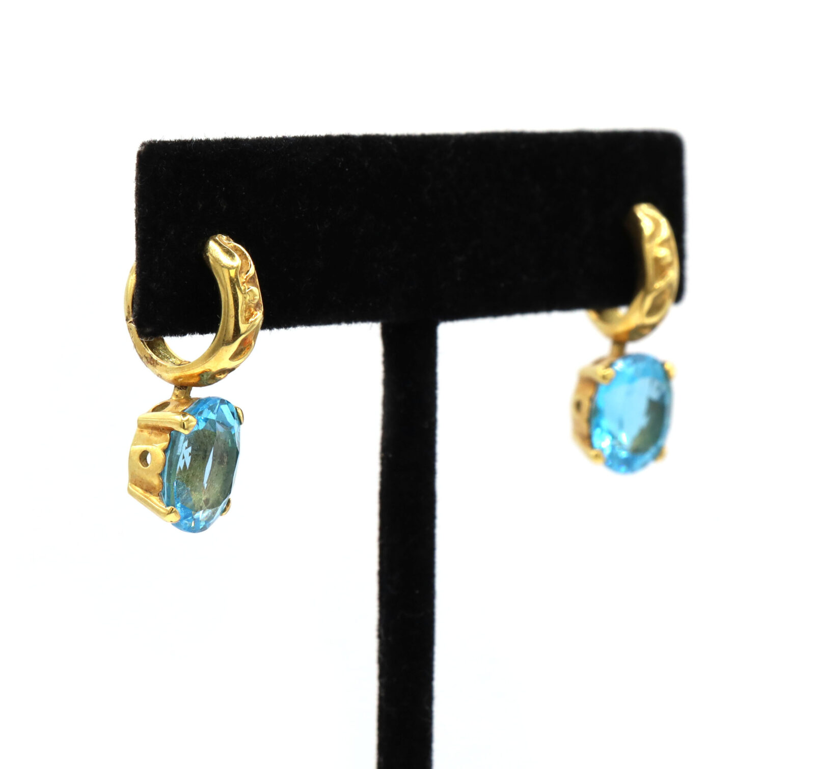 Swiss Blue Oval Topaz 18K Yellow Gold Dangle Huggie Women’s Earrings