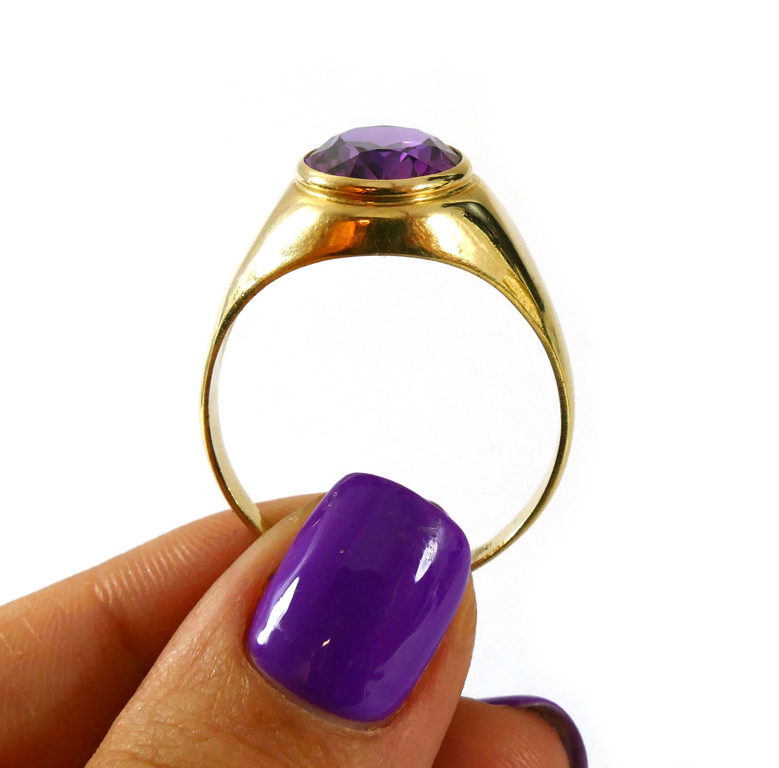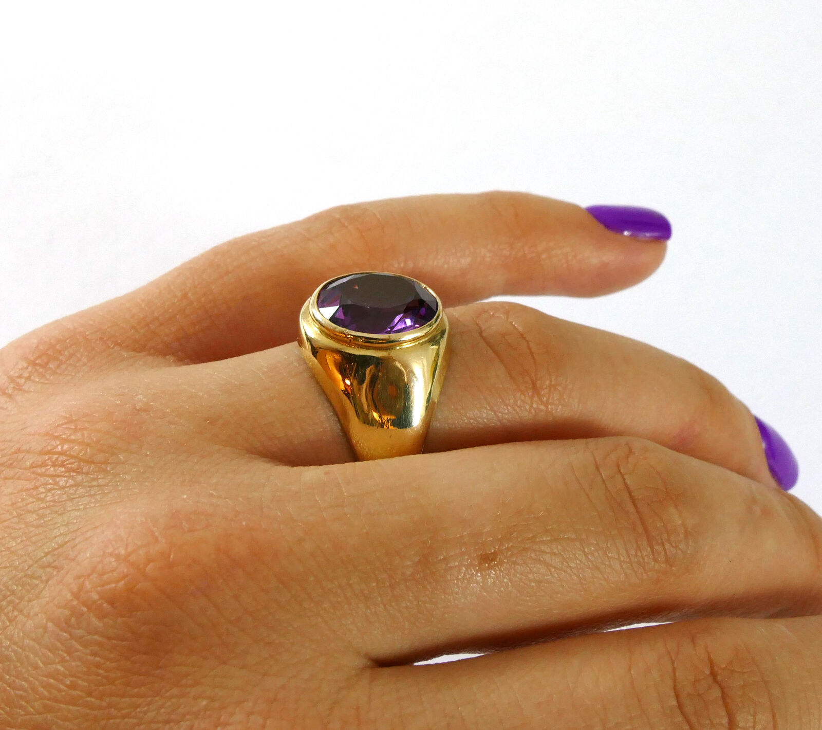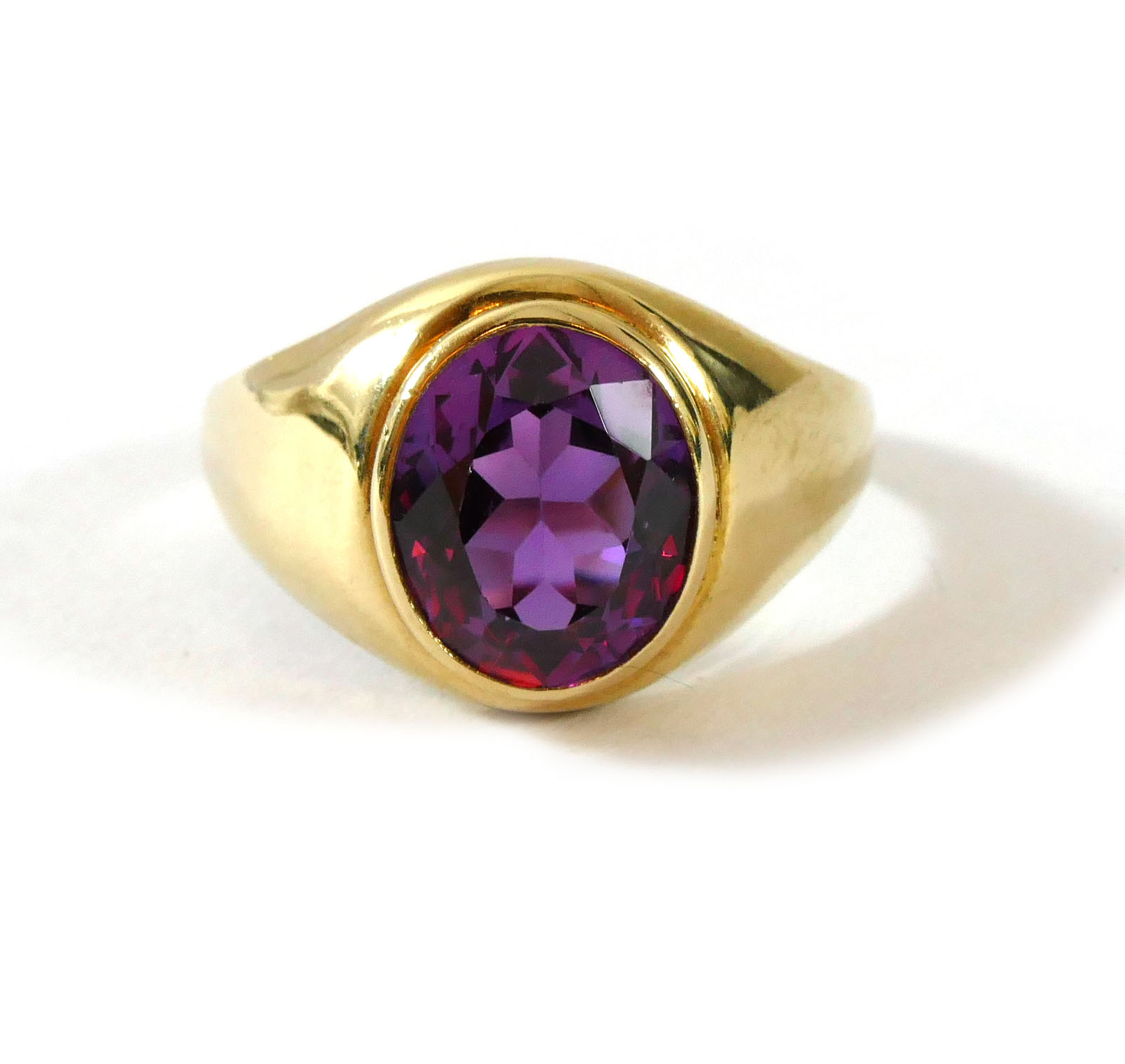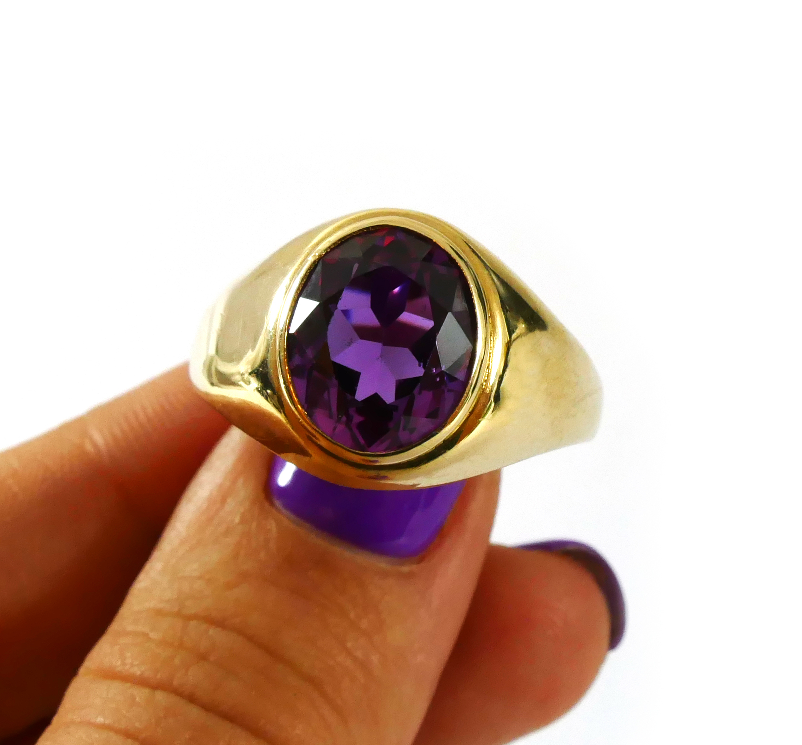 product description: this ring is a beautiful and bold look; a solid 10k yellow gold ring set with an oval synthetic sapphire right as the centerpiece. This synthetic sapphire is a bold and bright purple color, with hues of red. This is a unisex ring, and can fit any personal style. Size: 10 material: 10k yellow gold gemstone: synthetic sapphire weight: 4.3 grams width of band: 3mm
