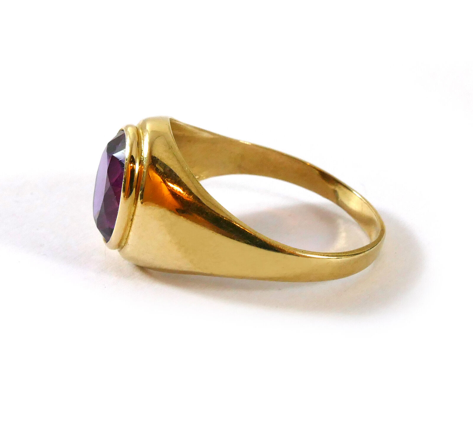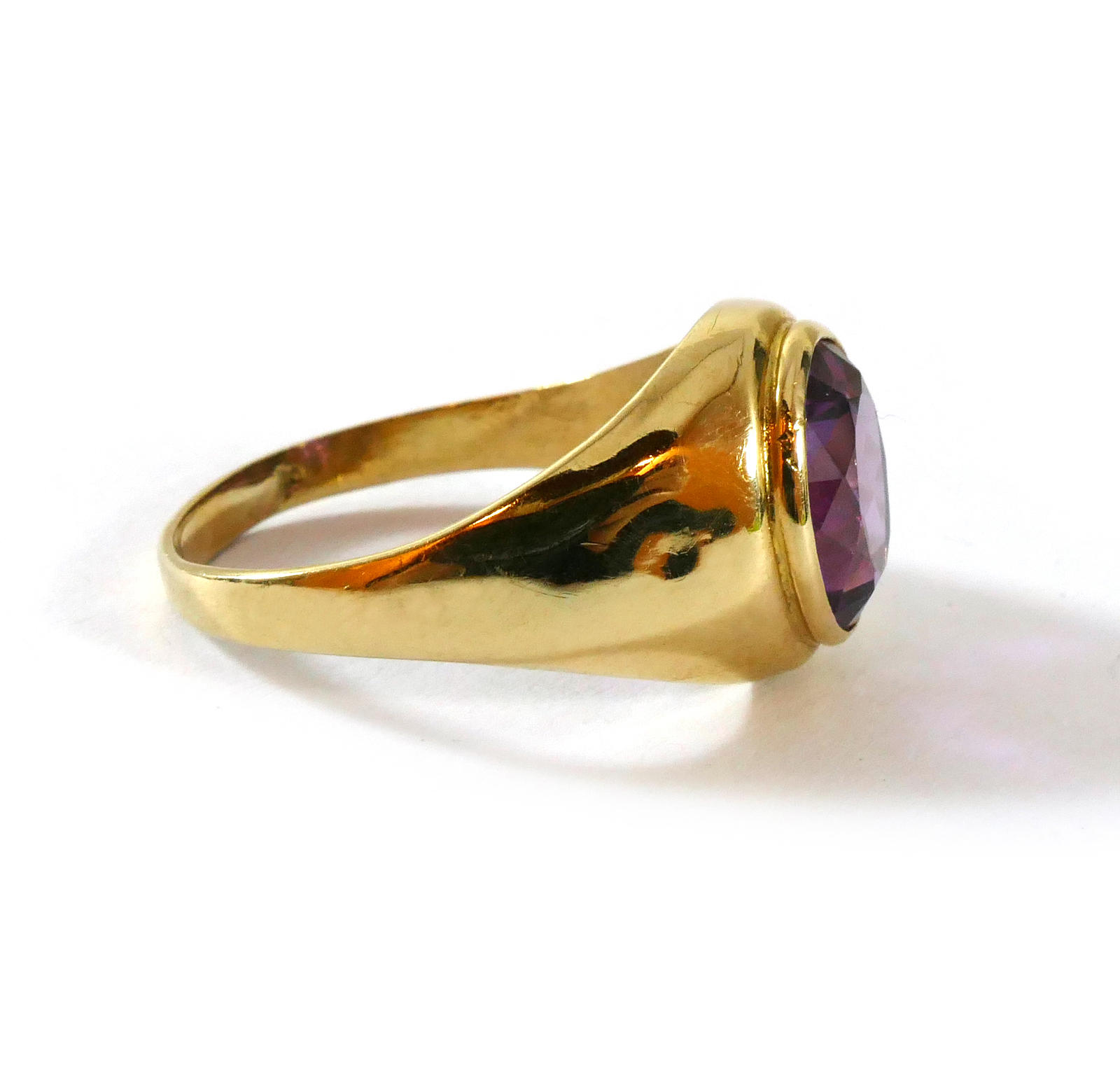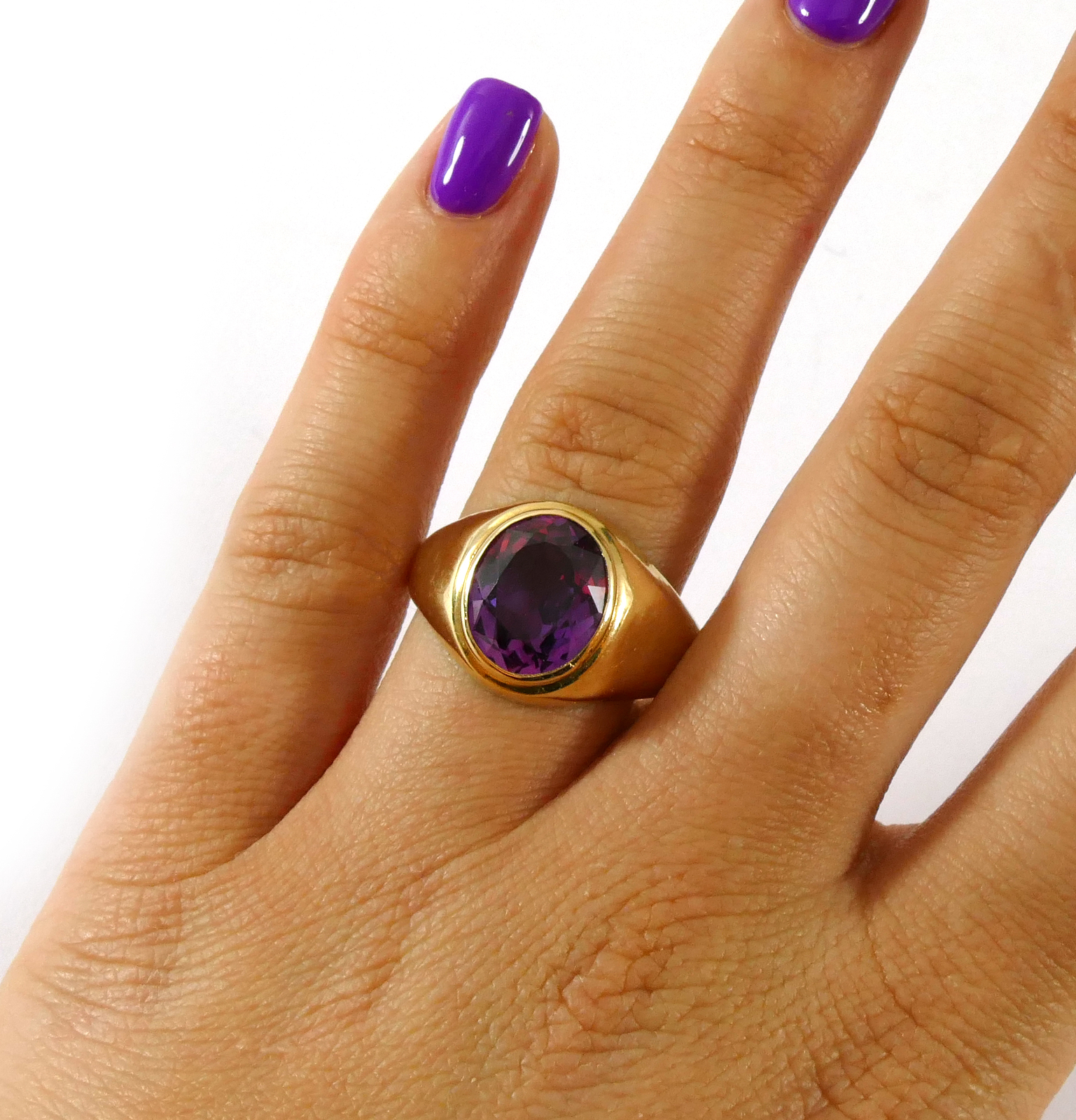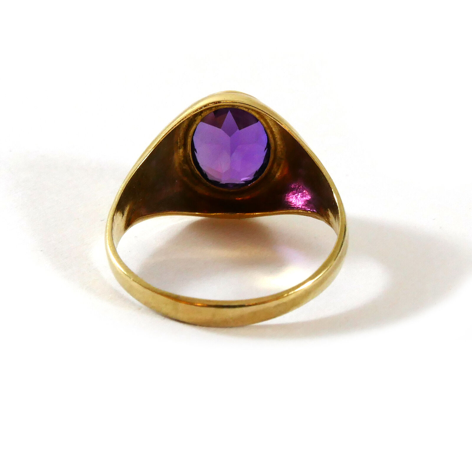 product description: this ring is a beautiful and bold look; a solid 10k yellow gold ring set with an oval synthetic sapphire right as the centerpiece. This synthetic sapphire is a bold and bright purple color, with hues of red. This is a unisex ring, and can fit any personal style. Size: 10 material: 10k yellow gold gemstone: synthetic sapphire weight: 4.3 grams width of band: 3mm