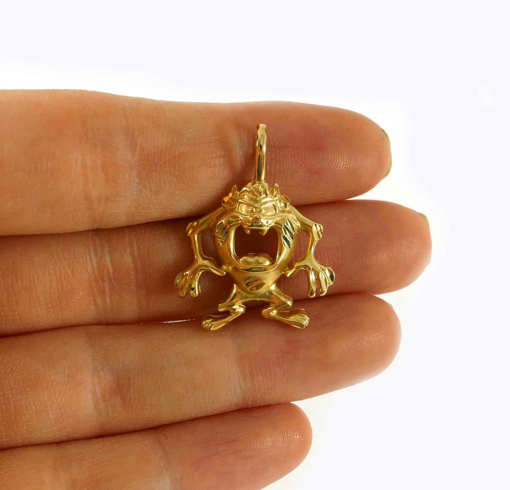 Product Description: This pendant is the Tasmanian Devil character from Looney Toons named Taz, and he's crafted and detailed in 14k yellow gold. This pendant is a blast from the past, and perfect for any lovers...