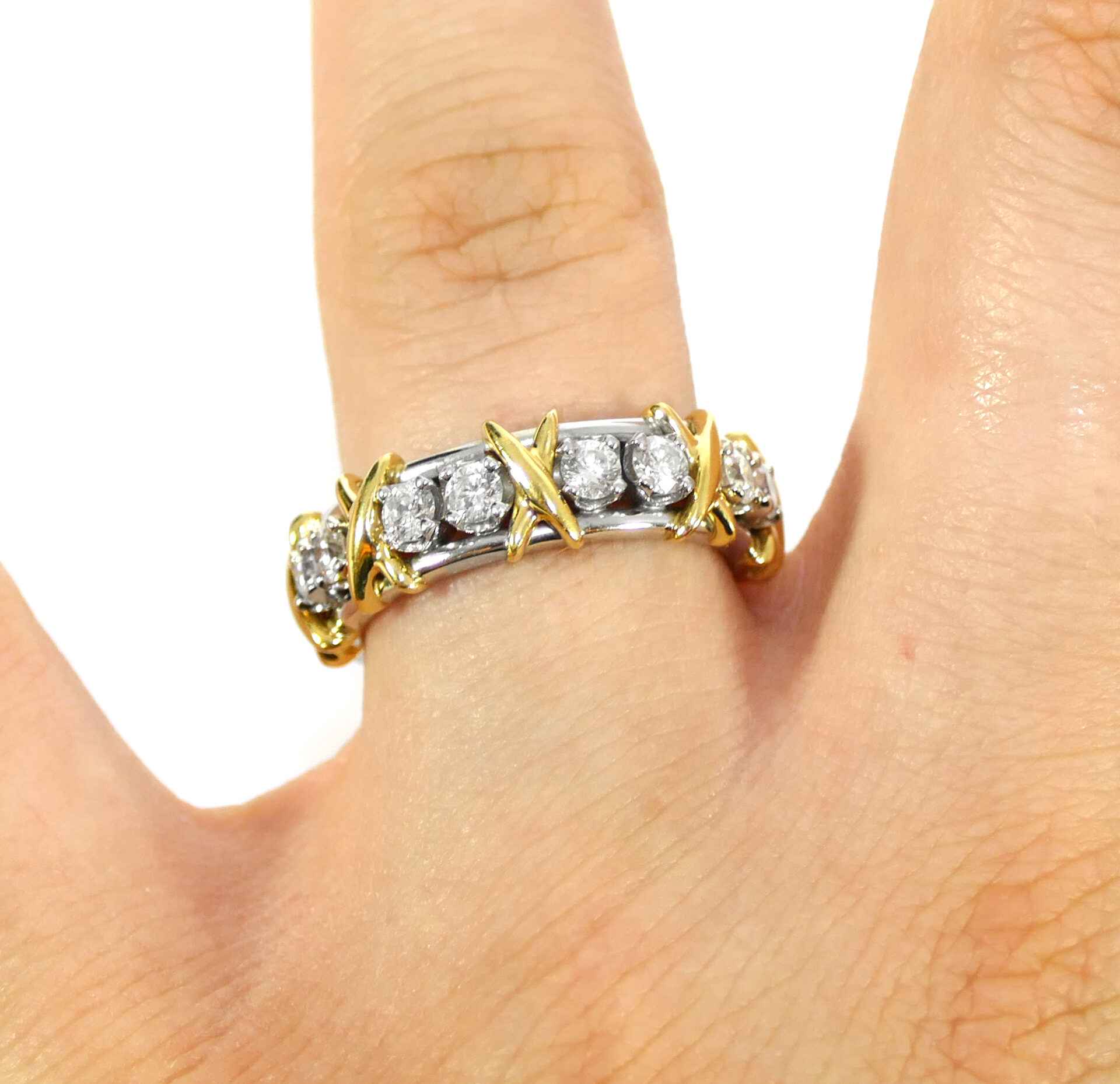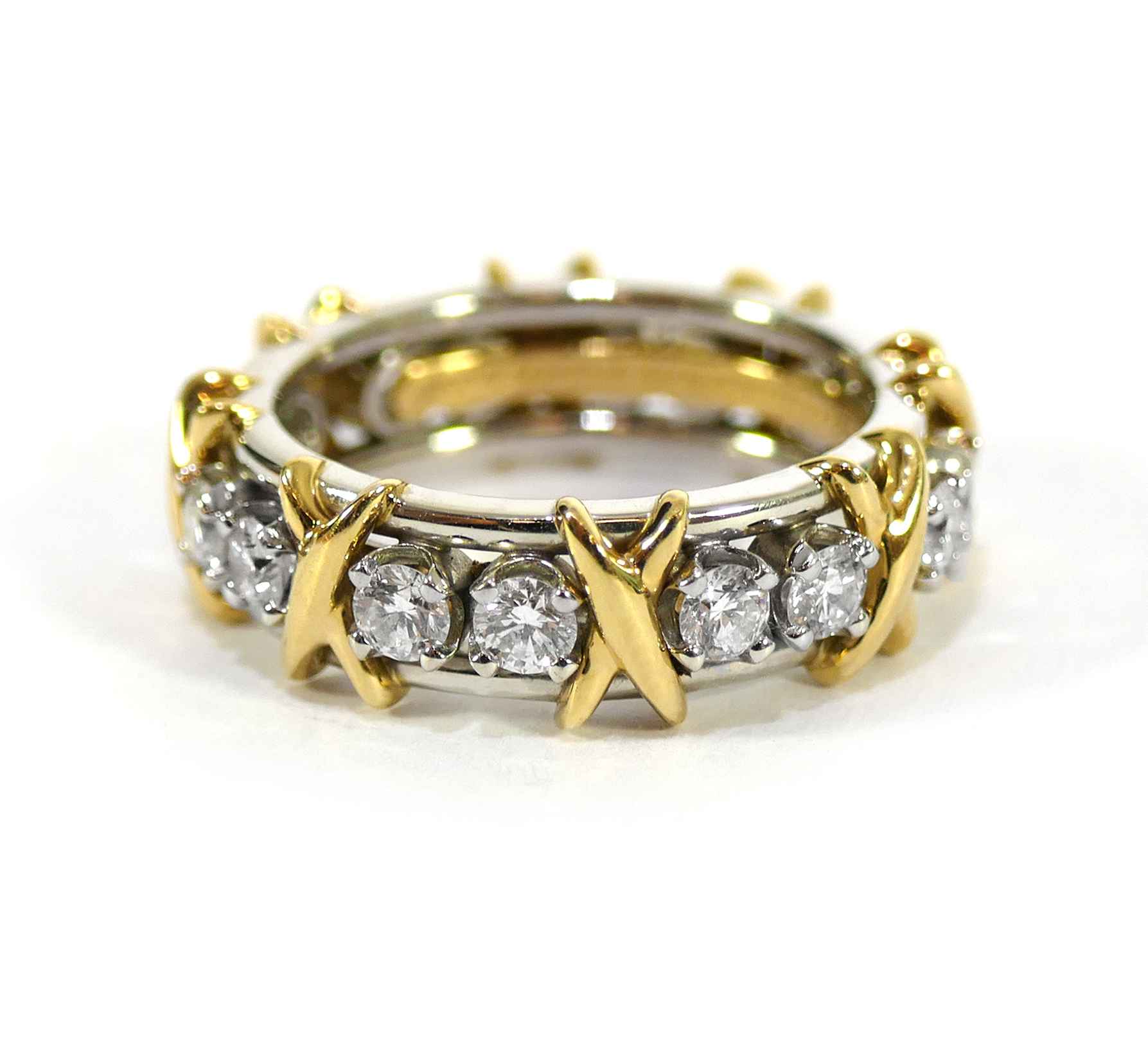 Product Description: This Tiffany & Co Schlumberger eternity ring holds 18 stones of diamonds, set into 18k yellow gold and platinum. This ring comes with its original Tiffany & Co box and bag. <...