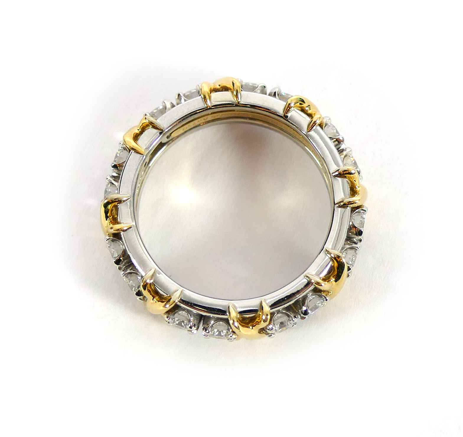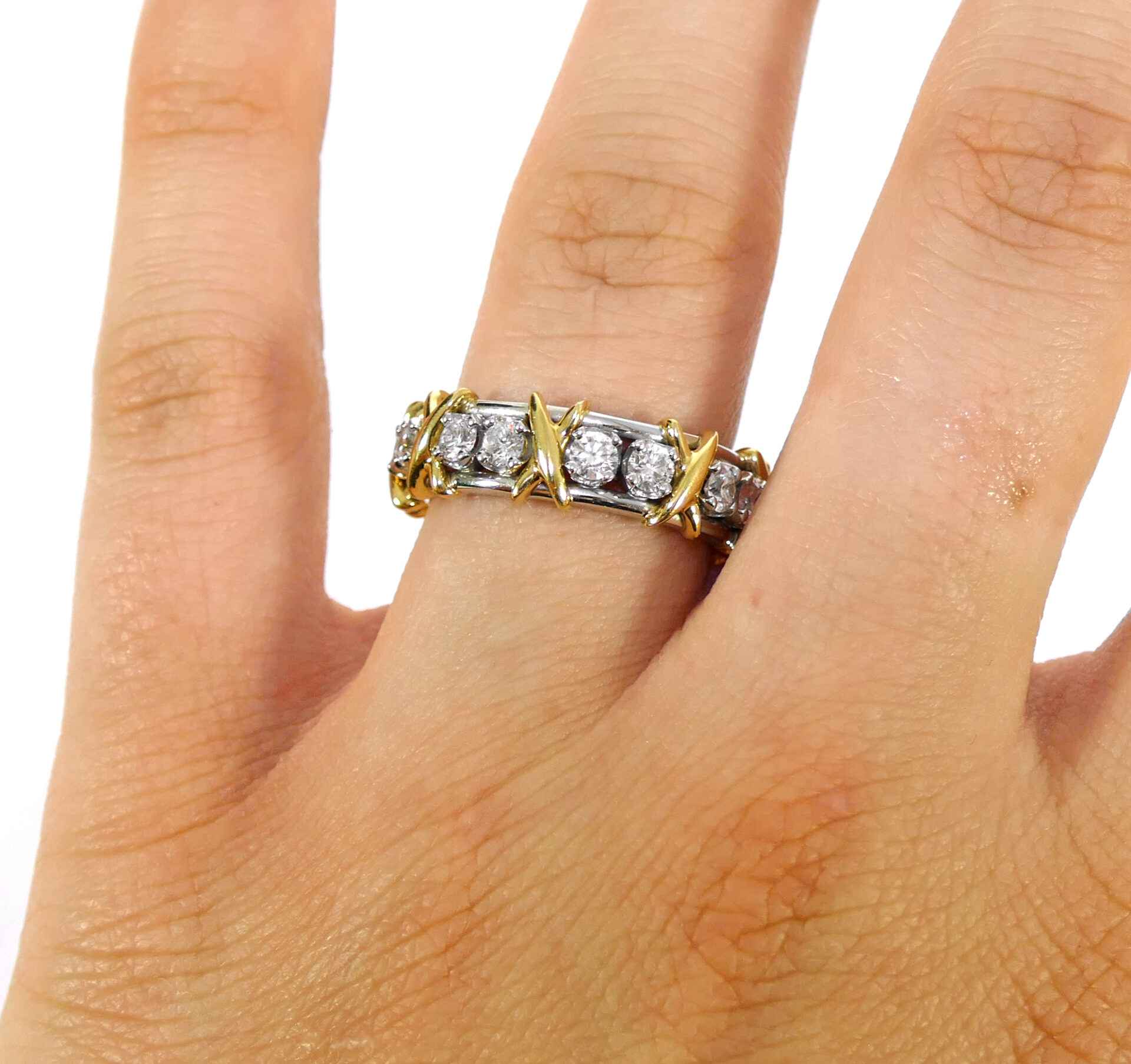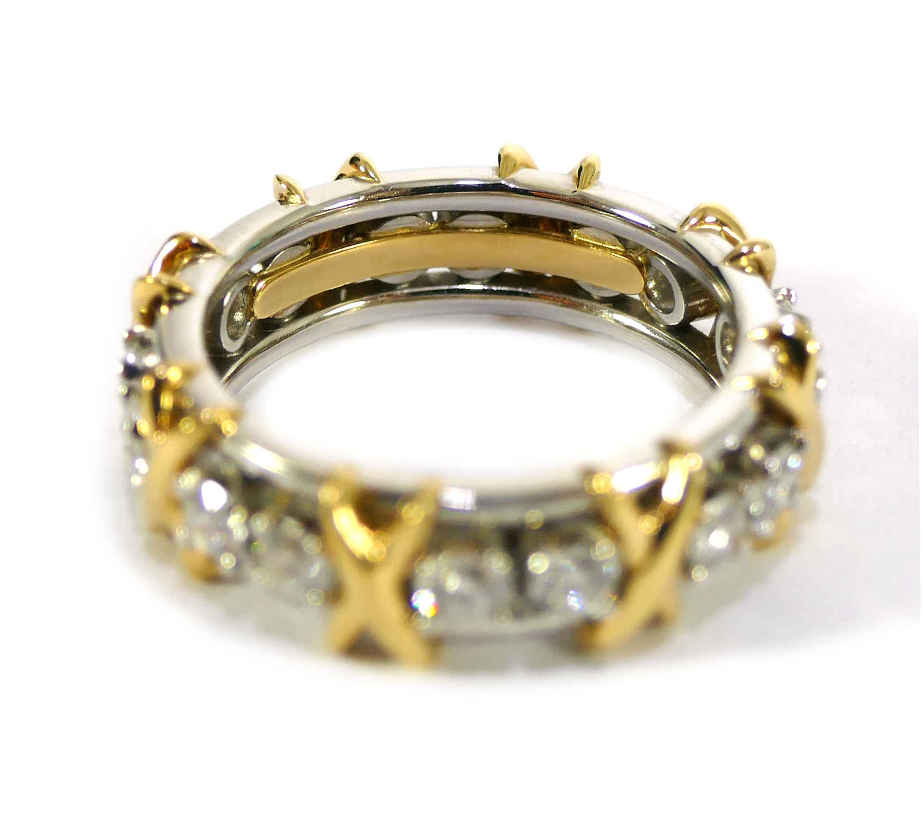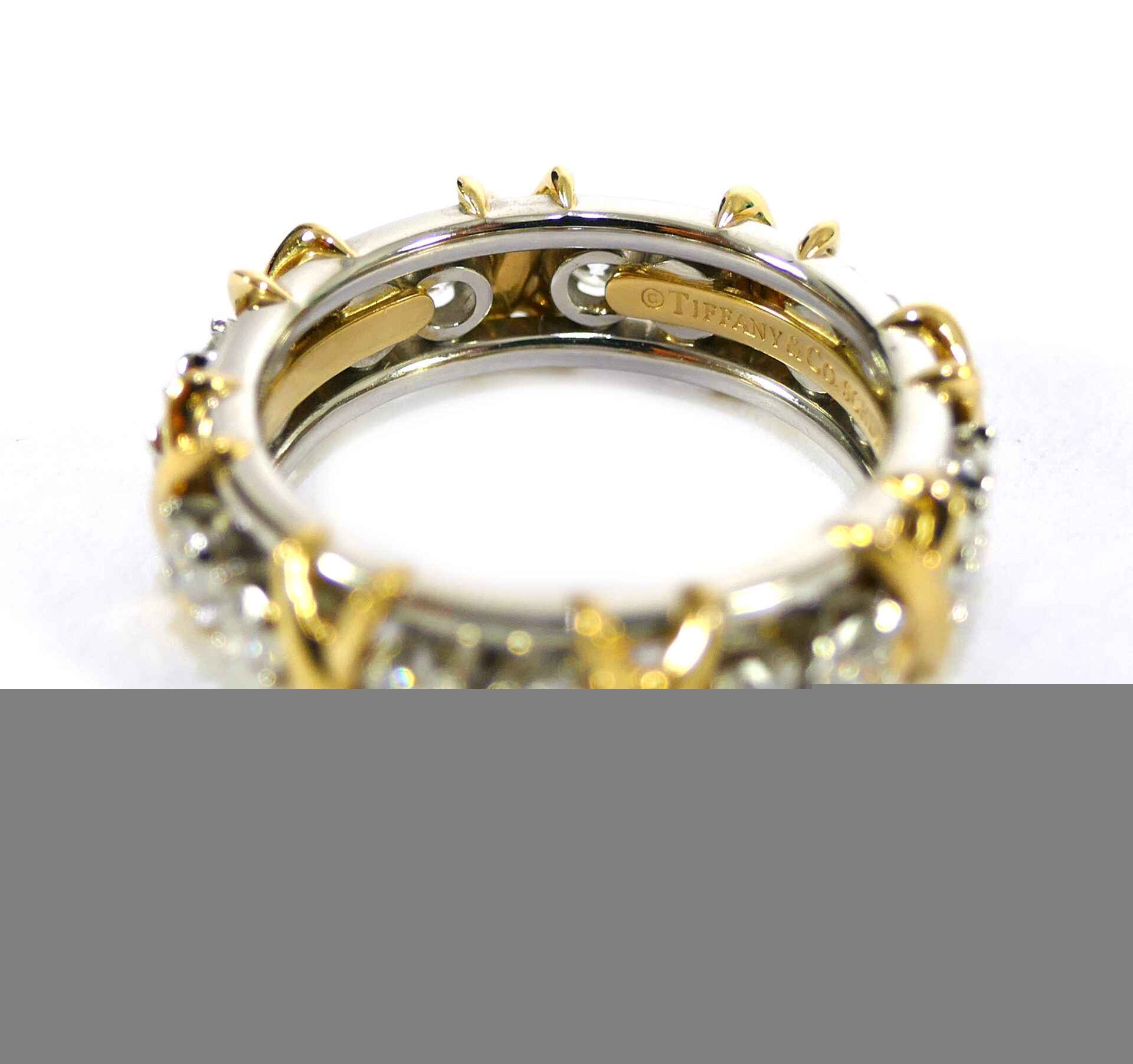 this tiffany & co schlumberger eternity ring holds 18 stones of diamonds, set into 18k yellow gold and platinum. This ring comes with its original tiffany & co box and bag.