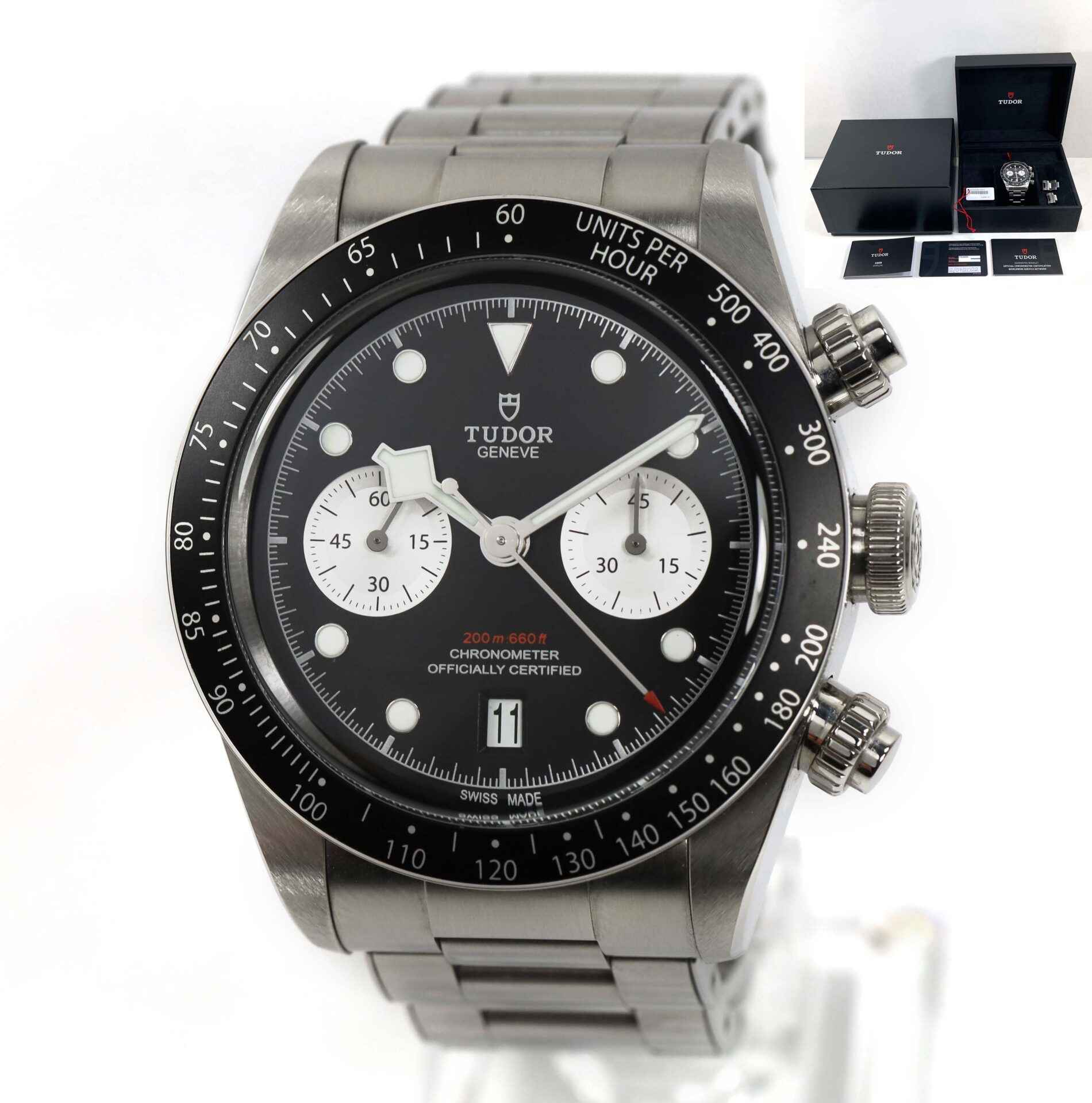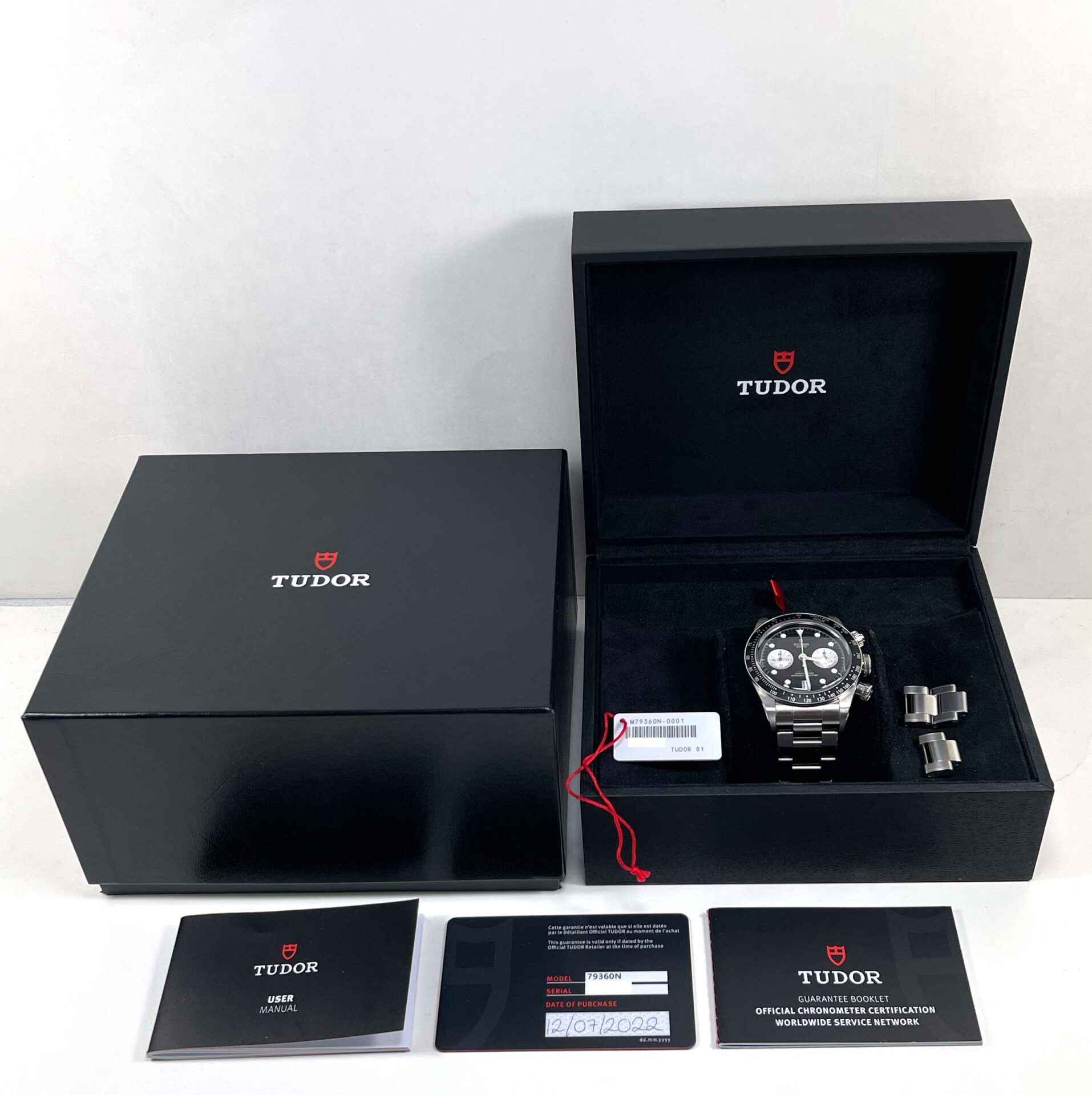 this tudor is in excellent condition and comes with its box, papers, spare links, white hang tag, and warranty card dated july 12th, 2022. This watch is in stock and available to ship immediately!