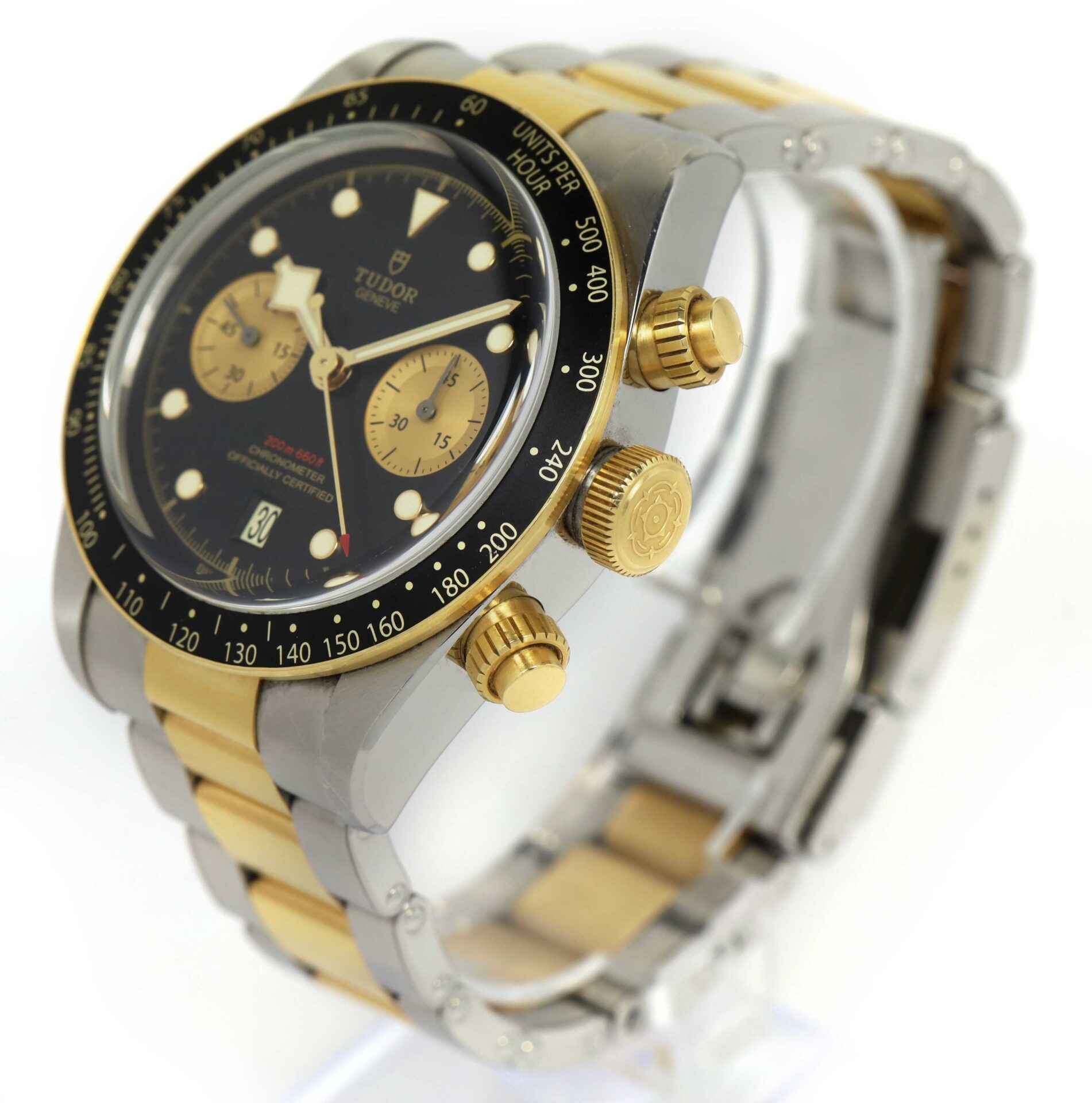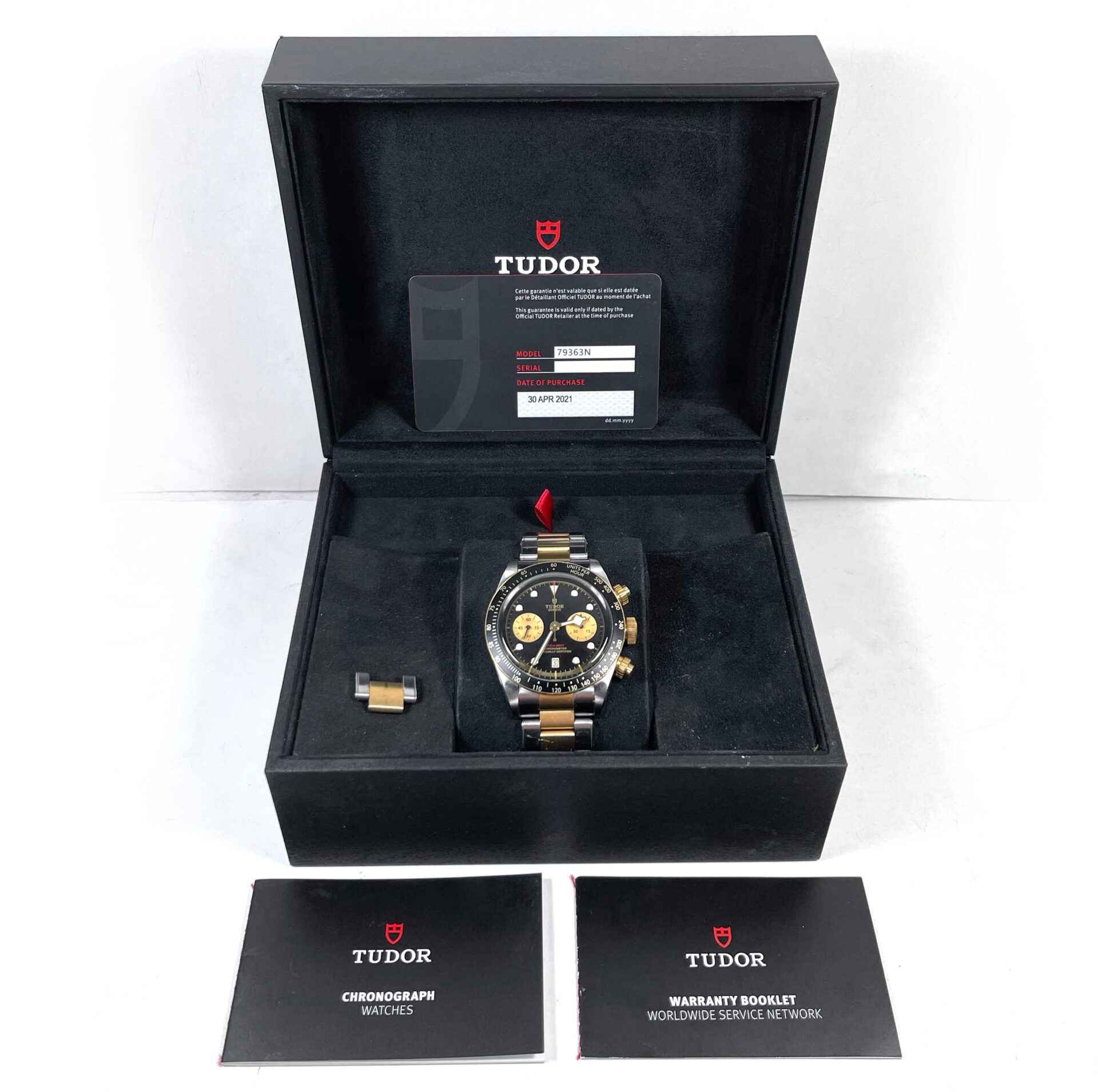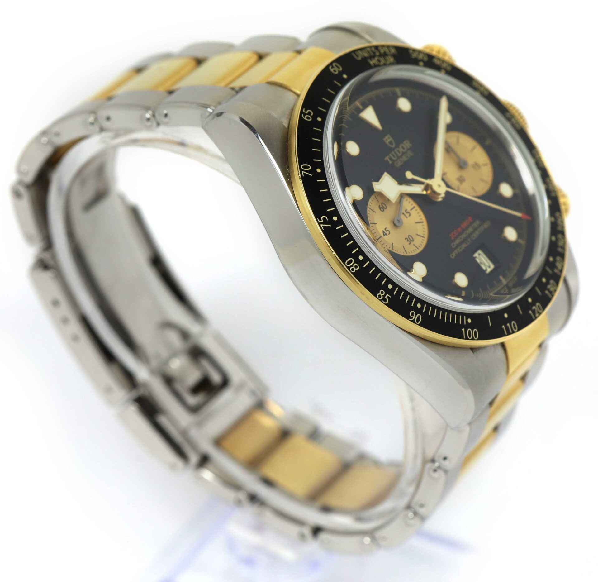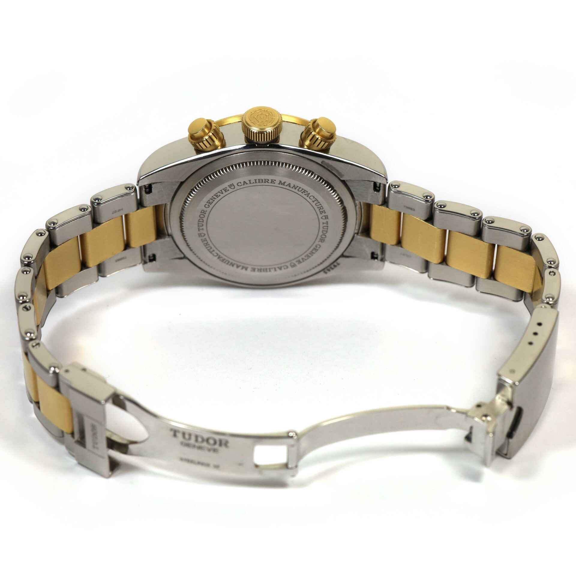 This Tudor Watch is in excellent condition and comes with its inner box, booklets, and warranty card dated April 30th, 2021. This watch features a yellow gold & steel case/bracelet surrounding a black dial with a fix...