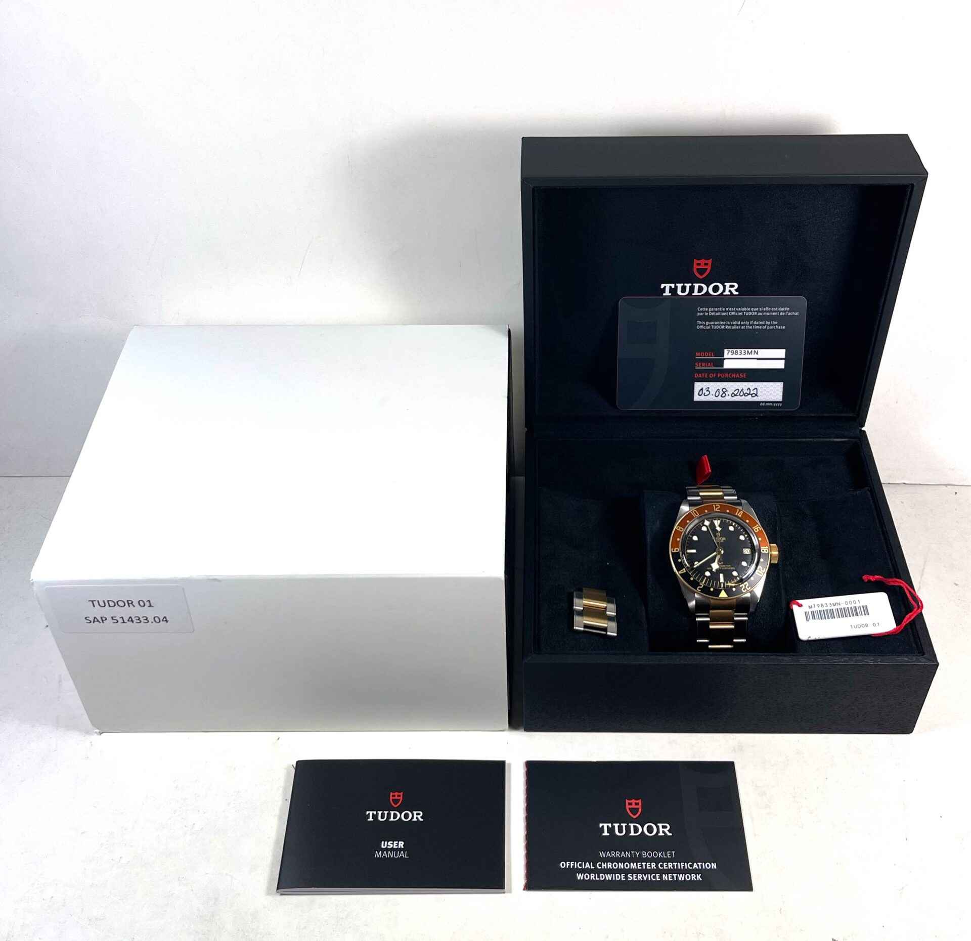 this tudor is in super condition and comes with its box, booklets, hang tag, spare links, and warranty card dated august 3rd, 2022. This watch is in stock and available to ship immediately!