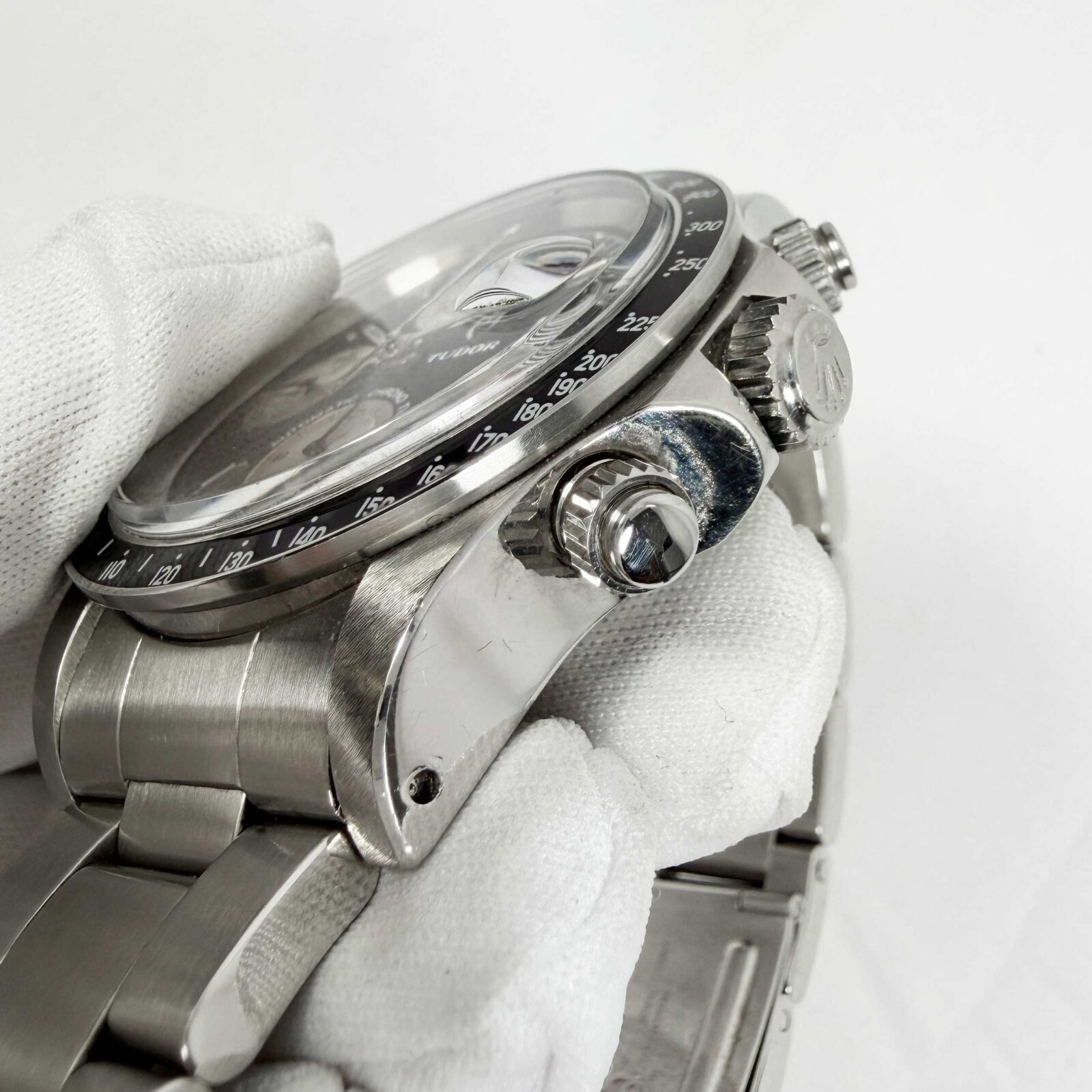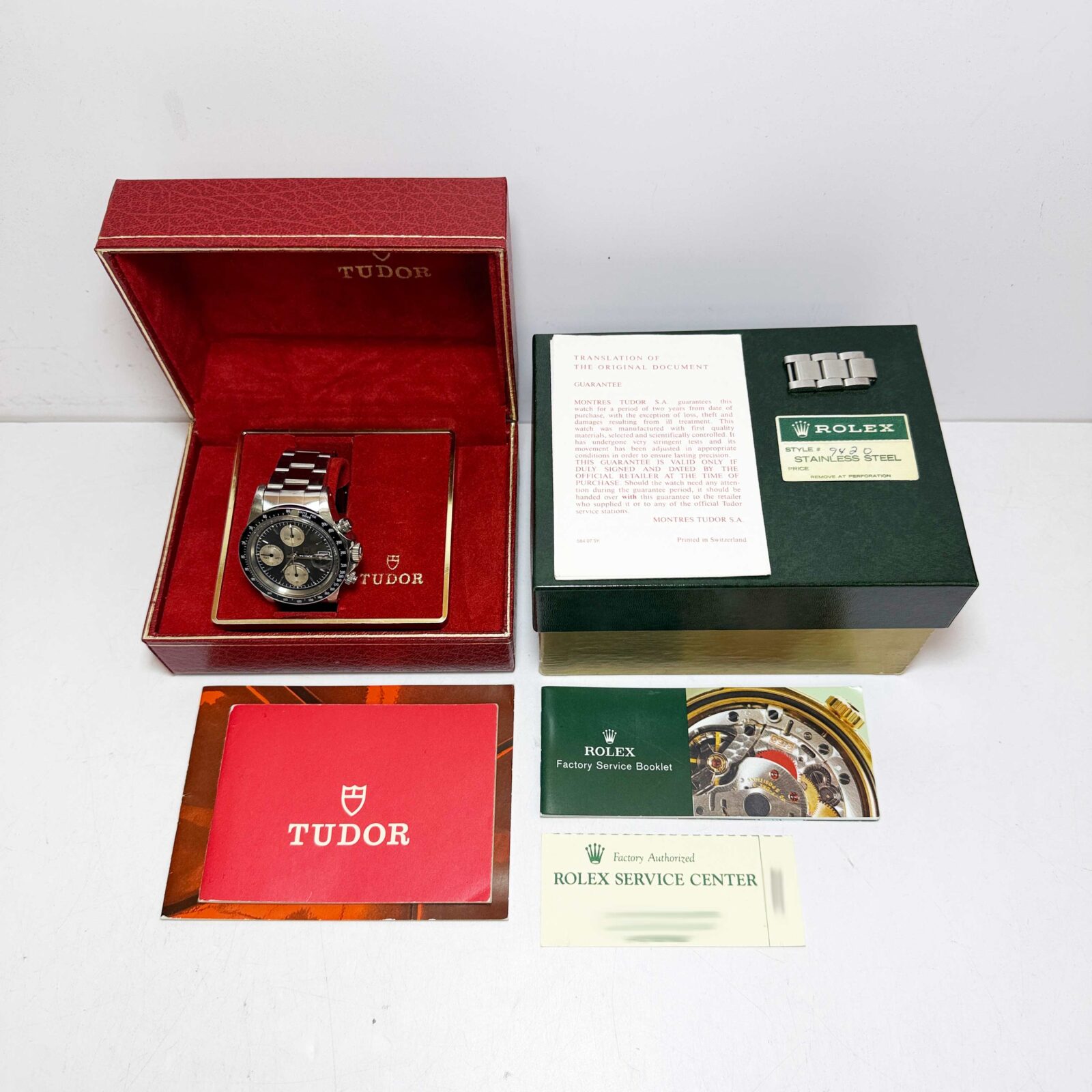 this tudor watch comes with its box, spare links, and booklets. The photos shown are of the exact watch being sold and accurately represent its condition. This watch is in stock and ready to ship immediately!