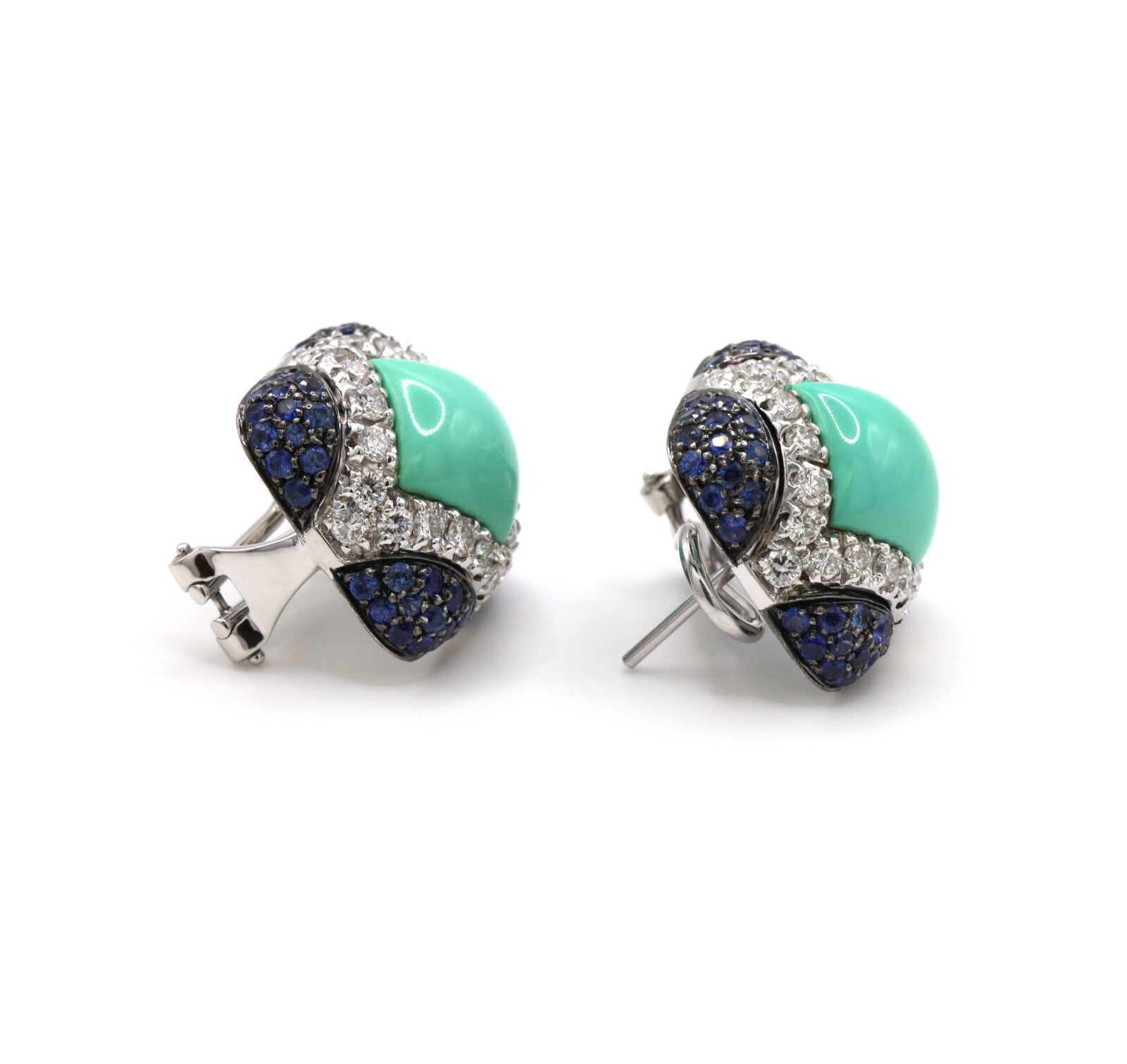 metal: platinum gemstone: turquoise, sapphire, diamond total diamond carat weight: approximately 1.02 carat total sapphire carat weight: approximately 1.00 carat diamond clarity: vs diamond color: f/g diamond cut: round measurements: 18 x 18 mm weight: 18 grams