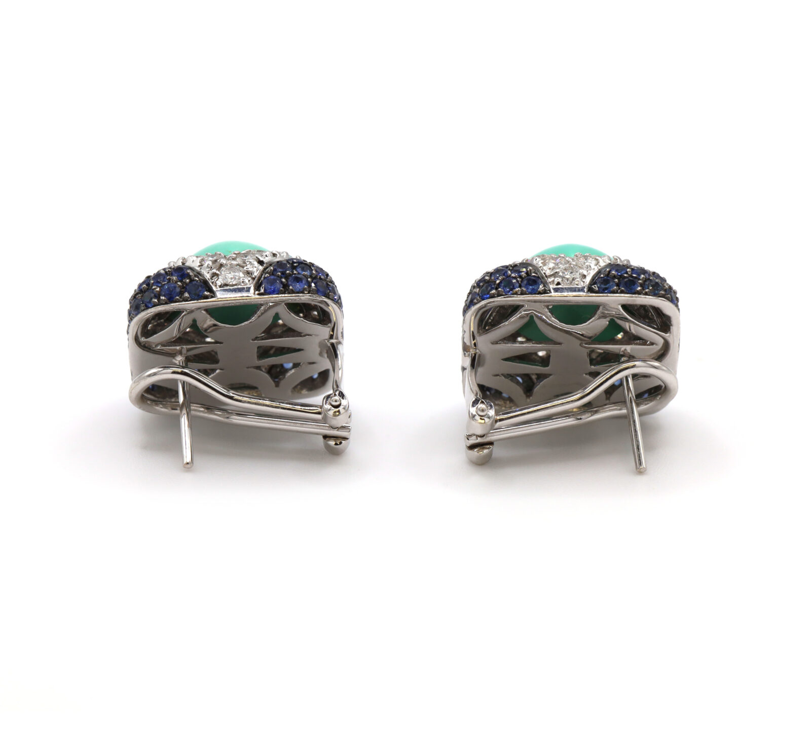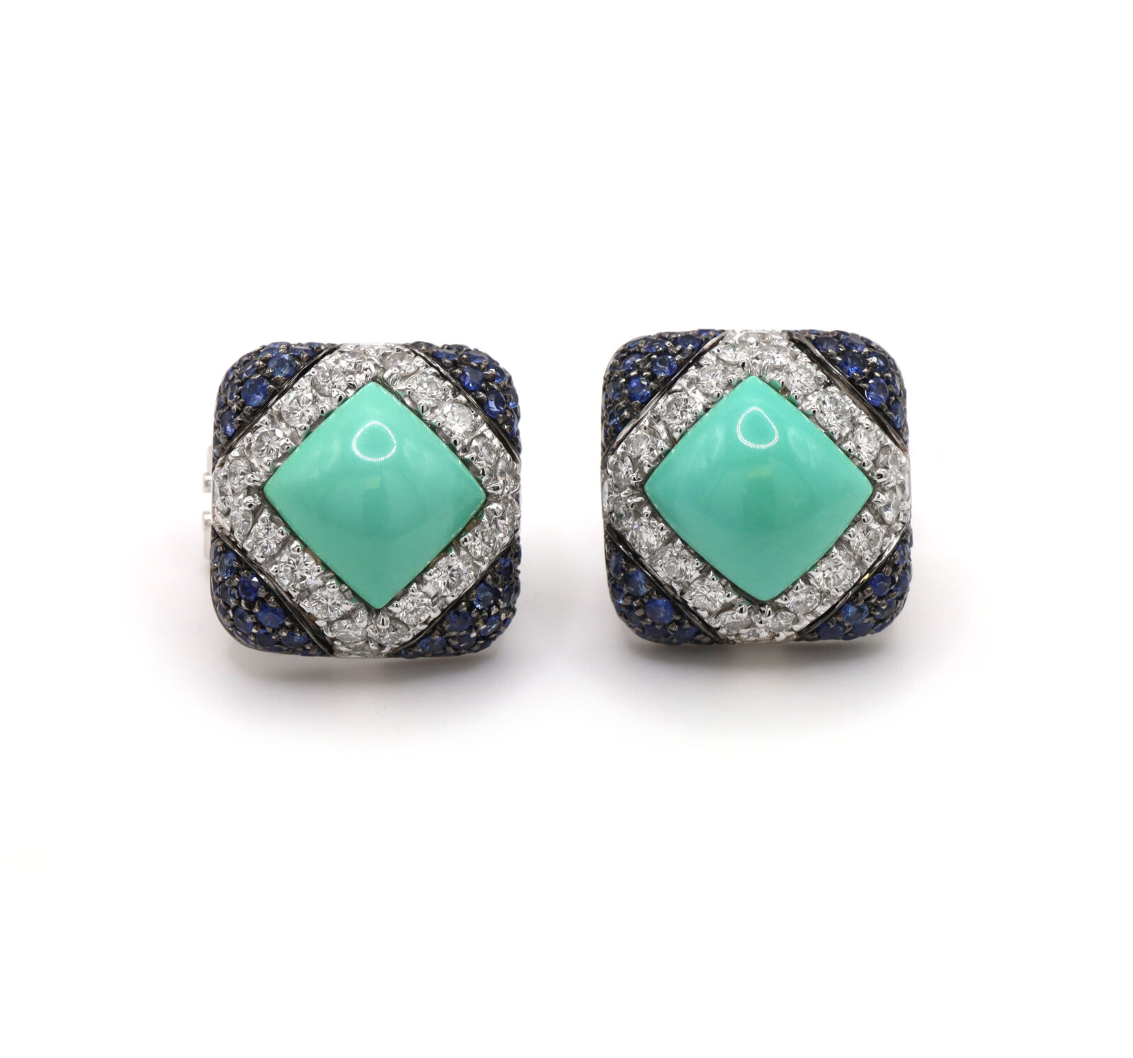 Turquoise Square Cut Sapphire Diamond Pave Platinum Omega Backing Earrings