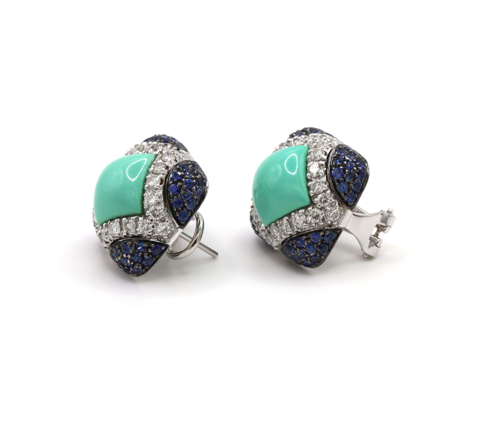 Metal: Platinum Gemstone: Turquoise, Sapphire, Diamond Total Diamond Carat Weight: Approximately 1.02 Carat Total Sapphire Carat Weight: Approximately 1.00 Carat Diamond Clarity: VS Diamond Color: F/G Diamond Cut: Round Measurements: 18 x 18 mm Weight: 18 Gra...