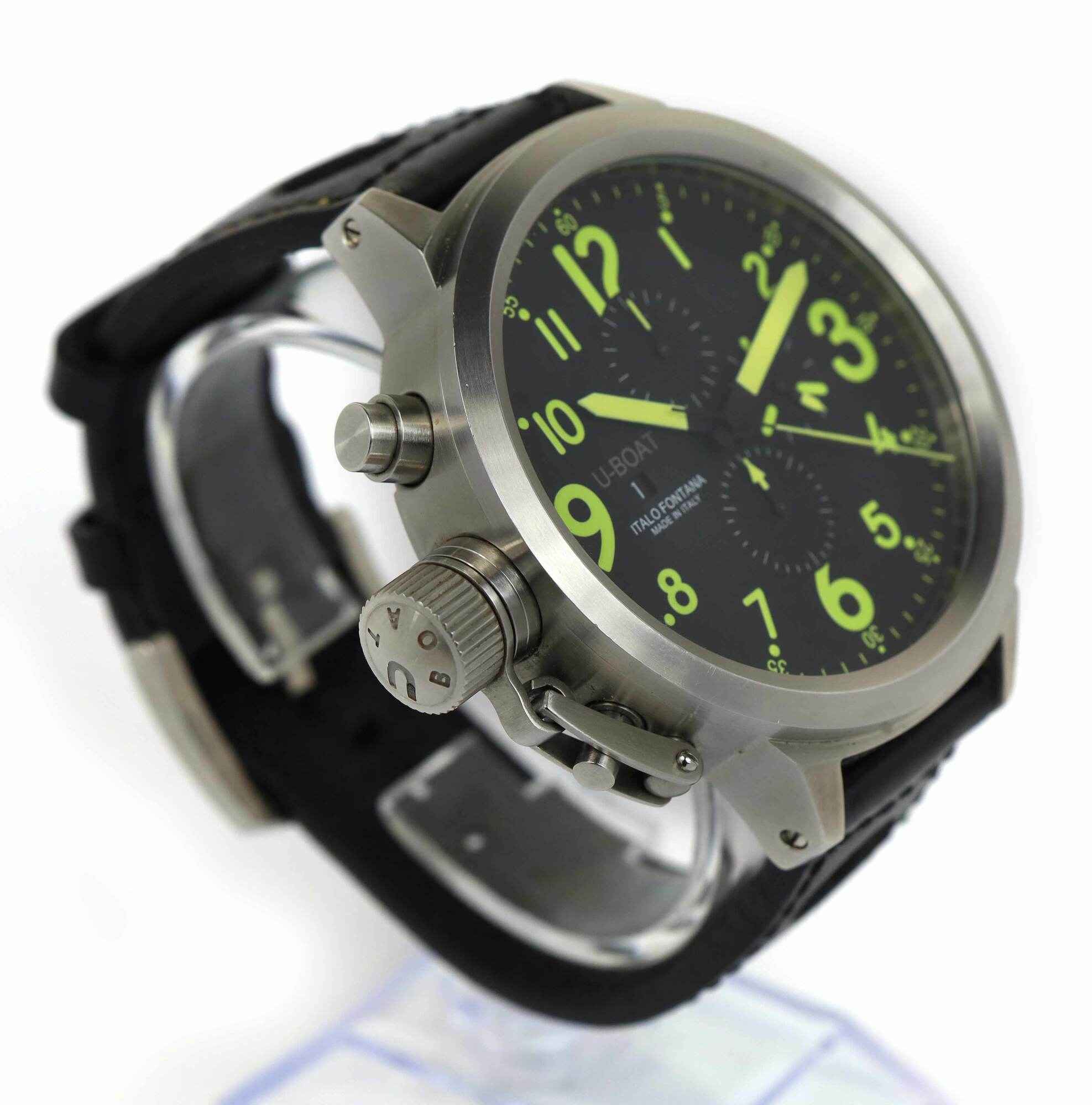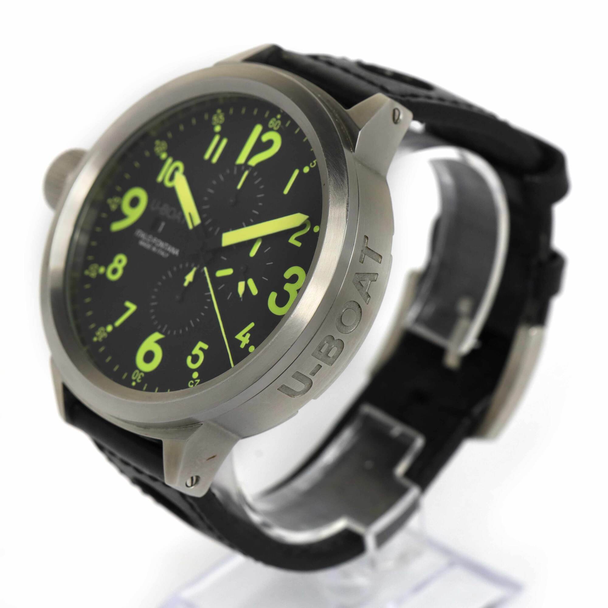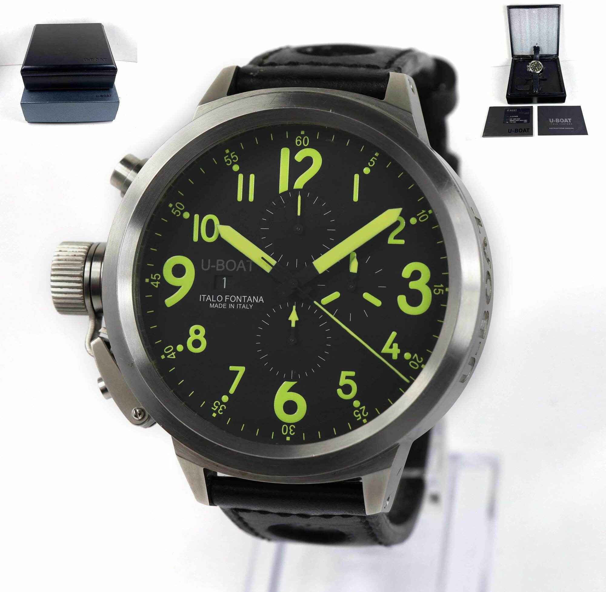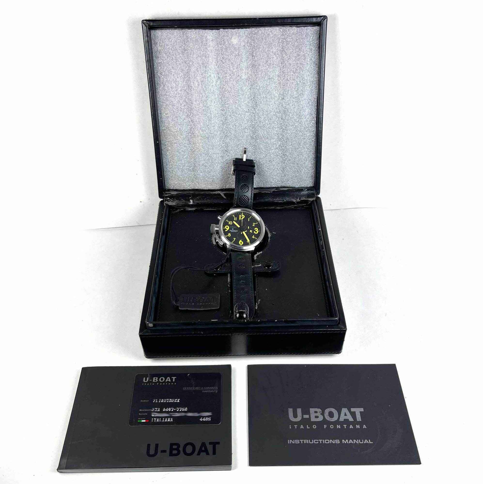 THIS U-BOAT IS IN EXCELLENT CONDITION AND COMES WITH ITS BOX, BOOKLETS, HANG TAG, AND WARRANTY CARD AS SHOWN IN THE PICTURES ATTACHED. THIS WATCH IS IN STOCK AND AVAILABLE TO SHIP IMMEDIATELY!