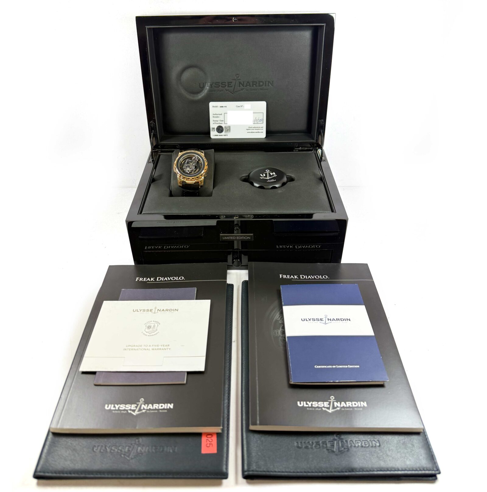 this ulysse nardin watch is in excellent condition showing some light signs of surface wear consistent with preowned watches. This comes with its box, booklets, and warranty card dated november 9th, 2017 as shown in the pictures attached. This watch is part of a limited edition with only 99 total pieces produced in this model. This watch is in stock and available to ship immediately!