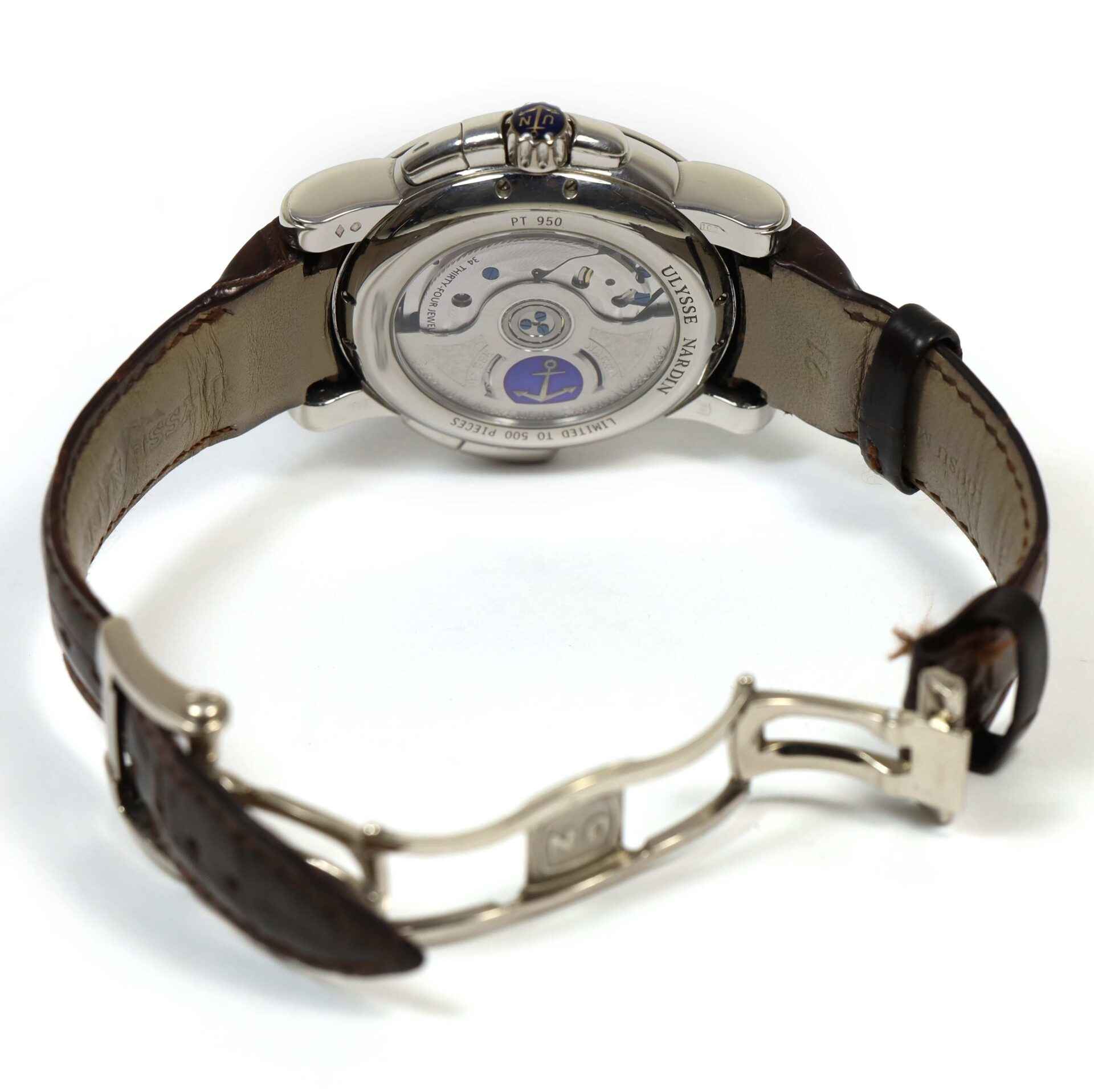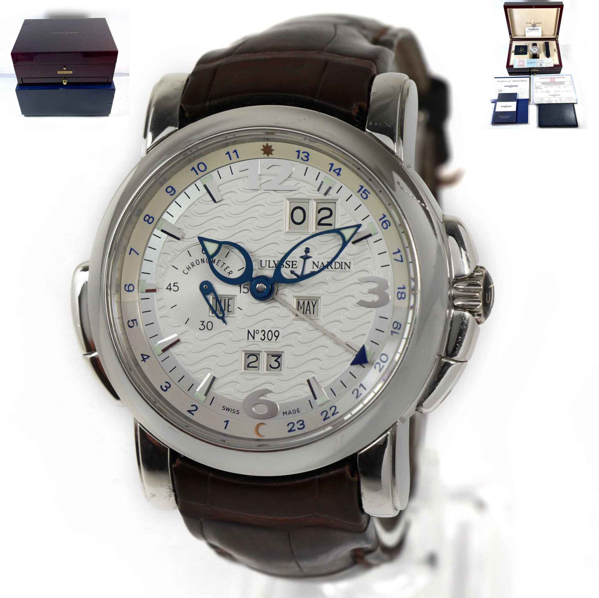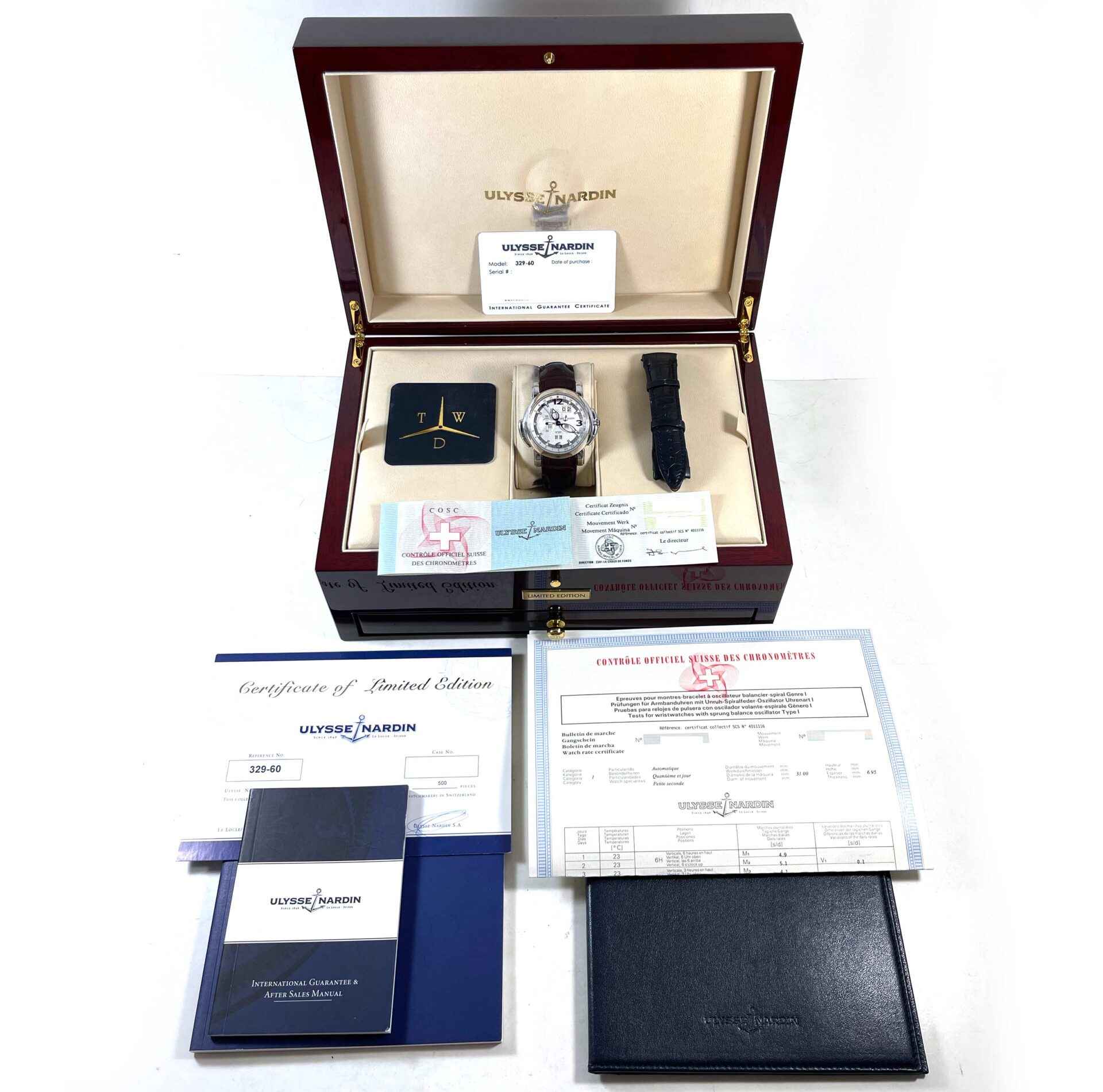 Read Morethis ulysse nardin watch is in good overall condition showing signs of wear on the case and comes with its box, booklets, one additional blue leather strap, and warranty card as shown in the pictures attached. This watch features a 42mm platinum case that surrounds a silver dial and comes on a leather strap with a platinum deployant clasp. This watch is in stock and available to ship immediately!