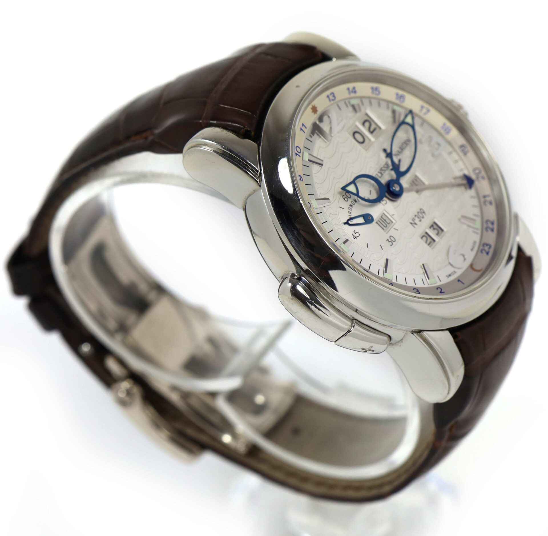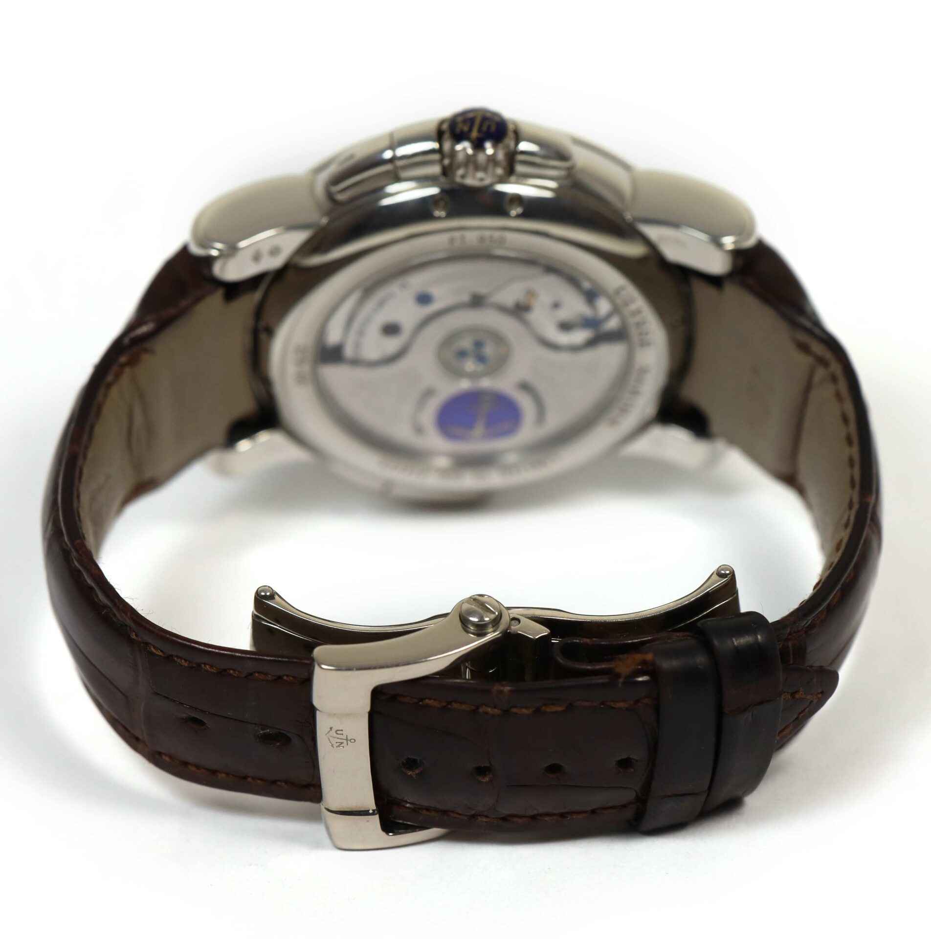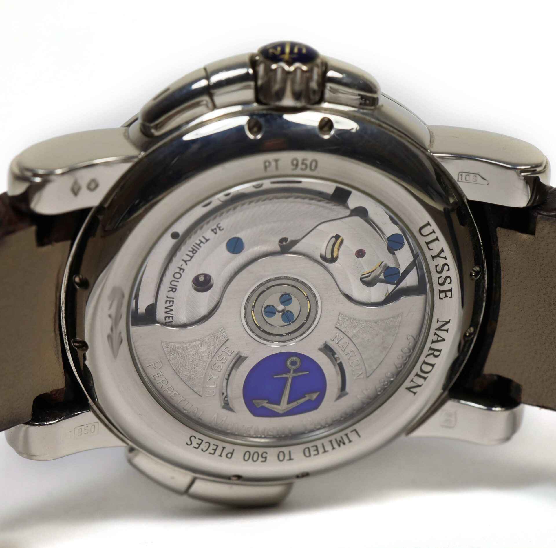 Read Morethis ulysse nardin watch is in good overall condition showing signs of wear on the case and comes with its box, booklets, one additional blue leather strap, and warranty card as shown in the pictures attached. This watch features a 42mm platinum case that surrounds a silver dial and comes on a leather strap with a platinum deployant clasp. This watch is in stock and available to ship immediately!