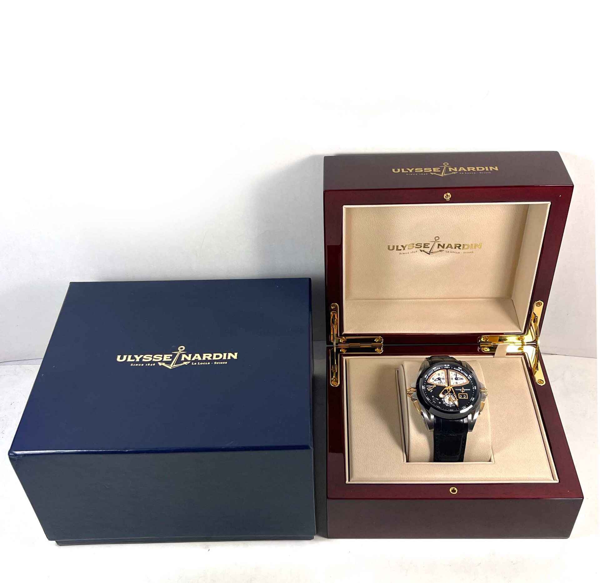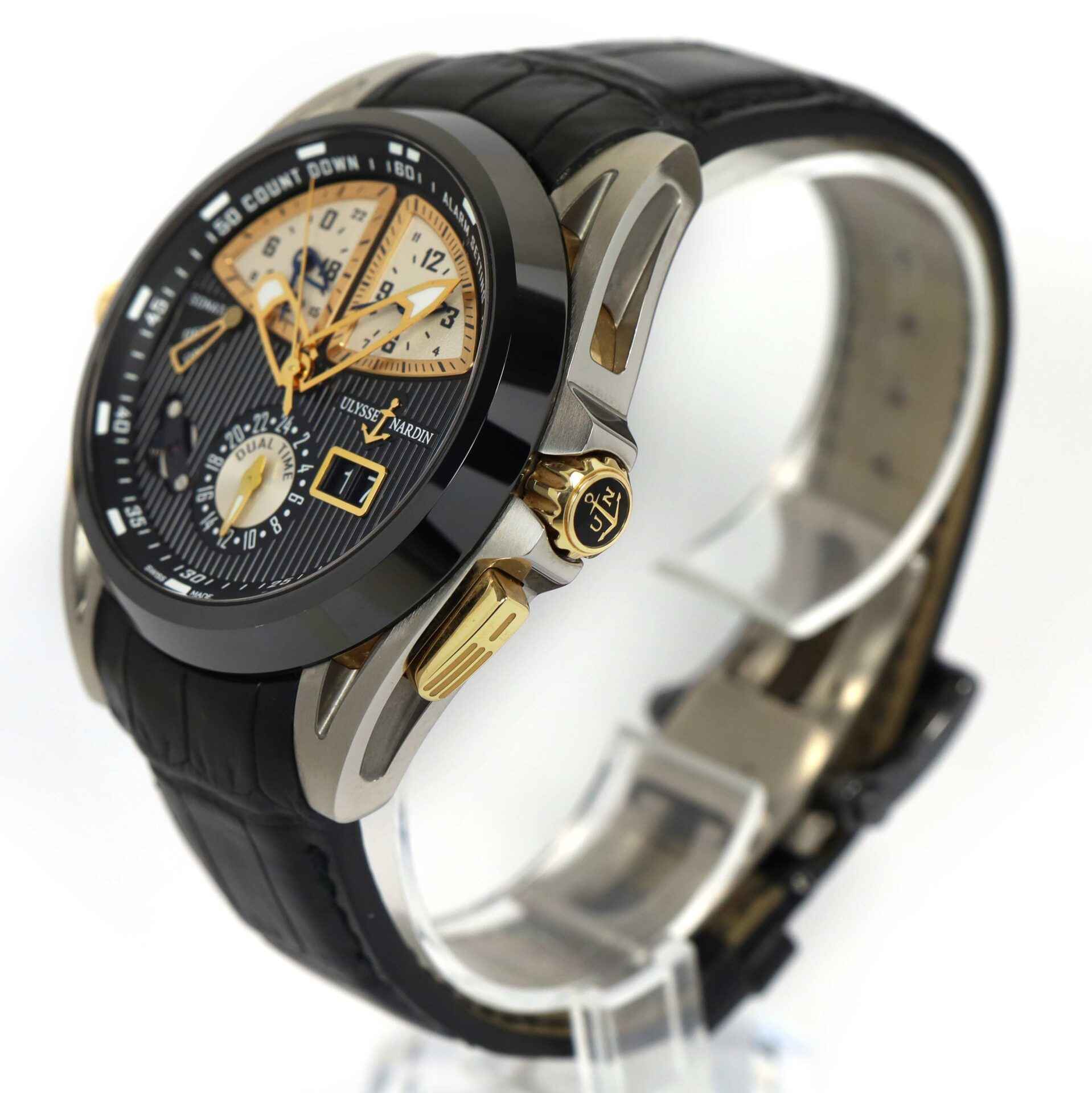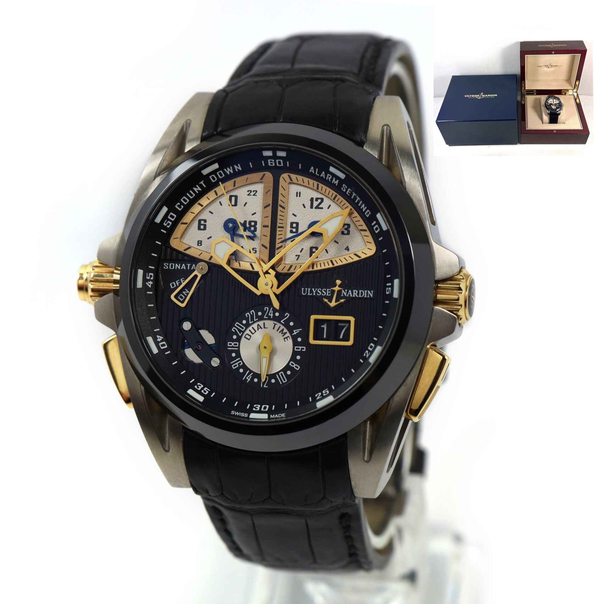 Read Morethis ulysse nardin watch is in excellent condition and comes with just its box as shown in the photos attached. This watch features a 44mm titanium brushed case with 18k rose gold crowns and buttons surrounding a black dial with a black ceramic bezel, and comes on black leather band. The functions include seconds, minutes, hours, date wheel, and alarm. This alarm function can be set once daily and allows the user to conveniently set the alarm to am or pm which is shown on the two subdials at the top of the dial. This watch is in stock and available to ship immediately!