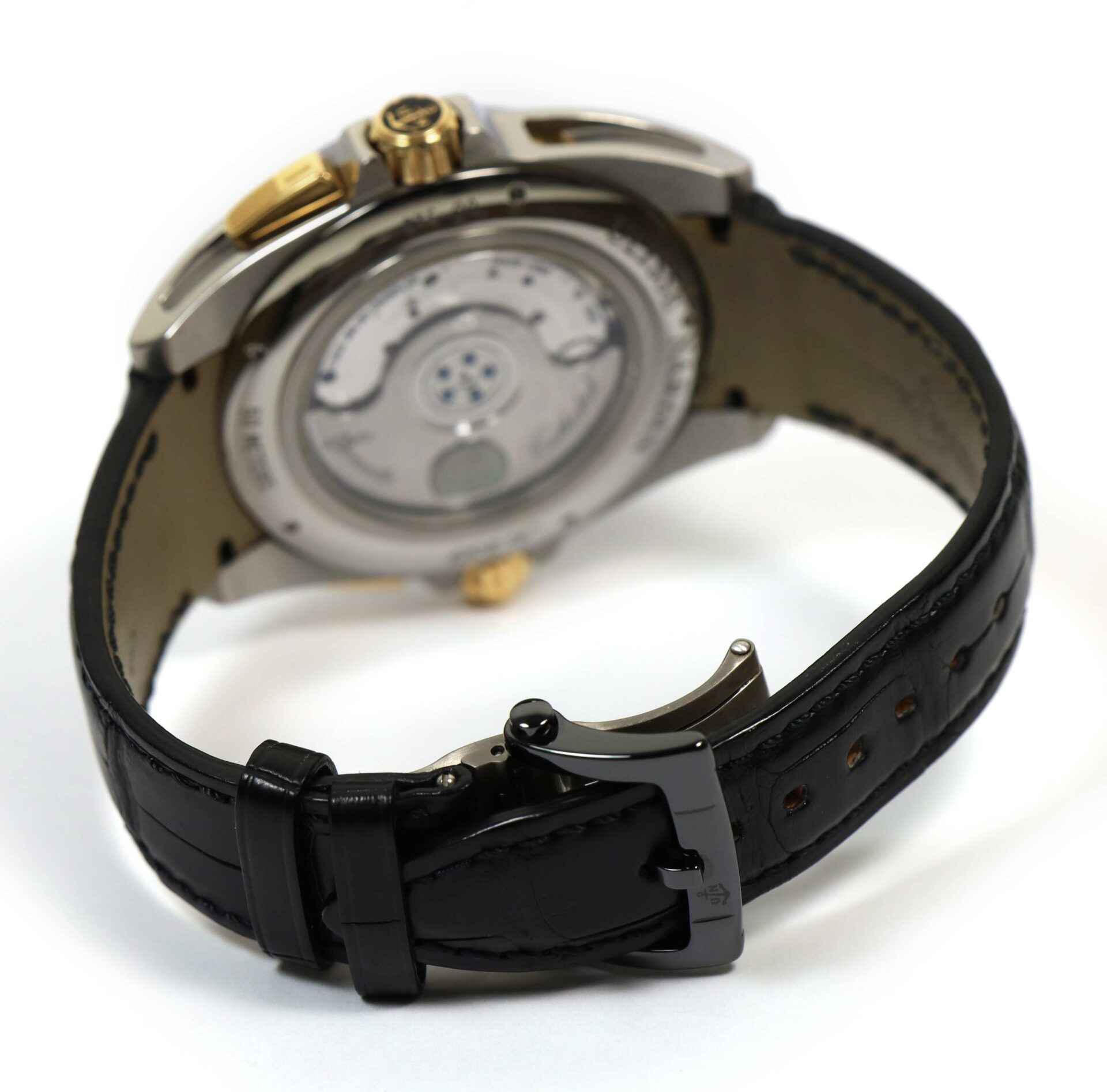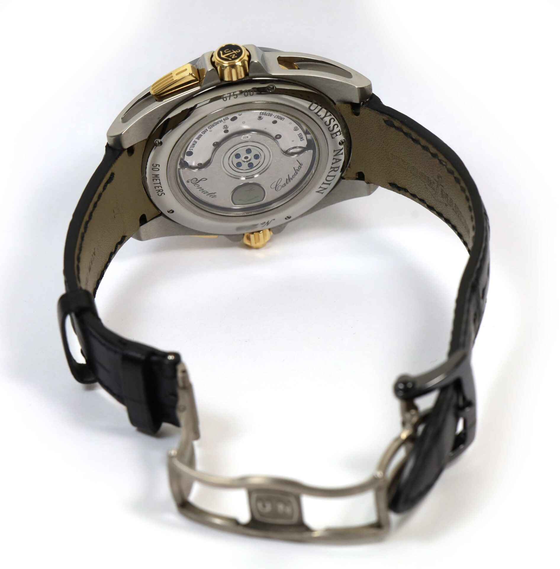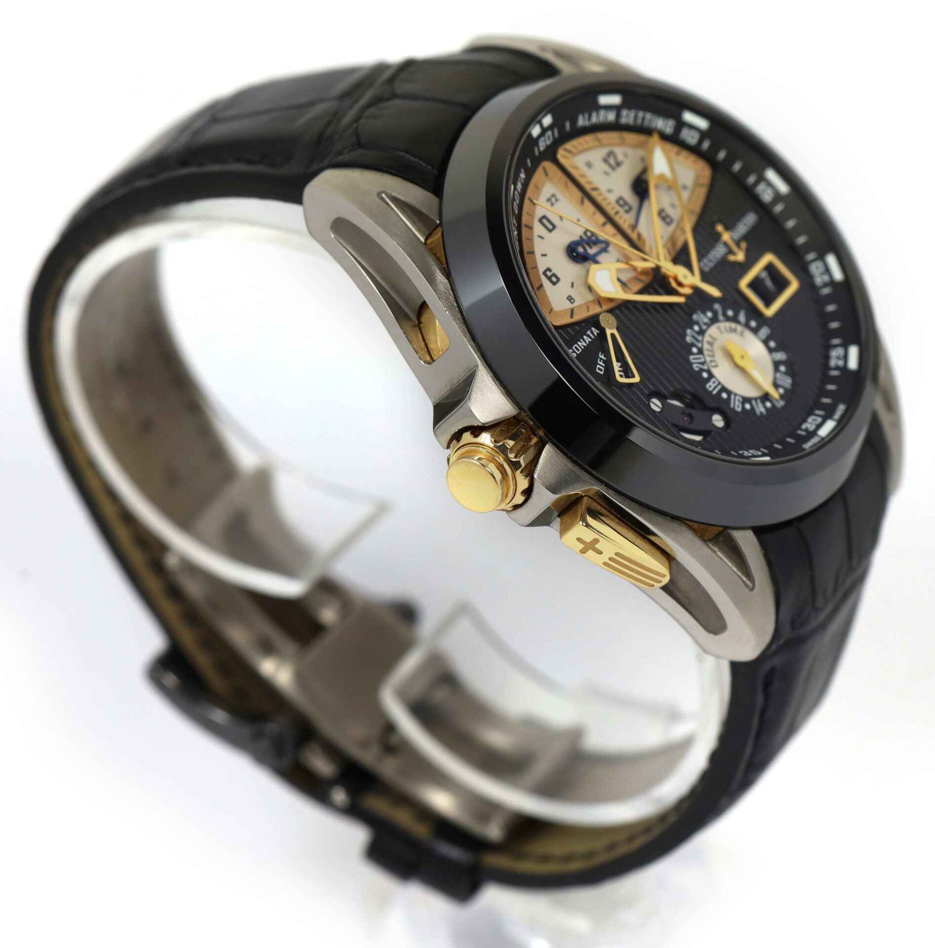 Read Morethis ulysse nardin watch is in excellent condition and comes with just its box as shown in the photos attached. This watch features a 44mm titanium brushed case with 18k rose gold crowns and buttons surrounding a black dial with a black ceramic bezel, and comes on black leather band. The functions include seconds, minutes, hours, date wheel, and alarm. This alarm function can be set once daily and allows the user to conveniently set the alarm to am or pm which is shown on the two subdials at the top of the dial. This watch is in stock and available to ship immediately!