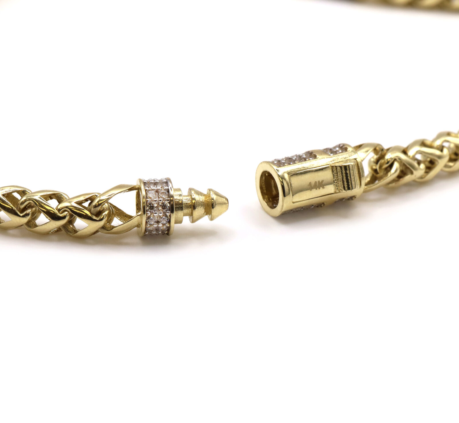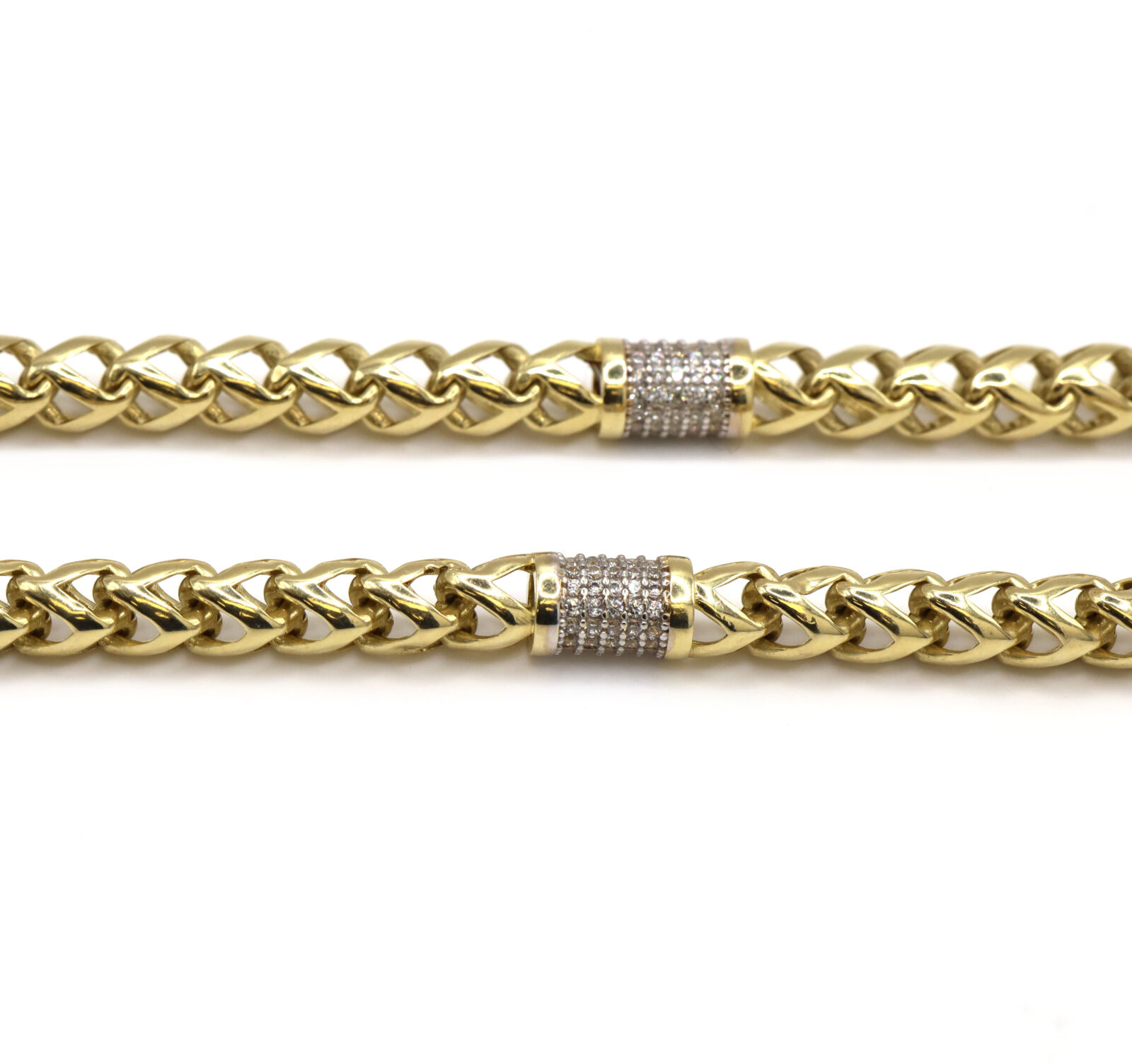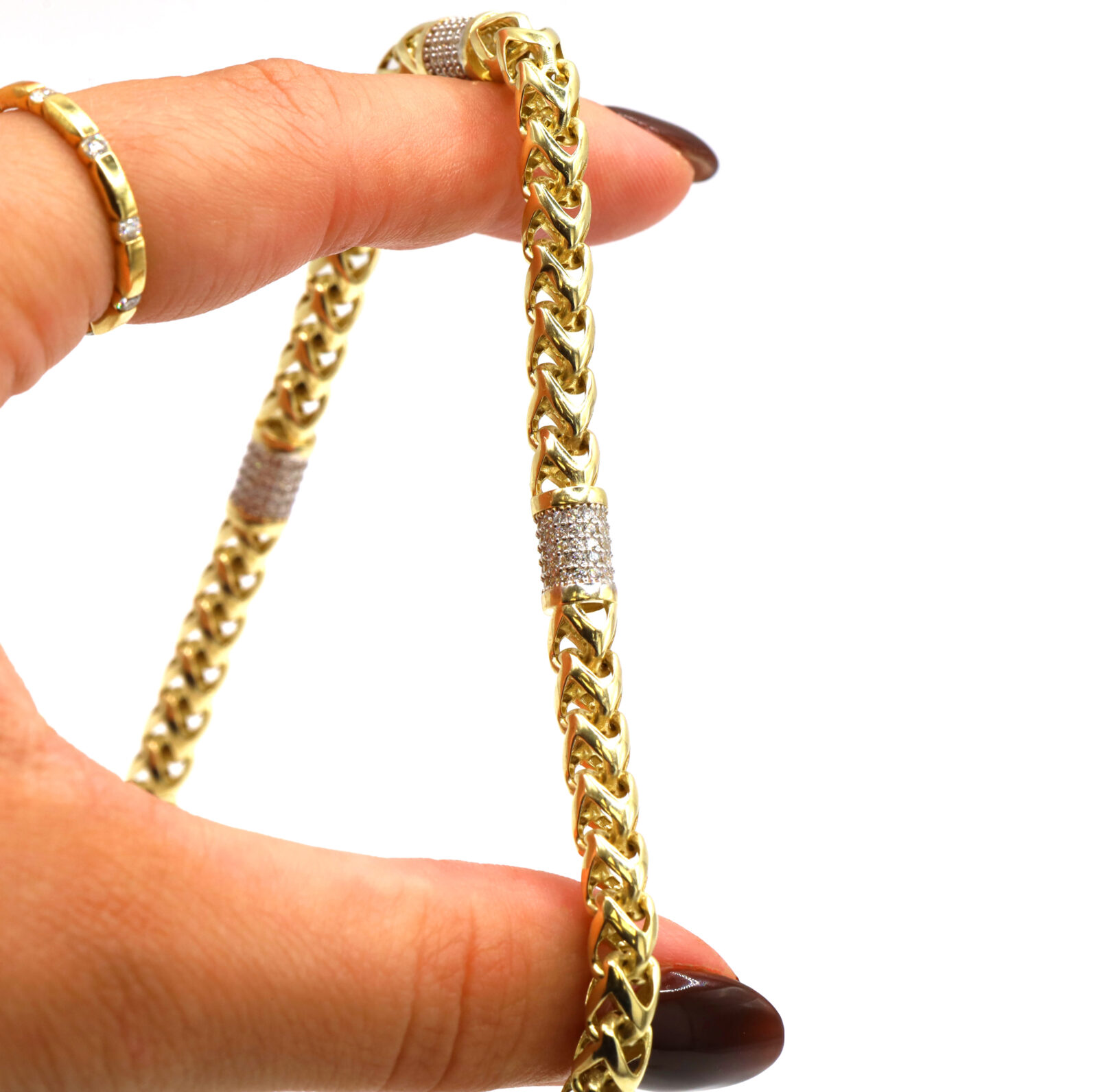 Diamond Pave Barrel Franco Wheat 14K Yellow Gold Link Mens Unisex Chain Necklace