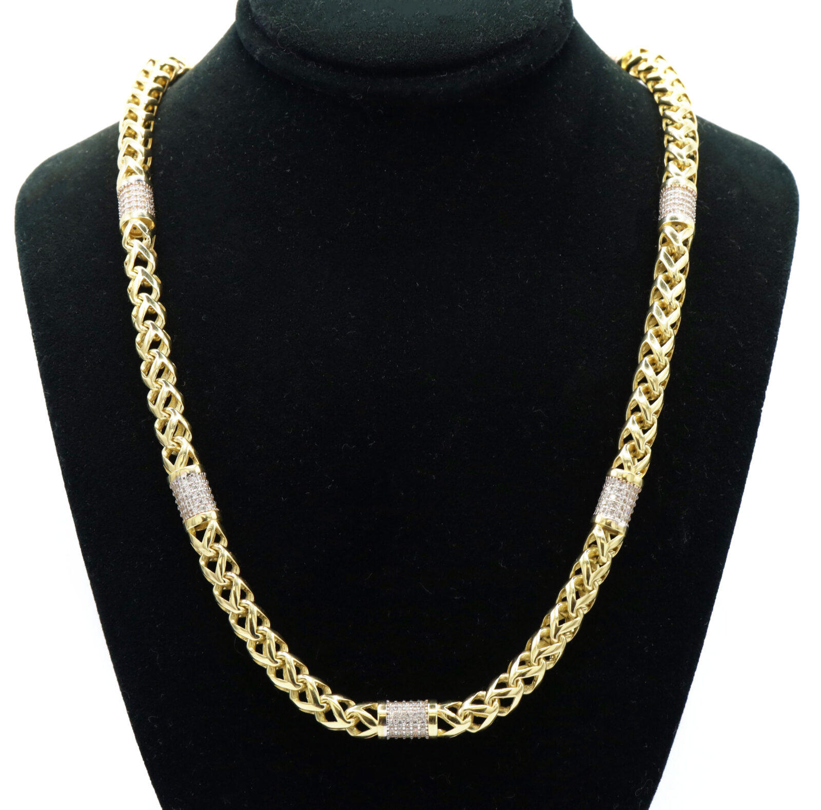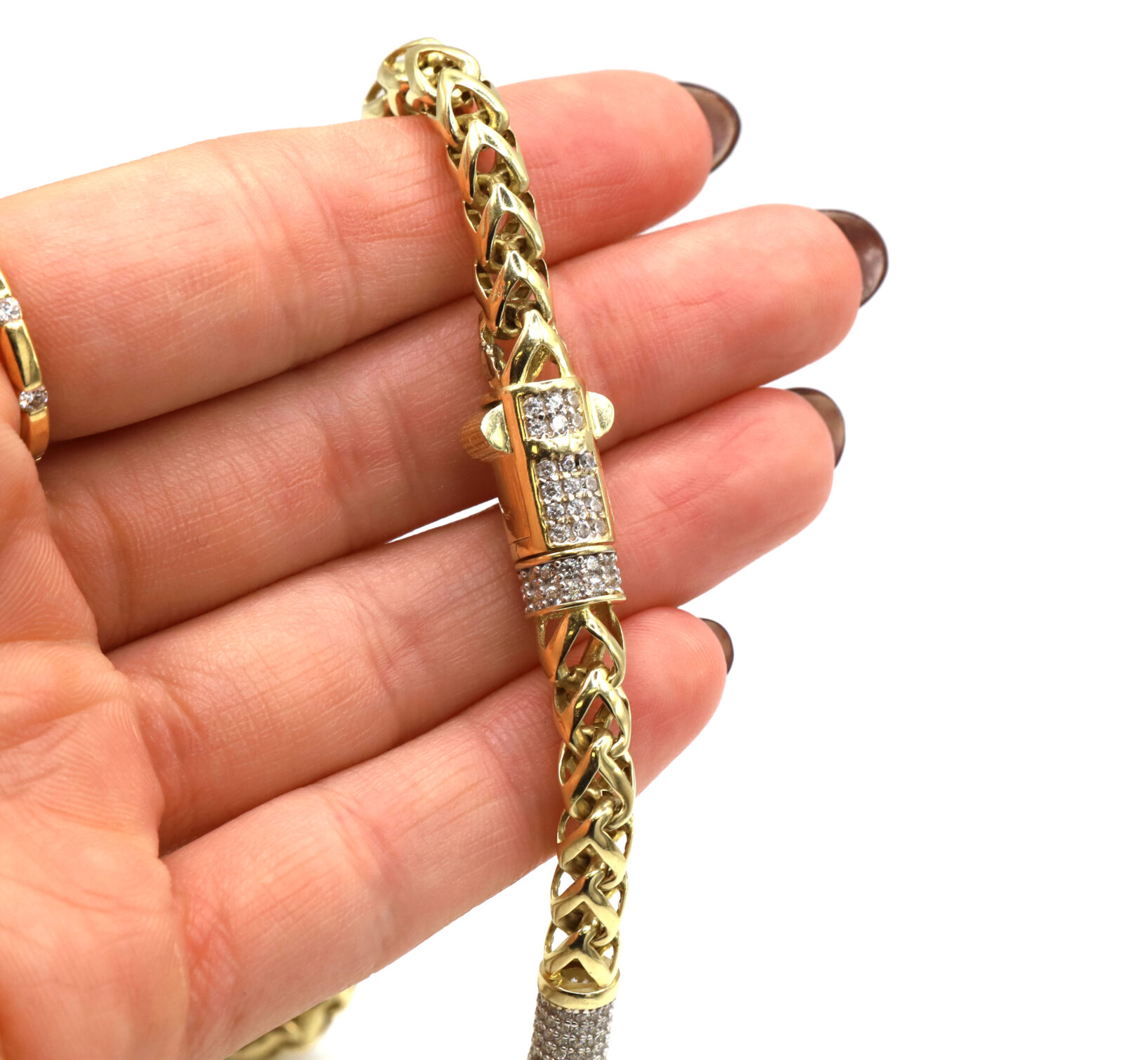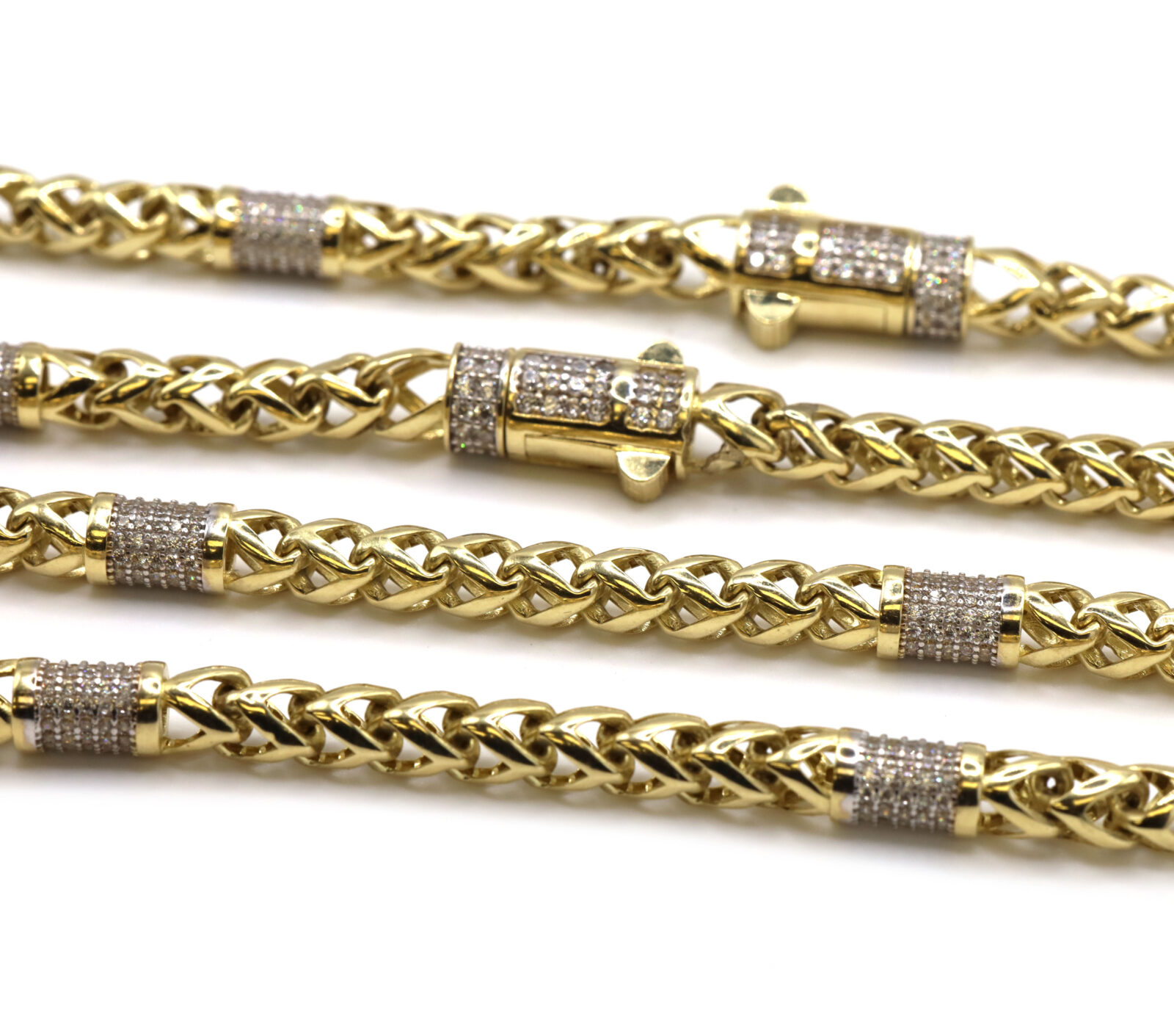 Diamond Pave Barrel Franco Wheat 14K Yellow Gold Link Mens Unisex Chain Necklace