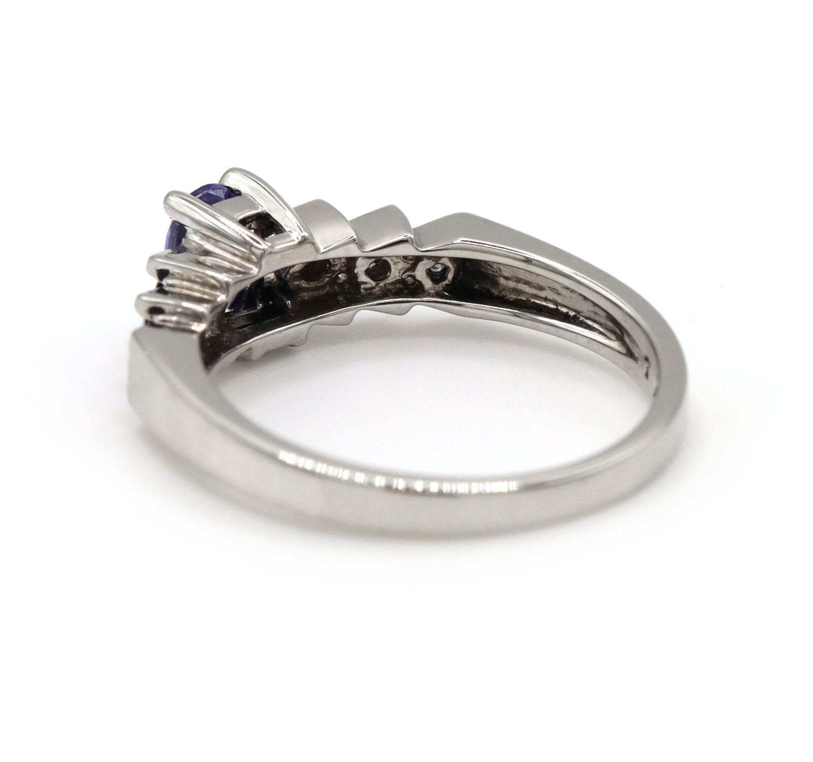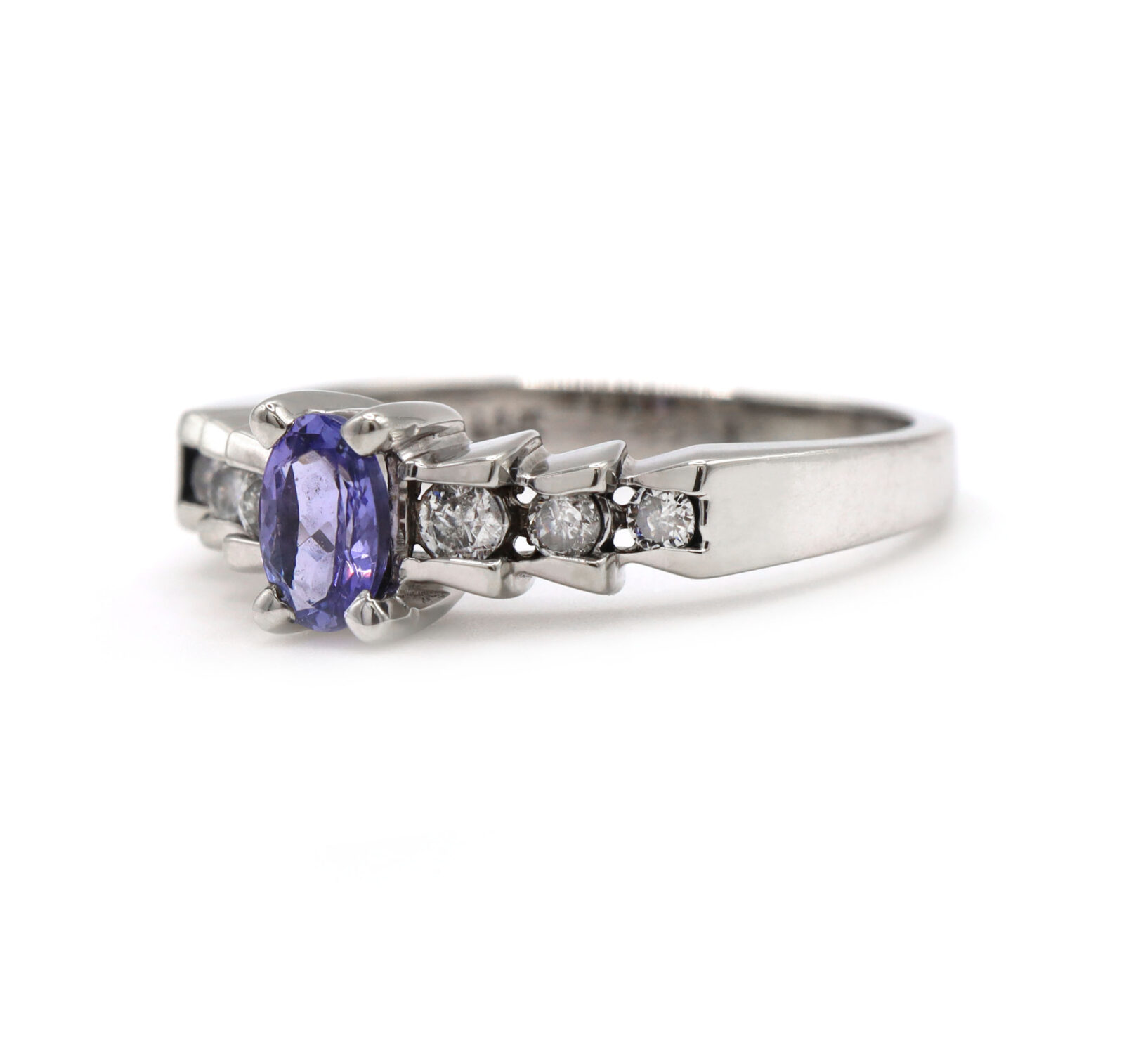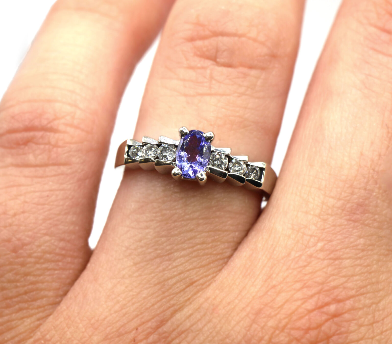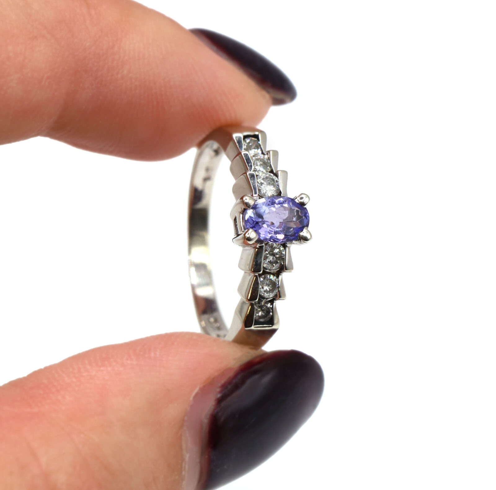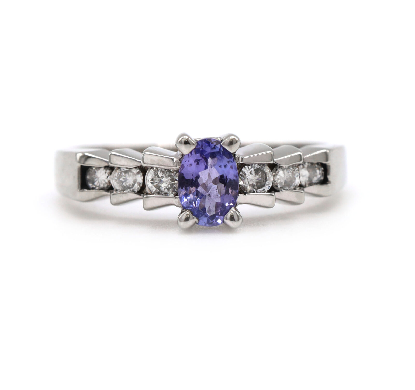 Material: 14k White Gold Size: 6.75 Gemstone: Tanzanite and Diamond Cut: Oval Front Width: 6.30mm Band Width: 2mm Weight: 3.2 Grams