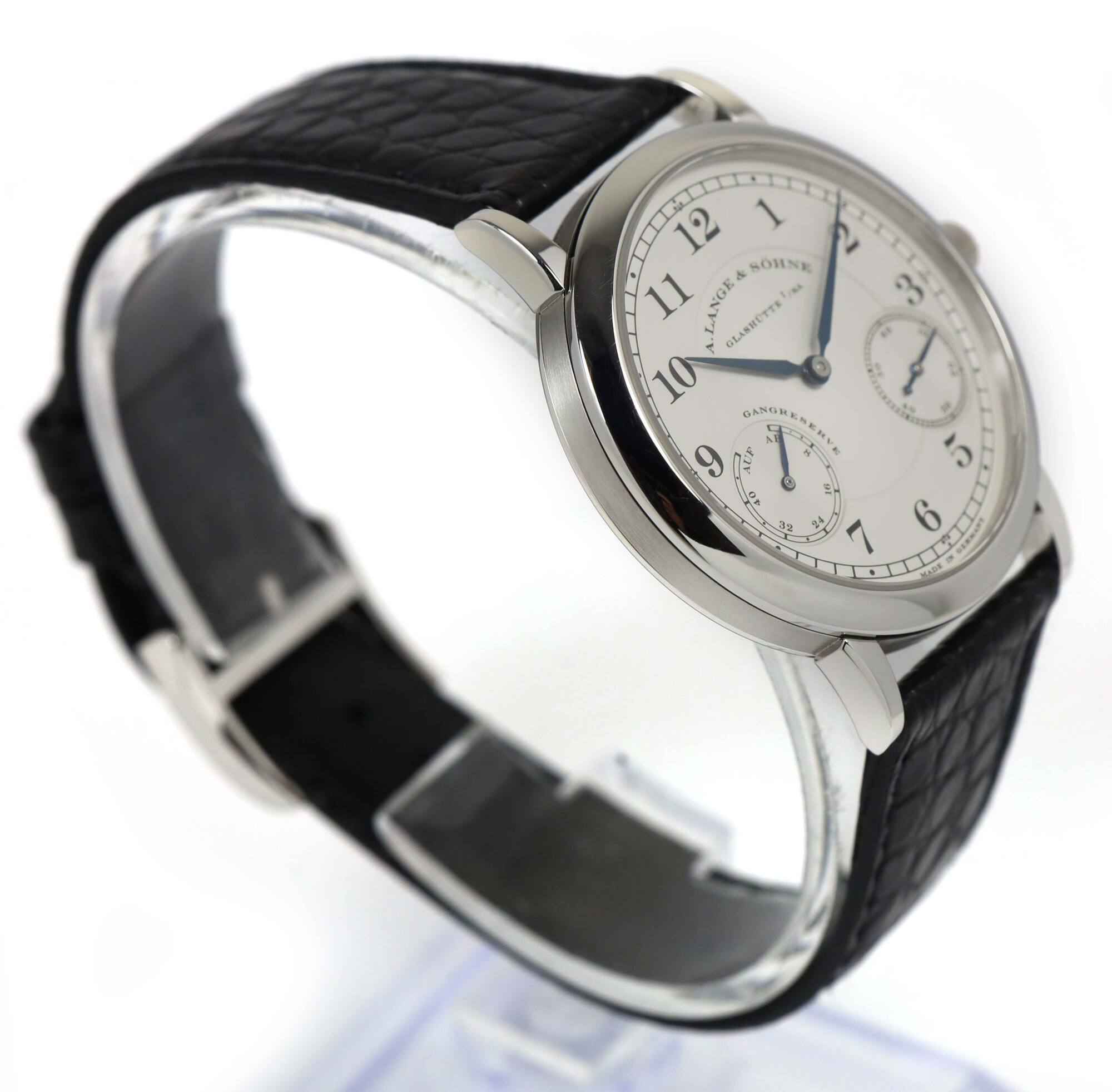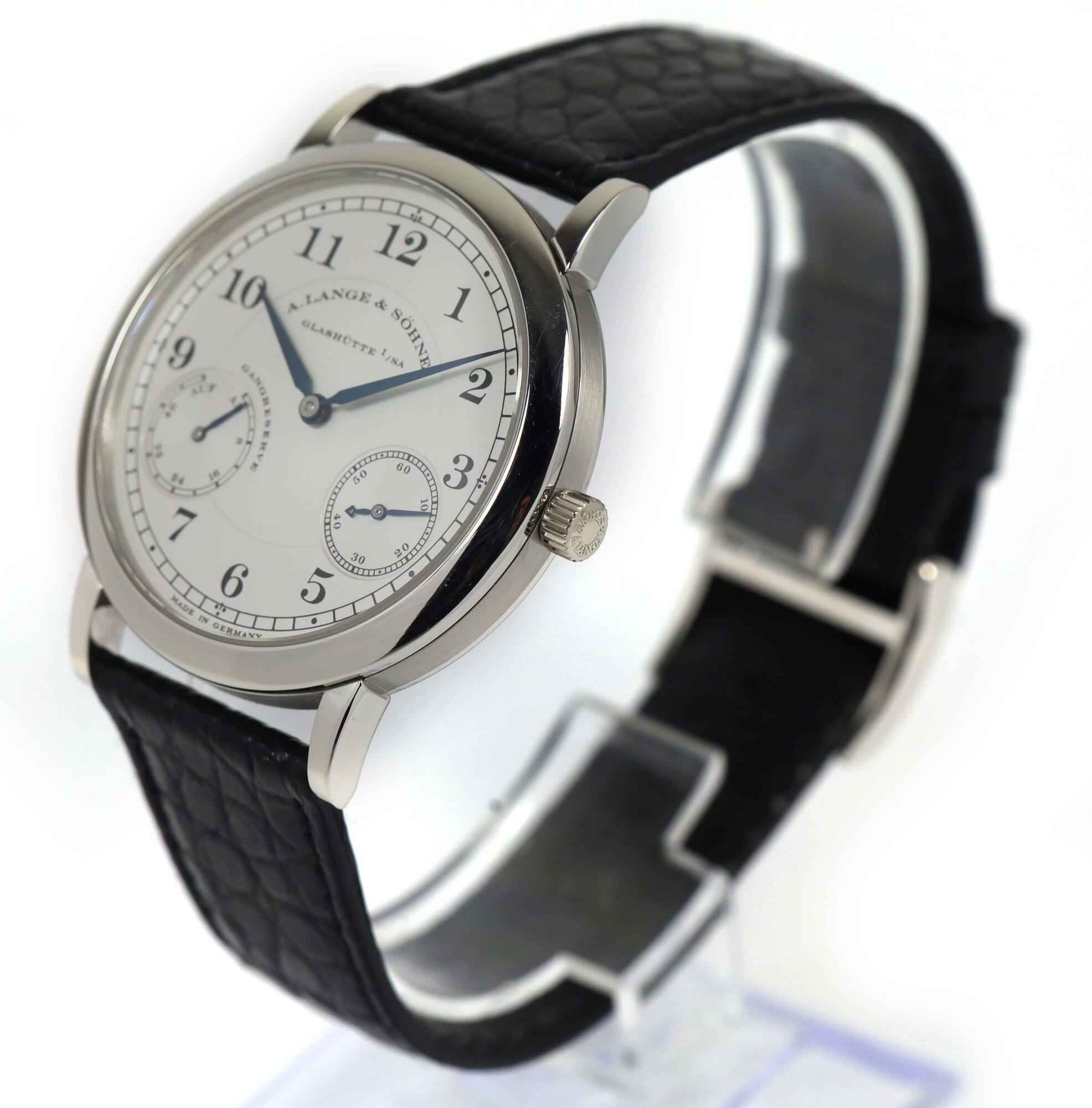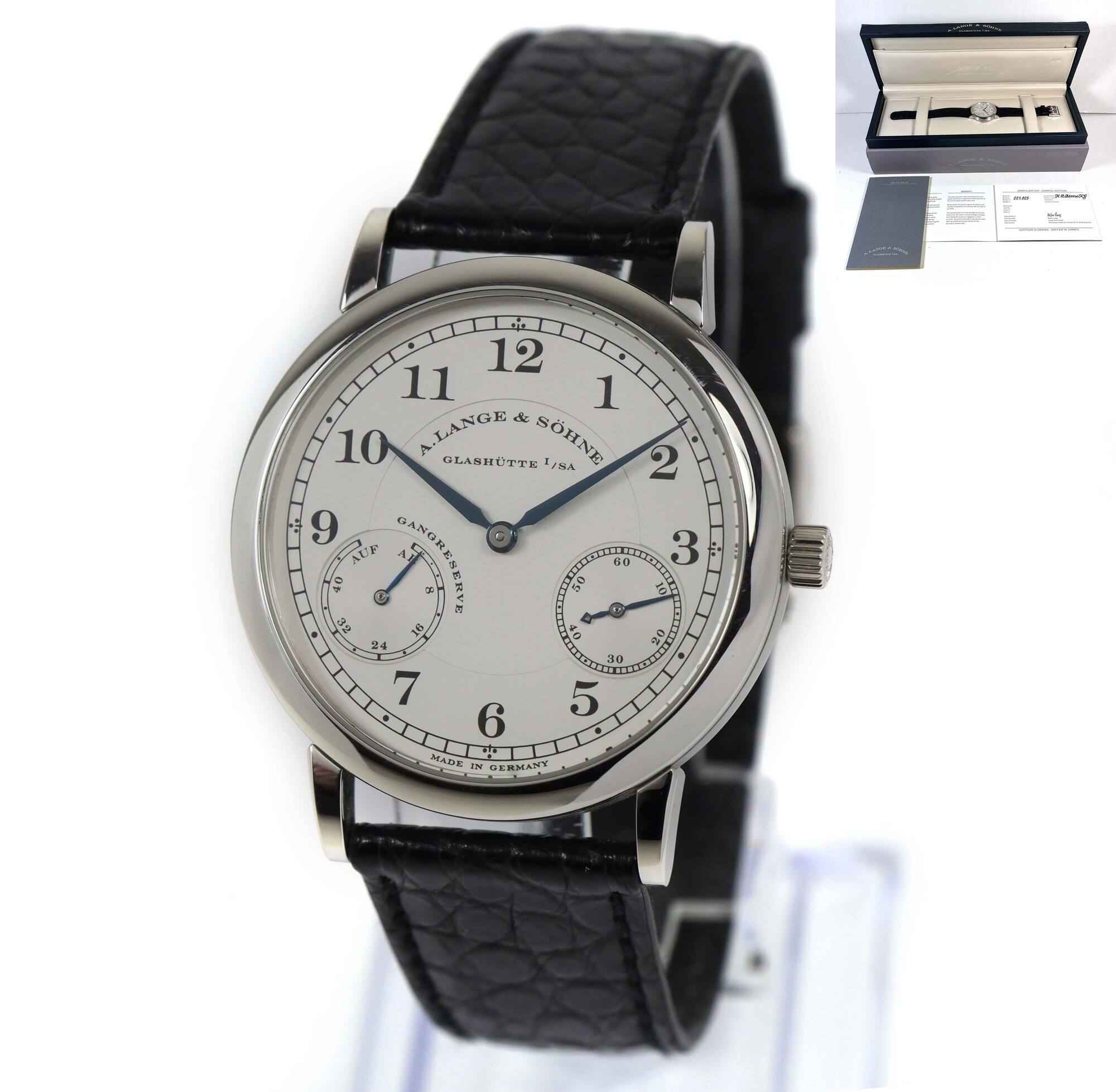 Read Moreyou are viewing a very rare and special set. This watch dates back to 1997 according to the serial number. The watch is unpolished and the original owner who we purchased it from stated he wore the watch twice in his life, and confirmed that is when he purchased the watch. Even the original strap is original, mint, and unchanged. This is a fully complete set and likely the best example 36mm platinum up down that exists in the world. This a. Lange is in super condition for the age of the watch and comes with its box, booklets, and warranty paper as shown in the pictures attached. This watch features a 36mm platinum case that surrounds a silver dial and comes on a black alligator strap. The watch functions include hours, minutes, small-seconds and day/night indicator. This watch is in stock and available to ship immediately!
