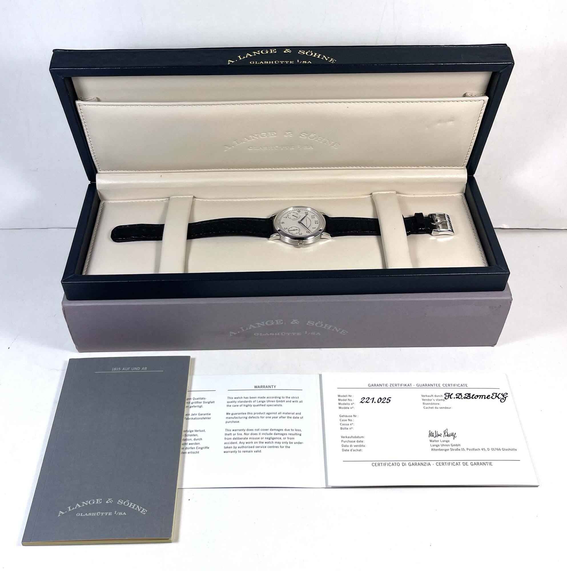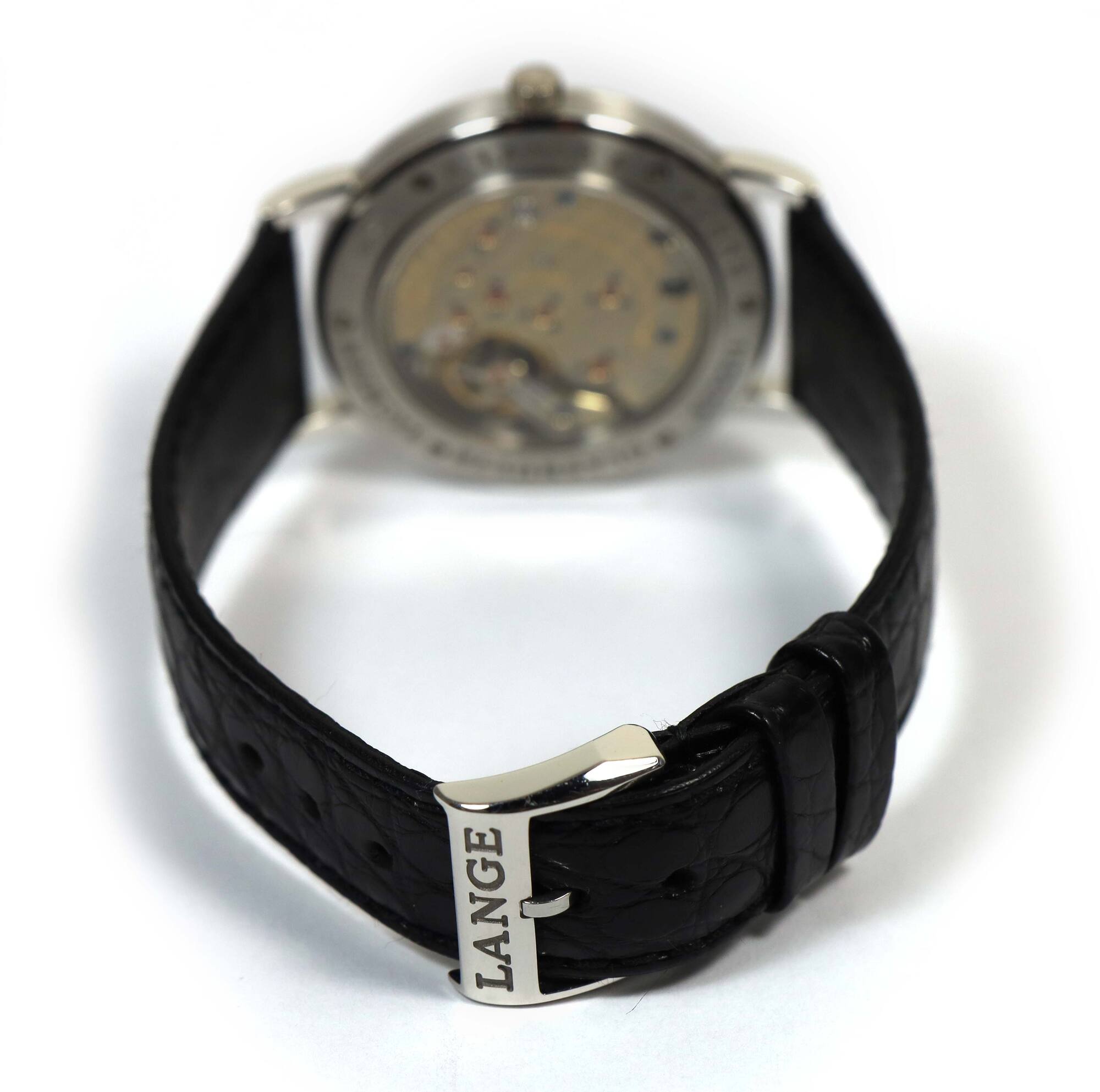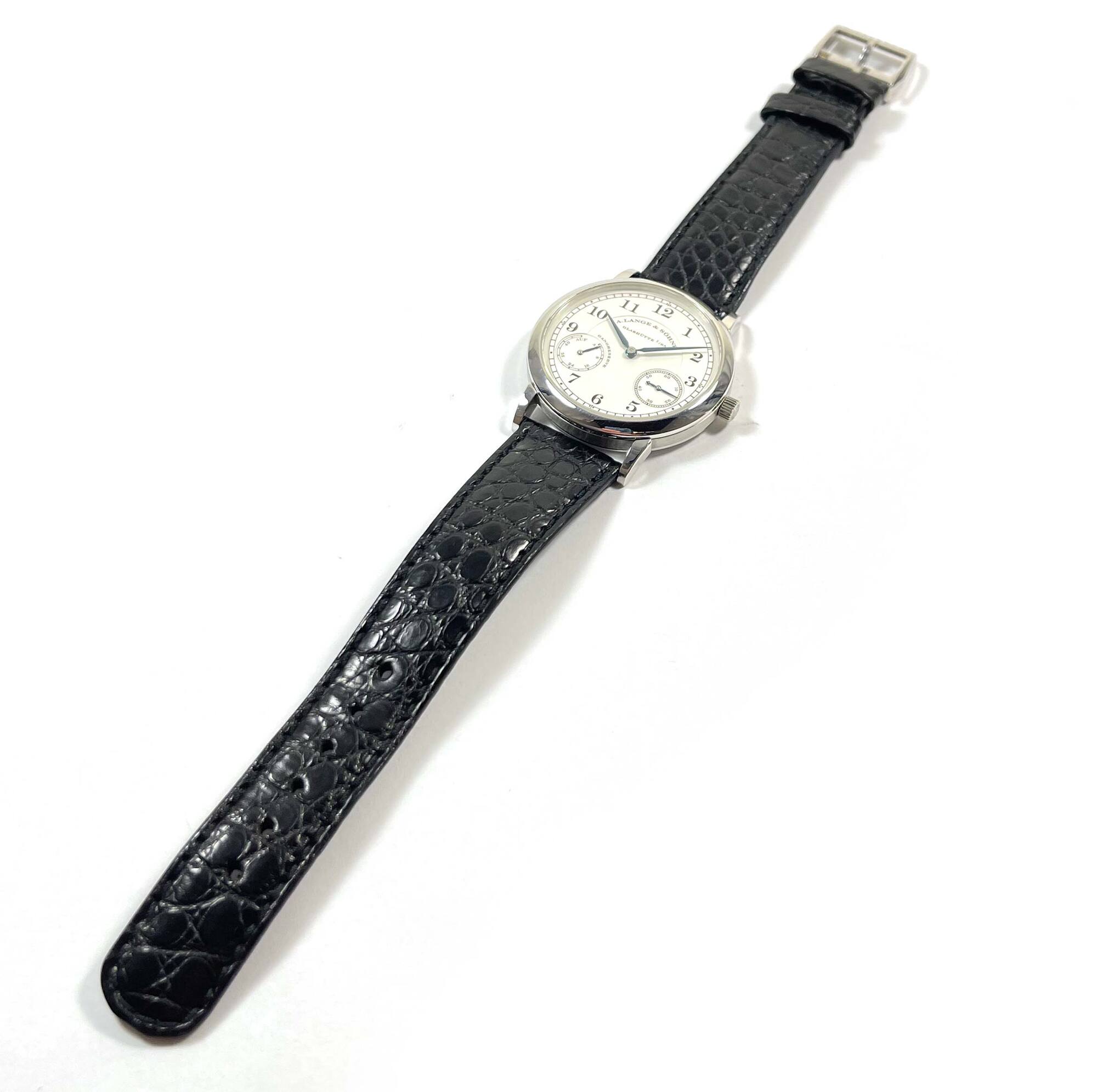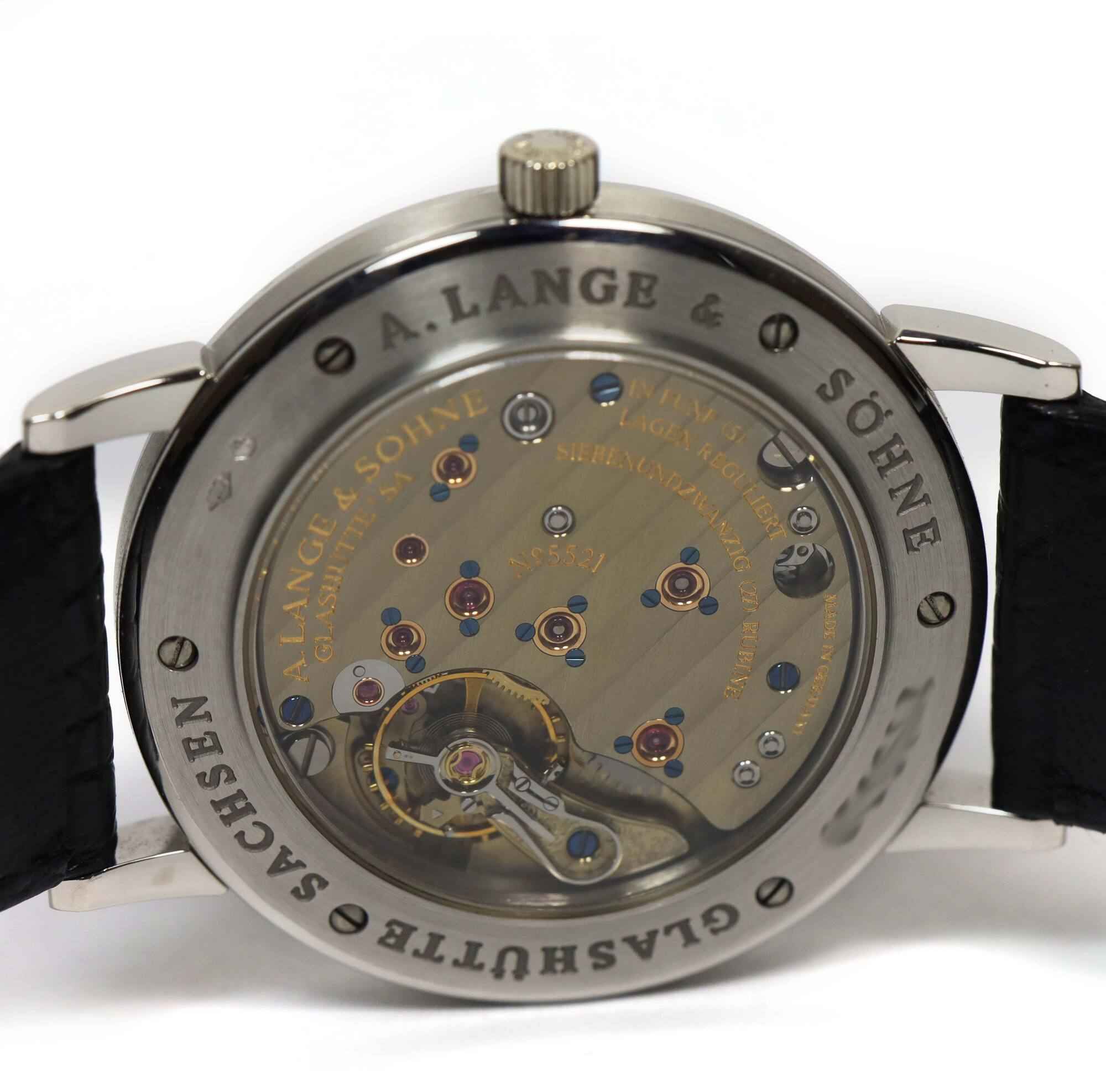 Read Moreyou are viewing a very rare and special set. This watch dates back to 1997 according to the serial number. The watch is unpolished and the original owner who we purchased it from stated he wore the watch twice in his life, and confirmed that is when he purchased the watch. Even the original strap is original, mint, and unchanged. This is a fully complete set and likely the best example 36mm platinum up down that exists in the world. This a. Lange is in super condition for the age of the watch and comes with its box, booklets, and warranty paper as shown in the pictures attached. This watch features a 36mm platinum case that surrounds a silver dial and comes on a black alligator strap. The watch functions include hours, minutes, small-seconds and day/night indicator. This watch is in stock and available to ship immediately!
