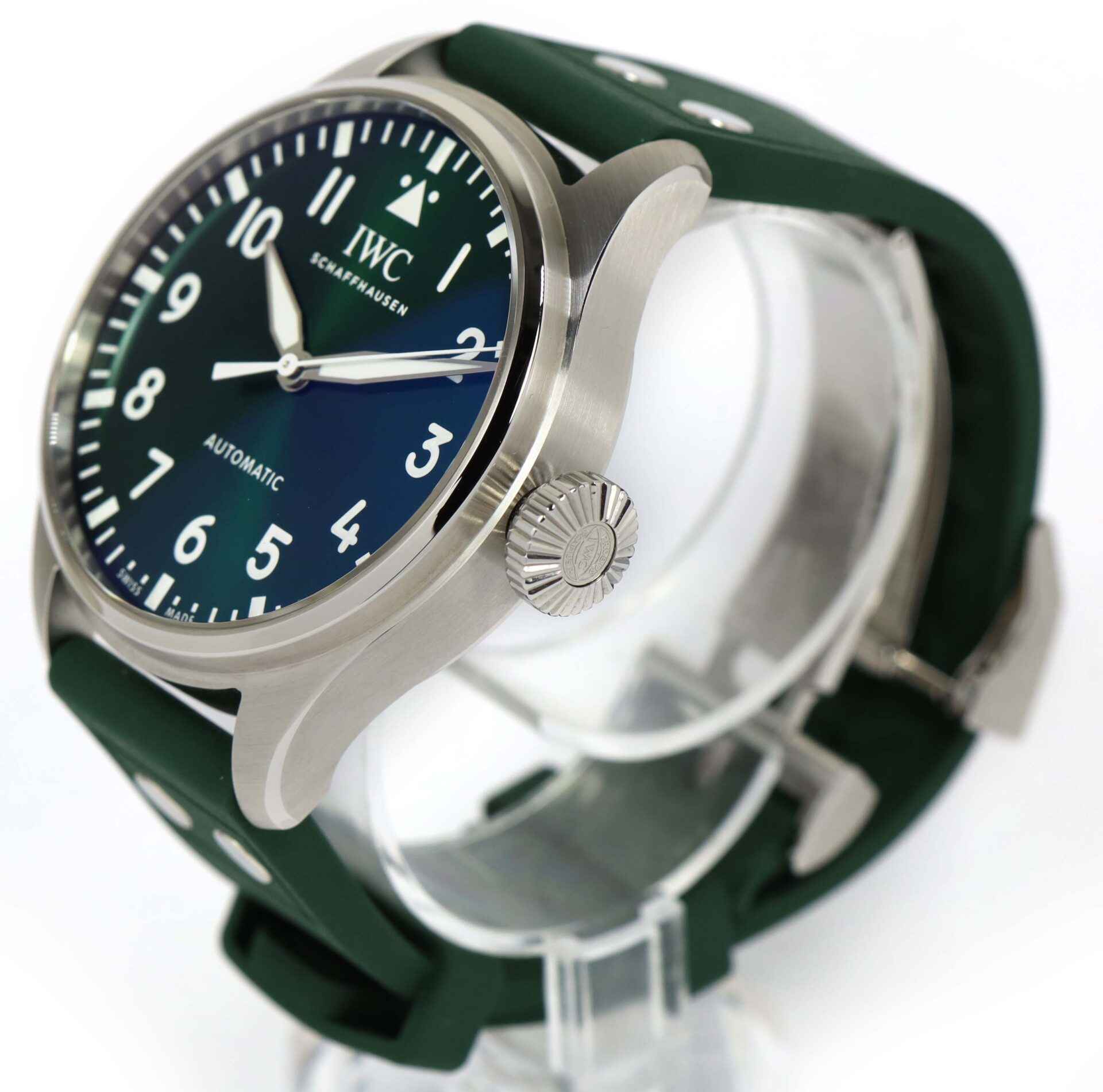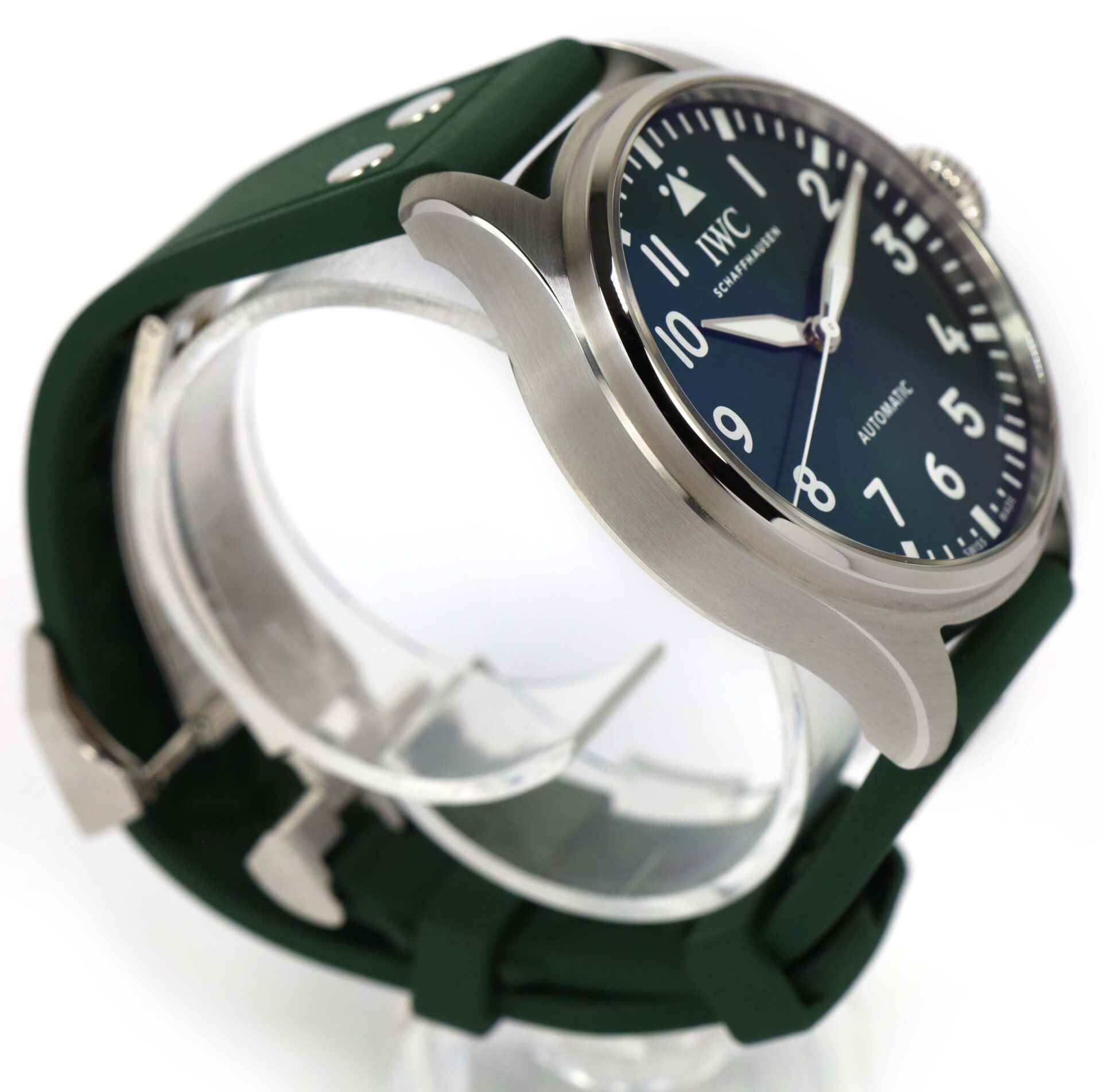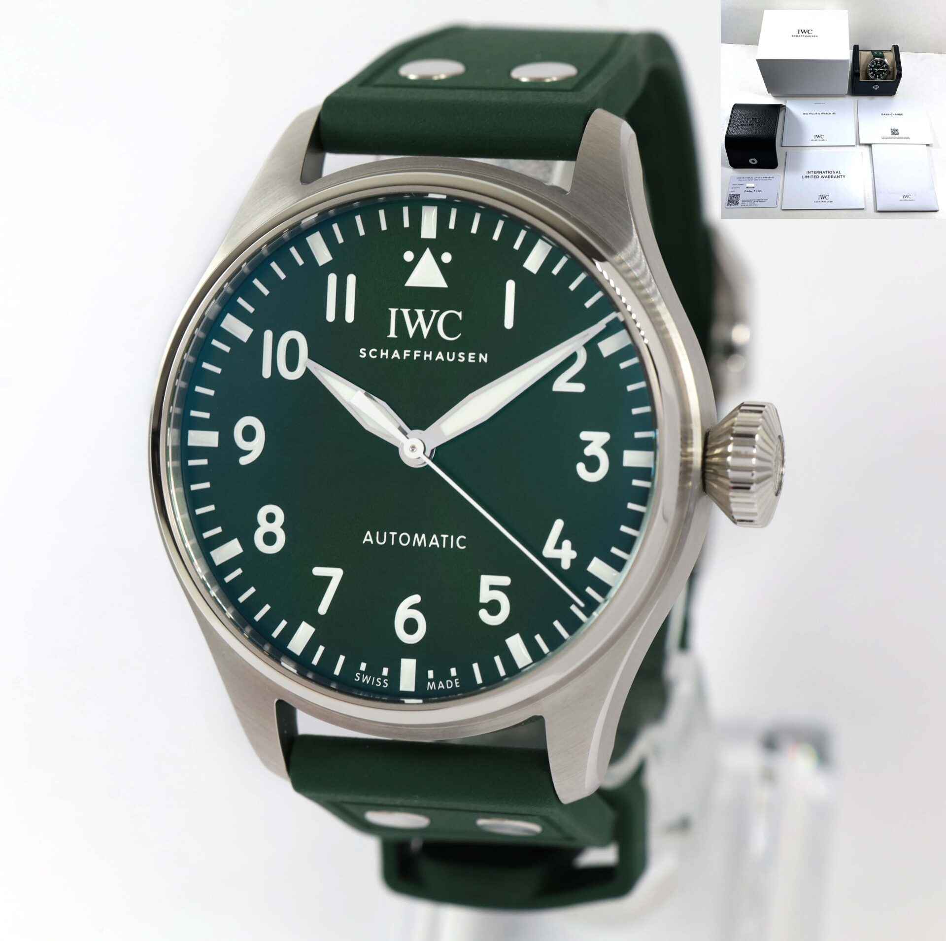 Read Morethis iwc watch is unworn and comes with its box , papers, iwc microfiber cloth, and warranty card dated october 7th, 2022. This watch features a stainless steel case surrounding a green sunburst dial with luminescence, and comes on a green rubber strap as shown in the photos attached.