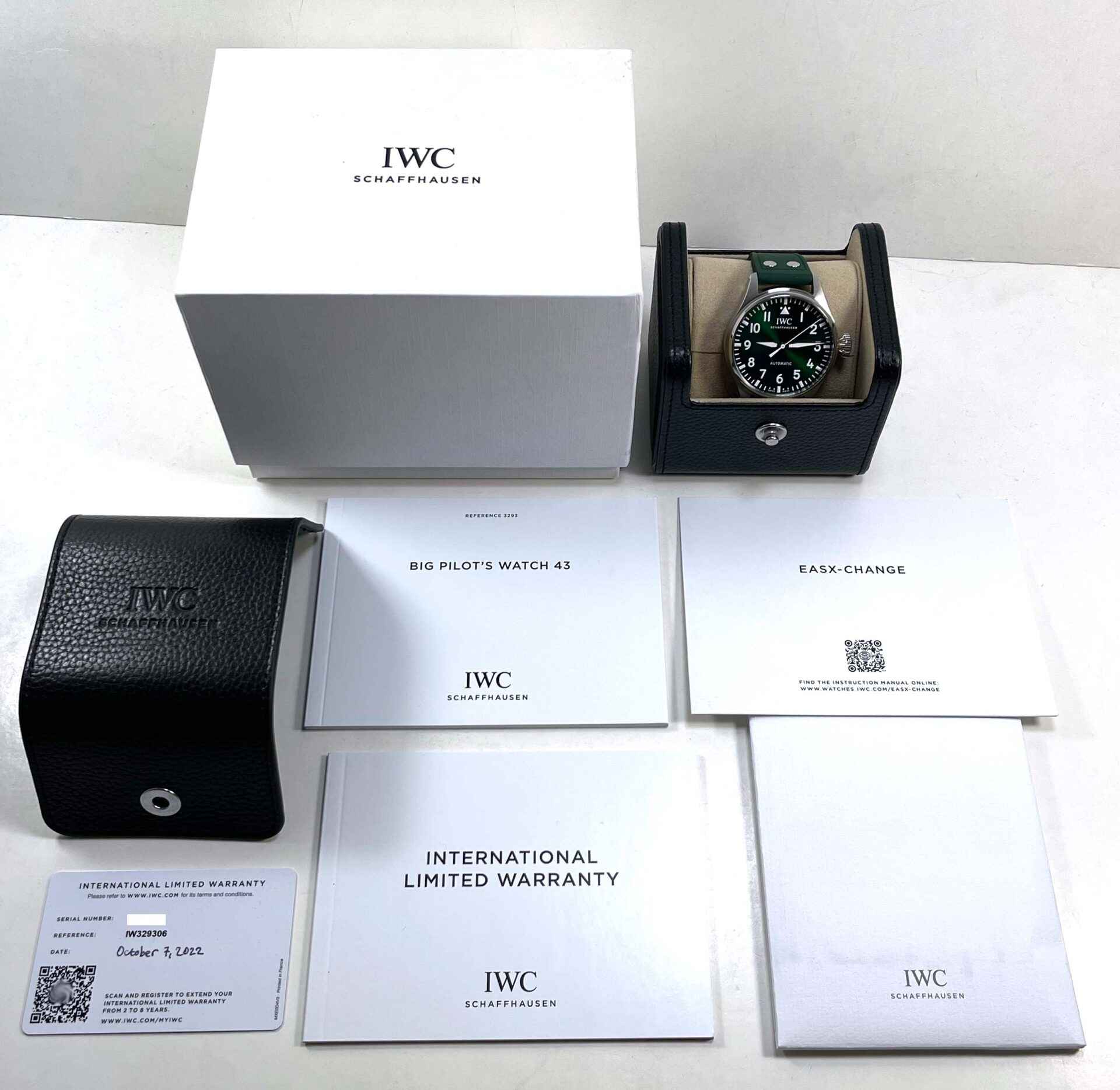 This IWC watch is unworn and comes with its box , papers, IWC microfiber cloth, and warranty card dated October 7th, 2022. This watch features a stainless steel case surrounding a green sunburst dial with luminescence, a...