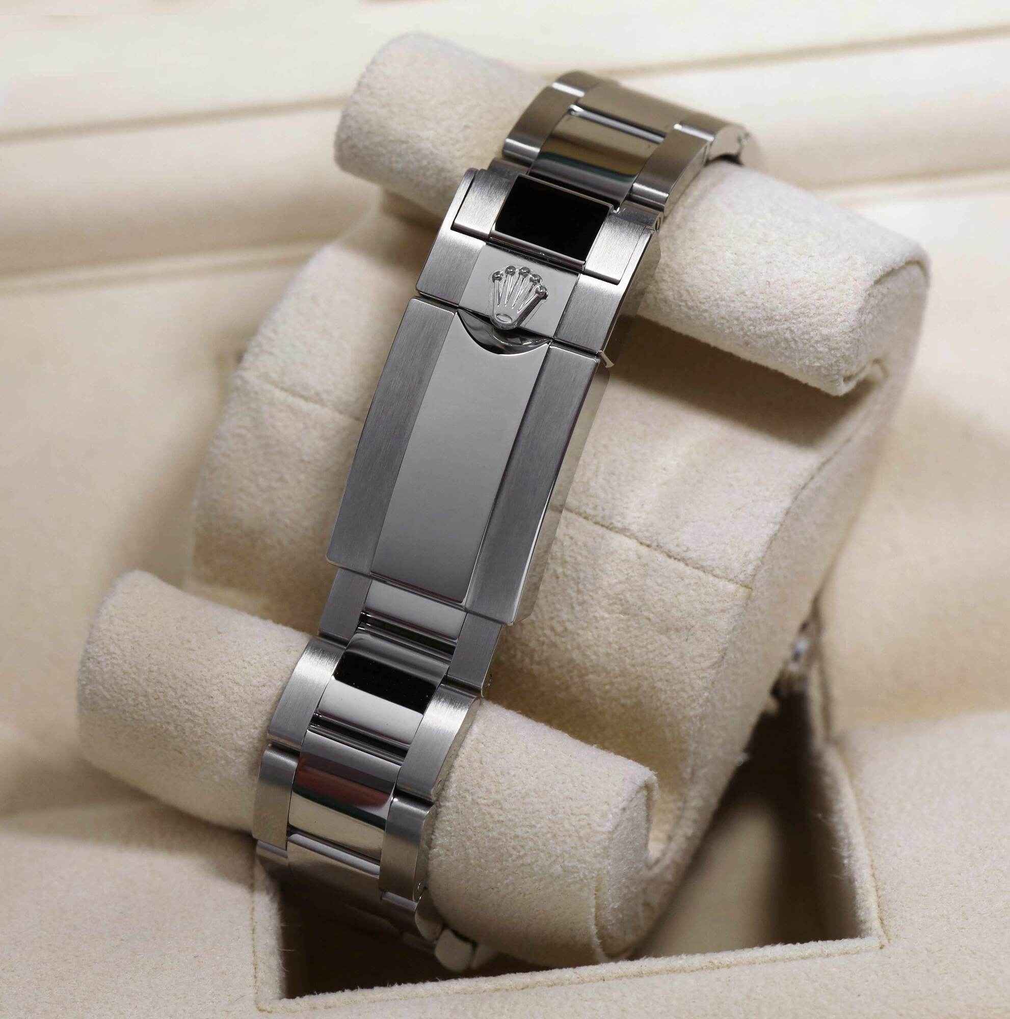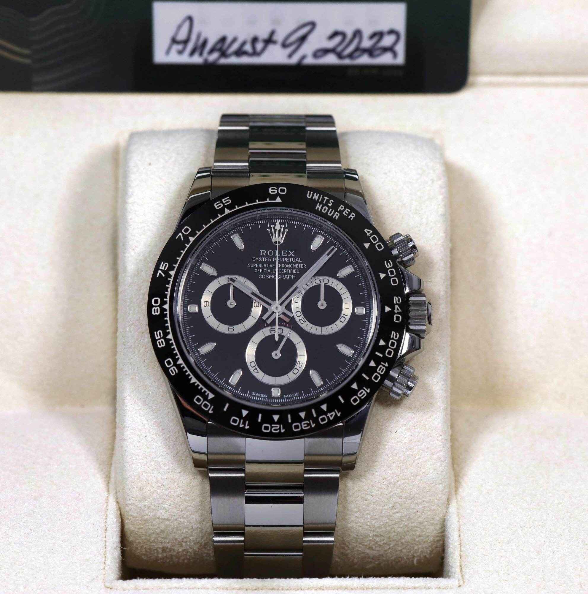 THIS ROLEX IS UNWORN AND COMES WITH ITS BOX, BOOKLETS, BEZEL PROTECTOR, BOTH HANG TAGS, AND WARRANTY CARD DATED AUGUST 9TH, 2022 AS SHOWN IN THE PICTURES ATTACHED. THIS WATCH IS IN STOCK AND AVAILABLE TO SHIP IMMEDIATELY!