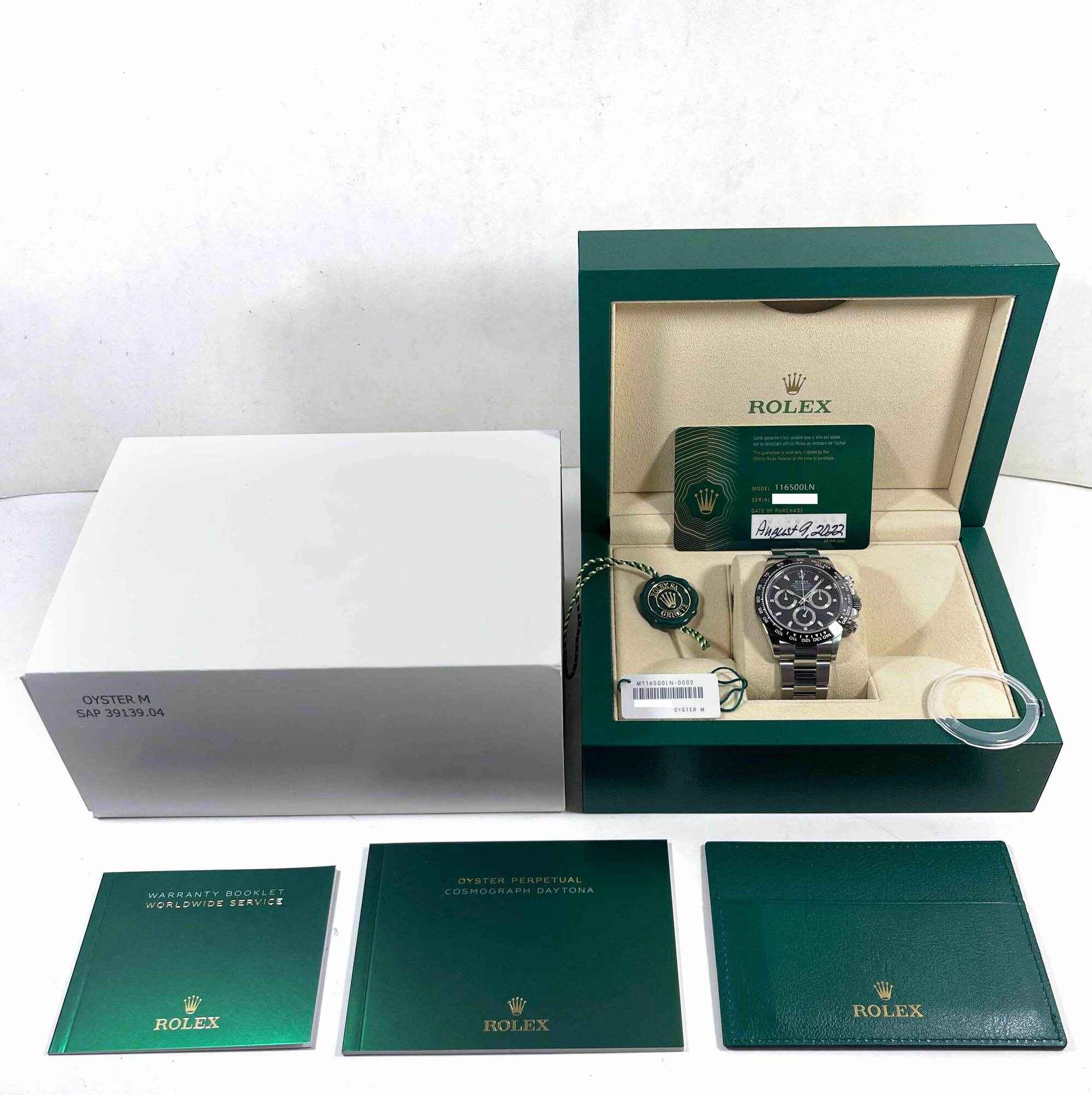 this rolex is unworn and comes with its box, booklets, bezel protector, both hang tags, and warranty card dated august 9th, 2022 as shown in the pictures attached. This watch is in stock and available to ship immediately!
