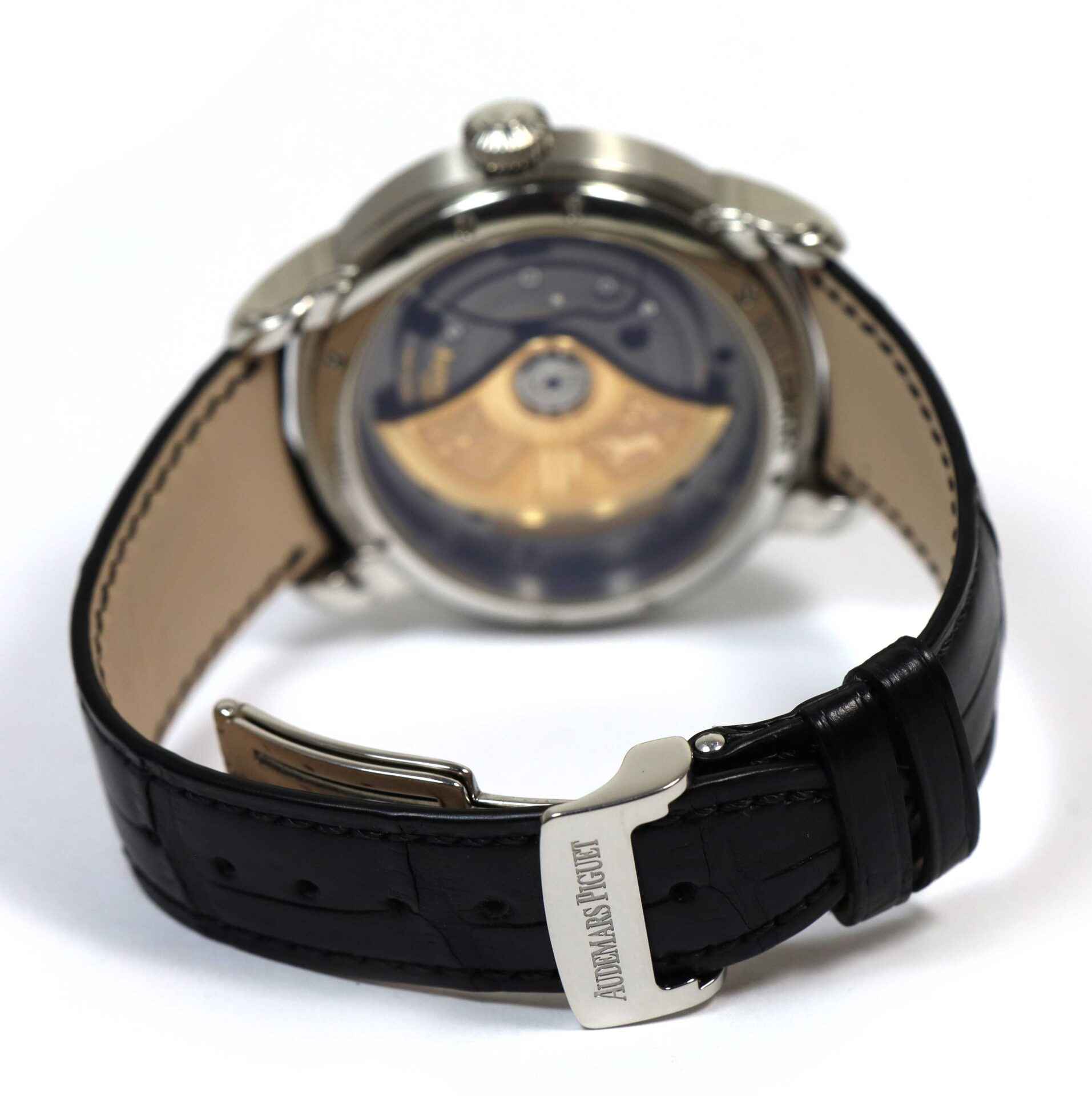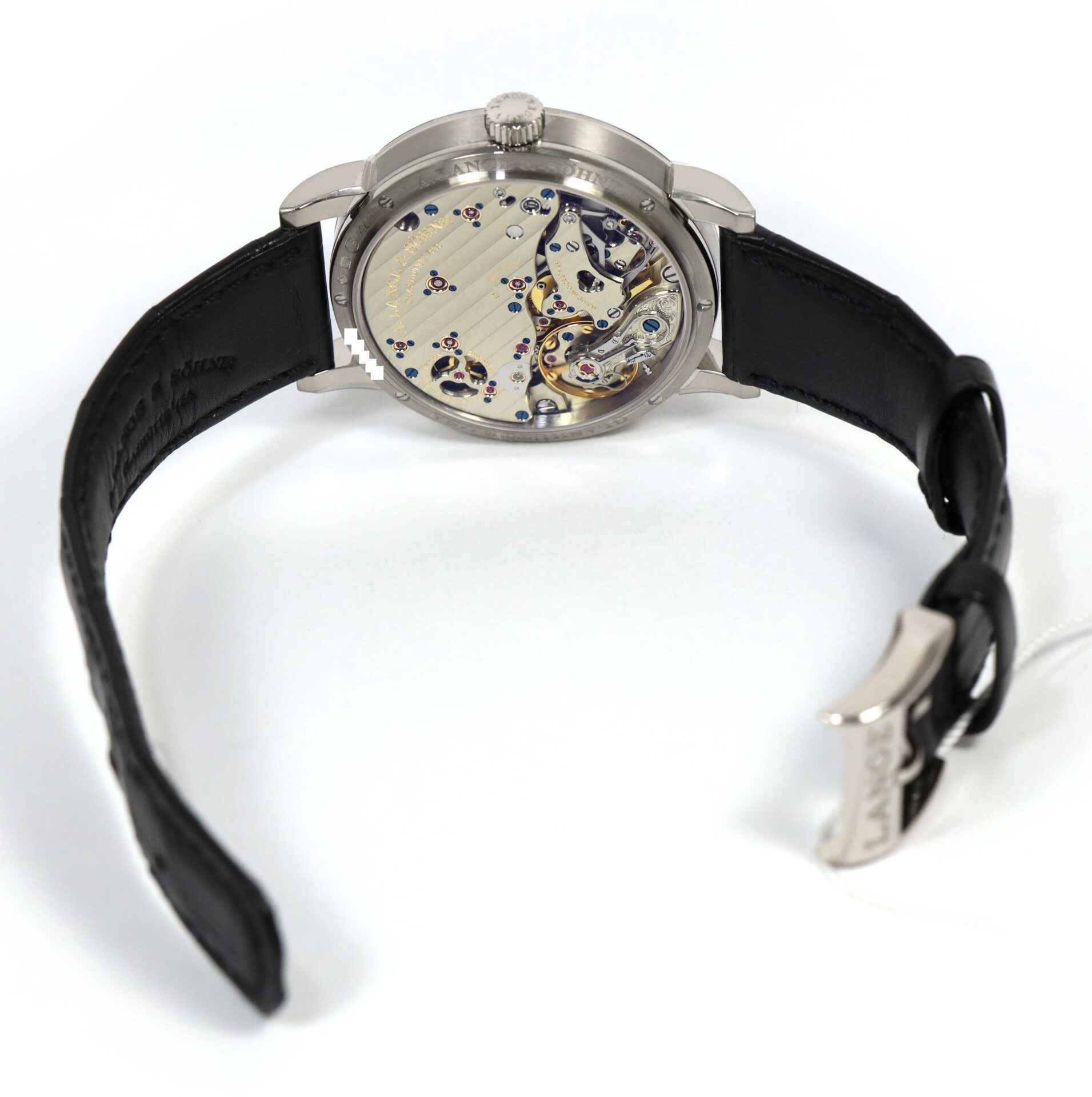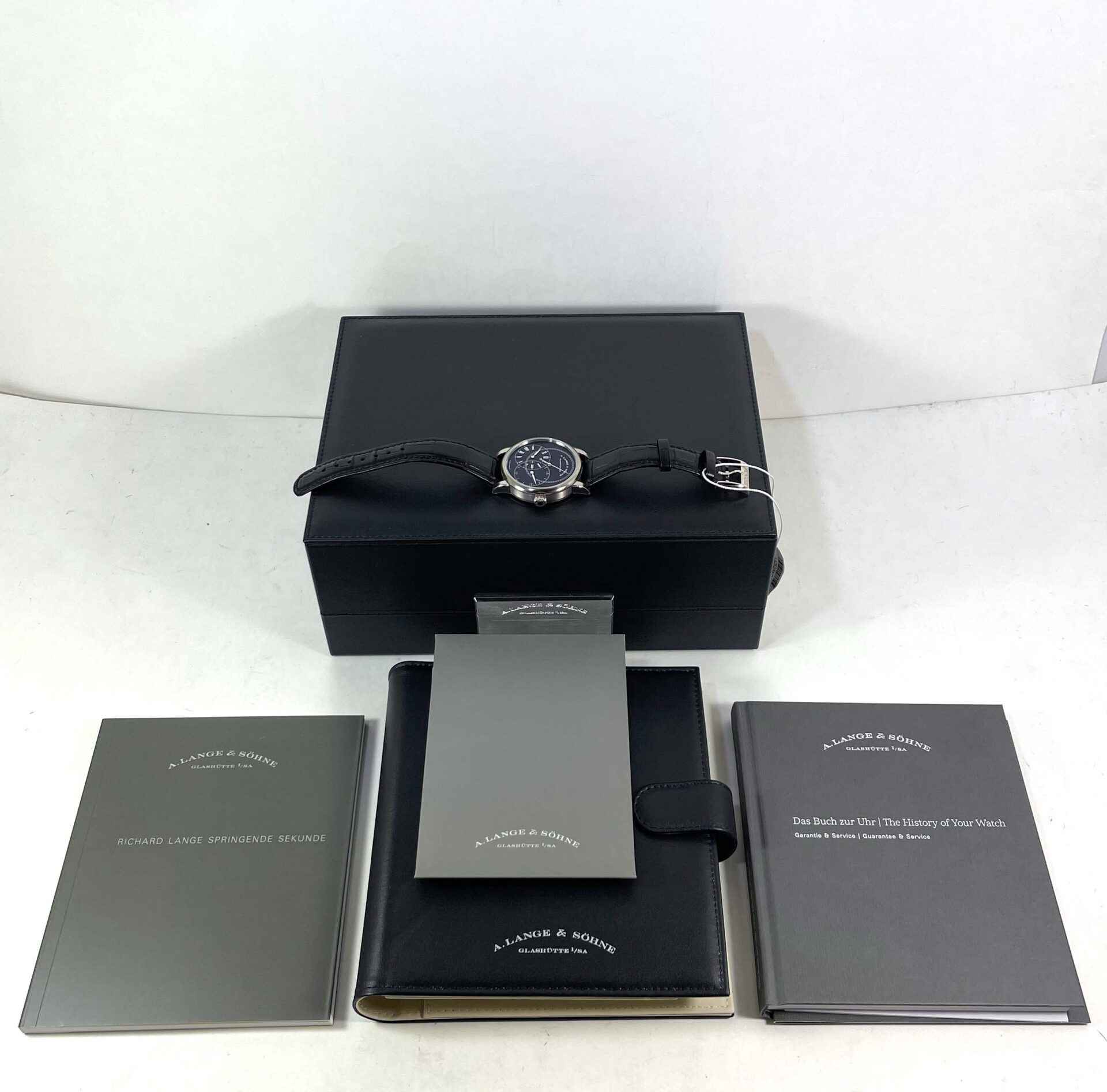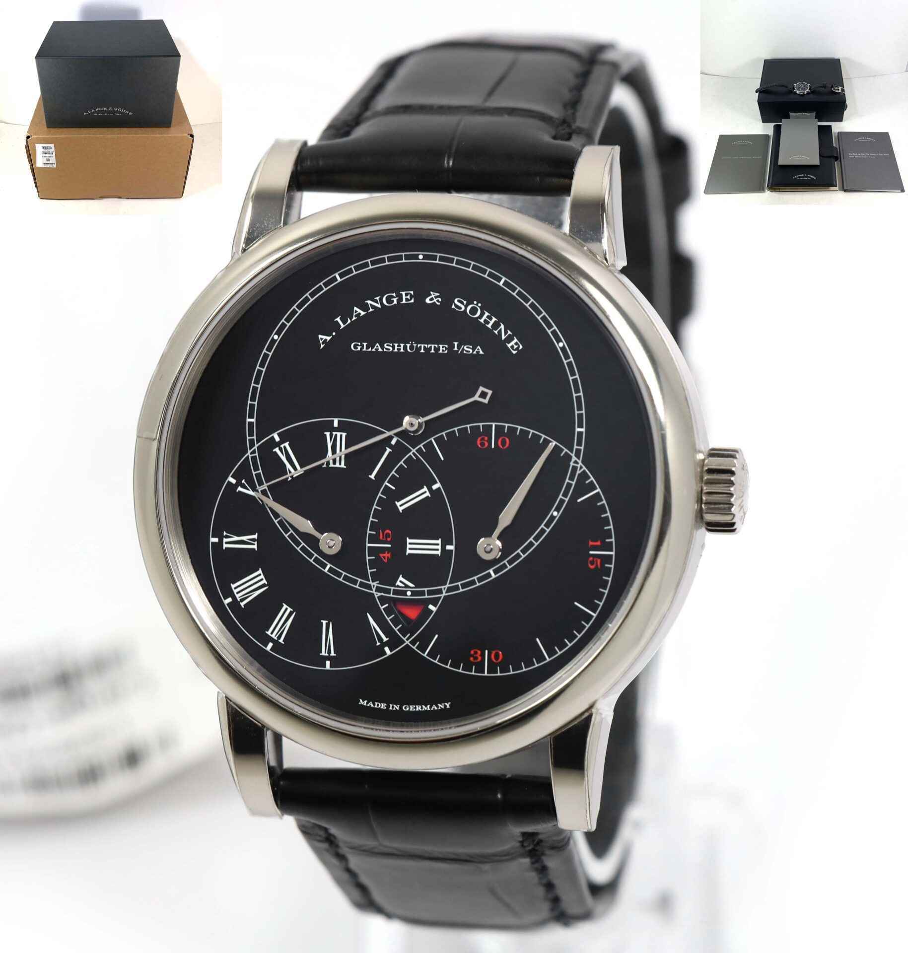 This A. Lange & Söhne is new with stickers and comes with its box, papers, A.Lange microfiber cloth, and warranty booklet dated August, 2022. This watch features a white gold case surrounding a black dial that displa...