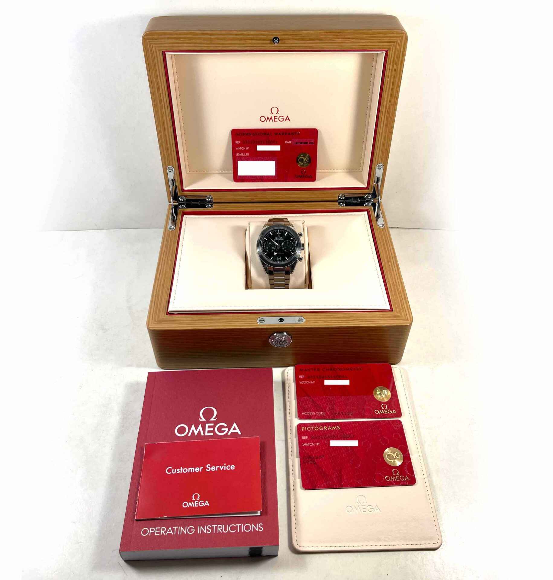 this omega speedmaster is in unworn condition and comes with its box, booklets, and warranty cards dated december, 2022. This watch is in stock and available to ship immediately!