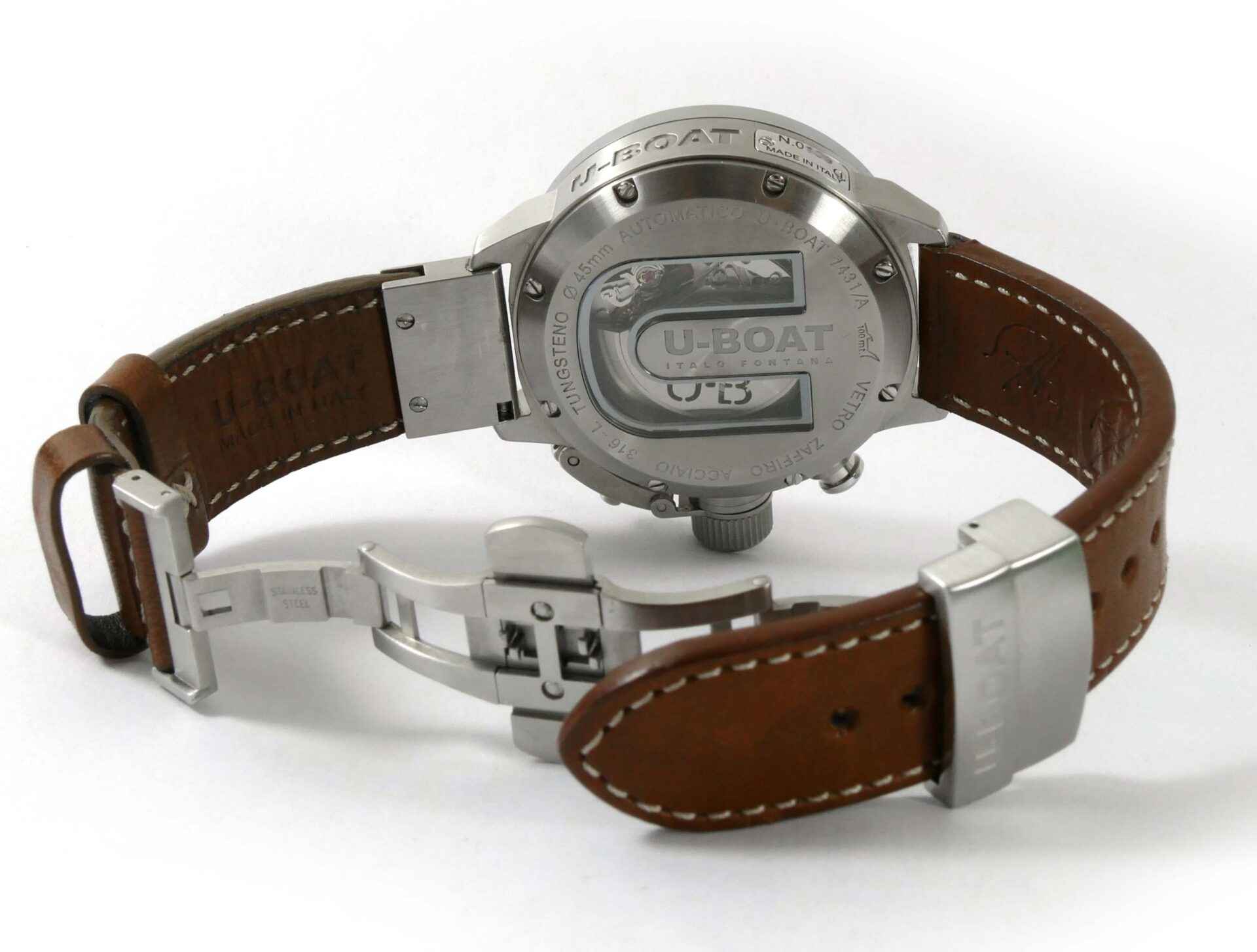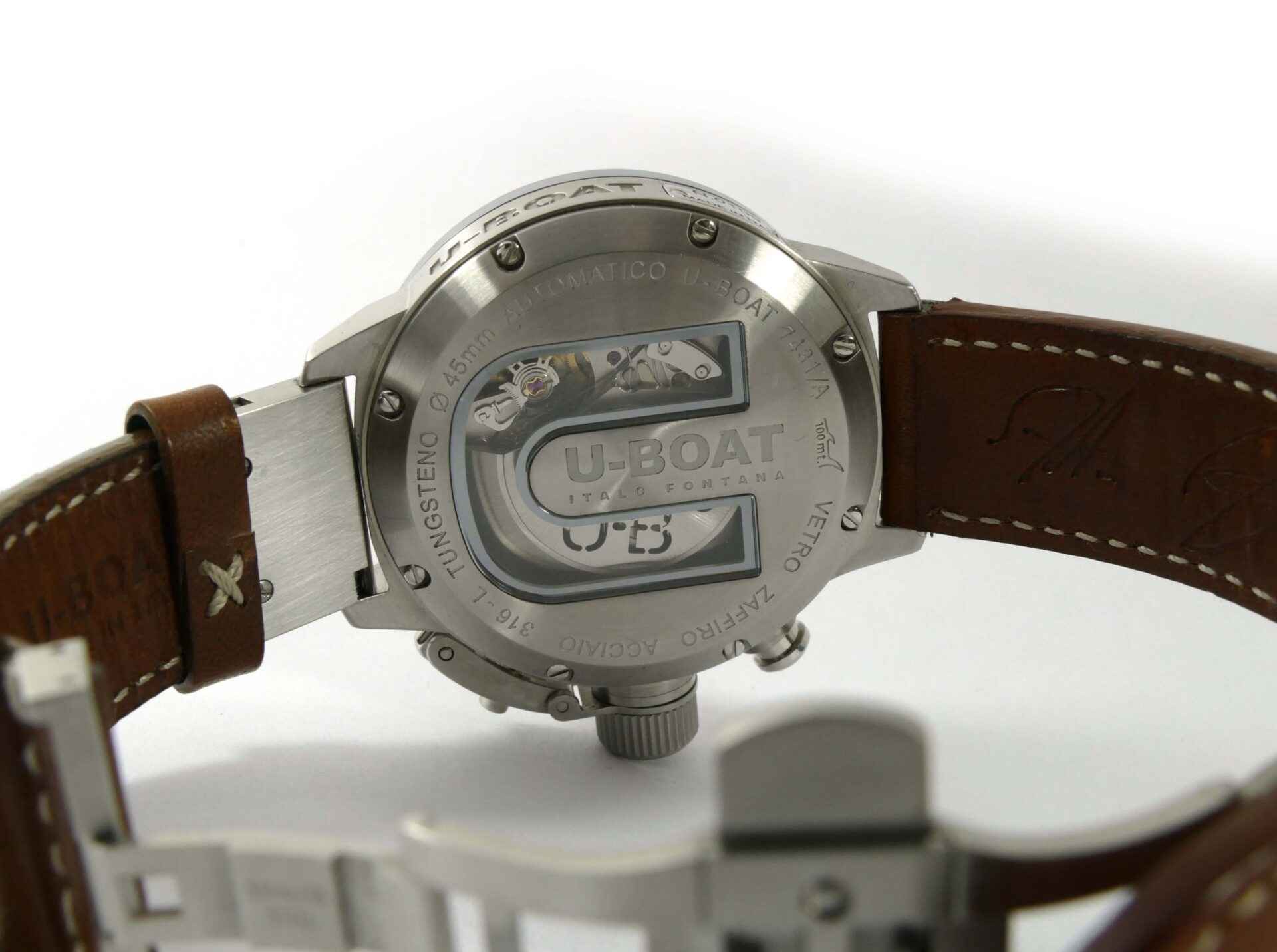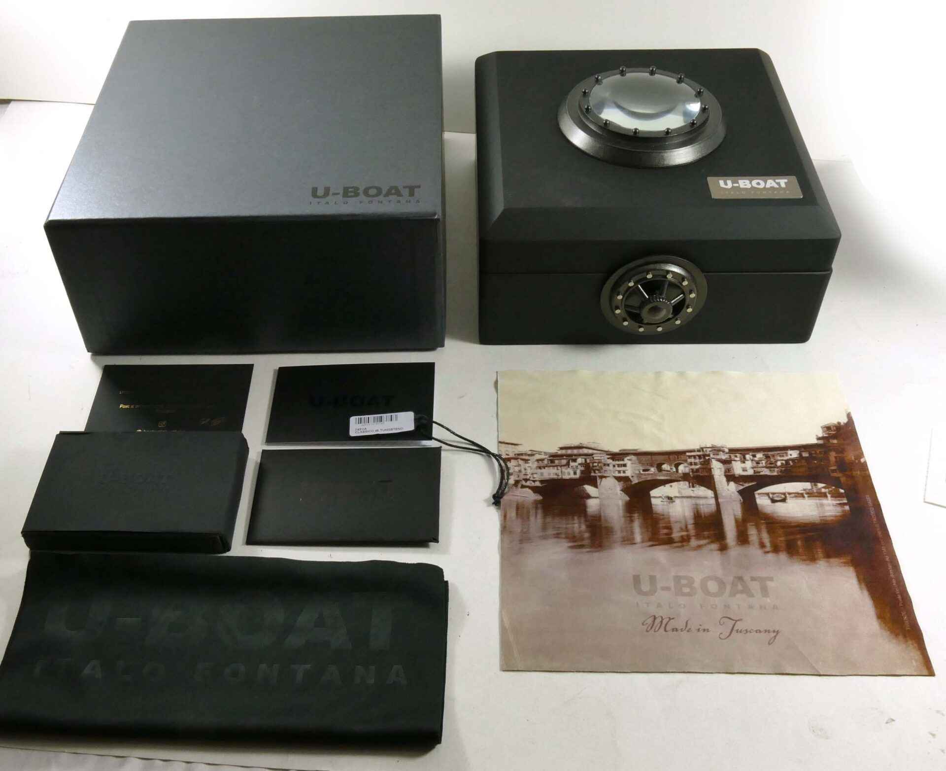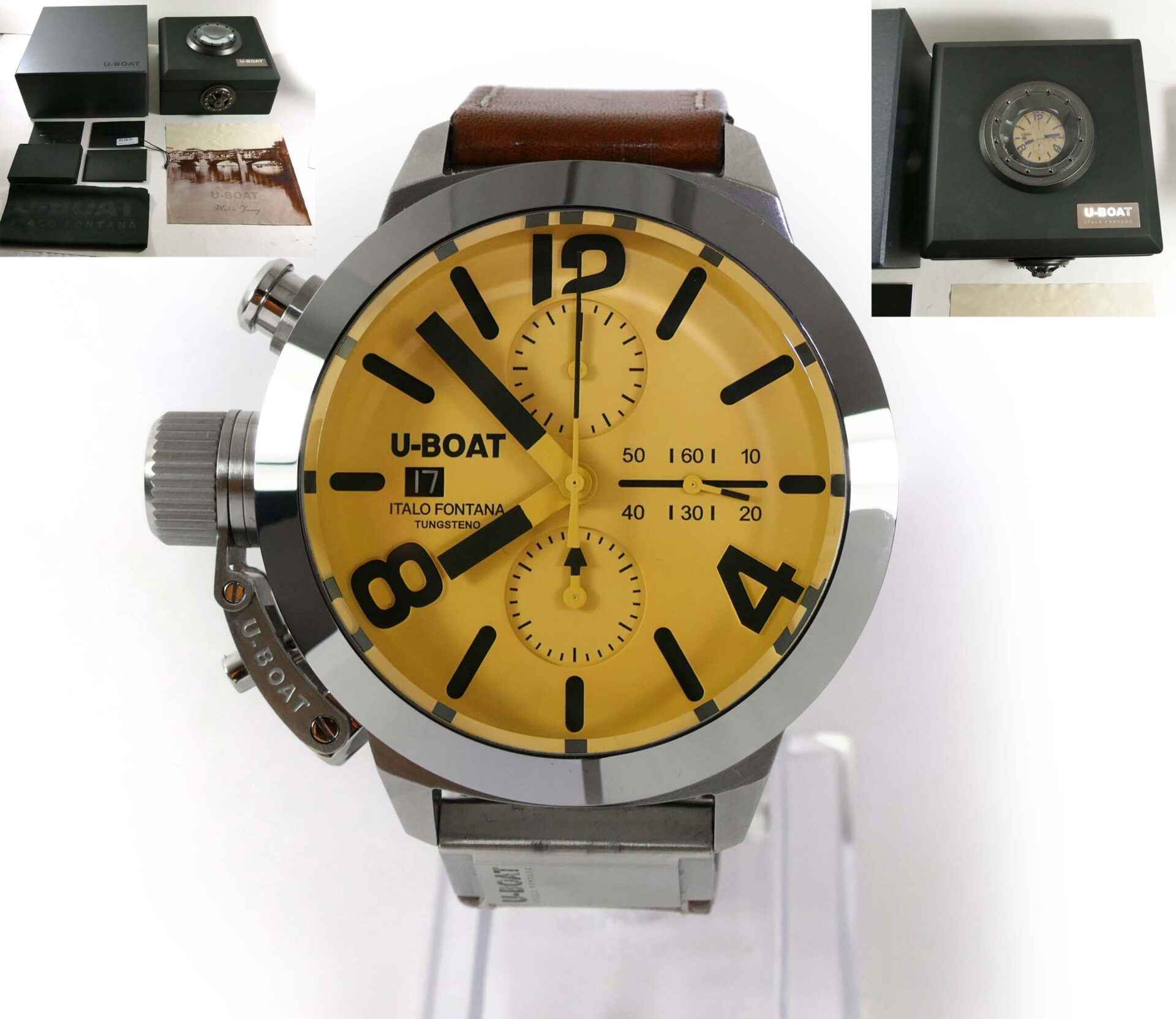 Read Morethis u-boat is in unworn condition and comes with its original box, papers, and anything else shown in the photos. The box is amazing, it is very heavy and features a twisting lock mechanism, as well as a magnifier from the top side to view the watch.