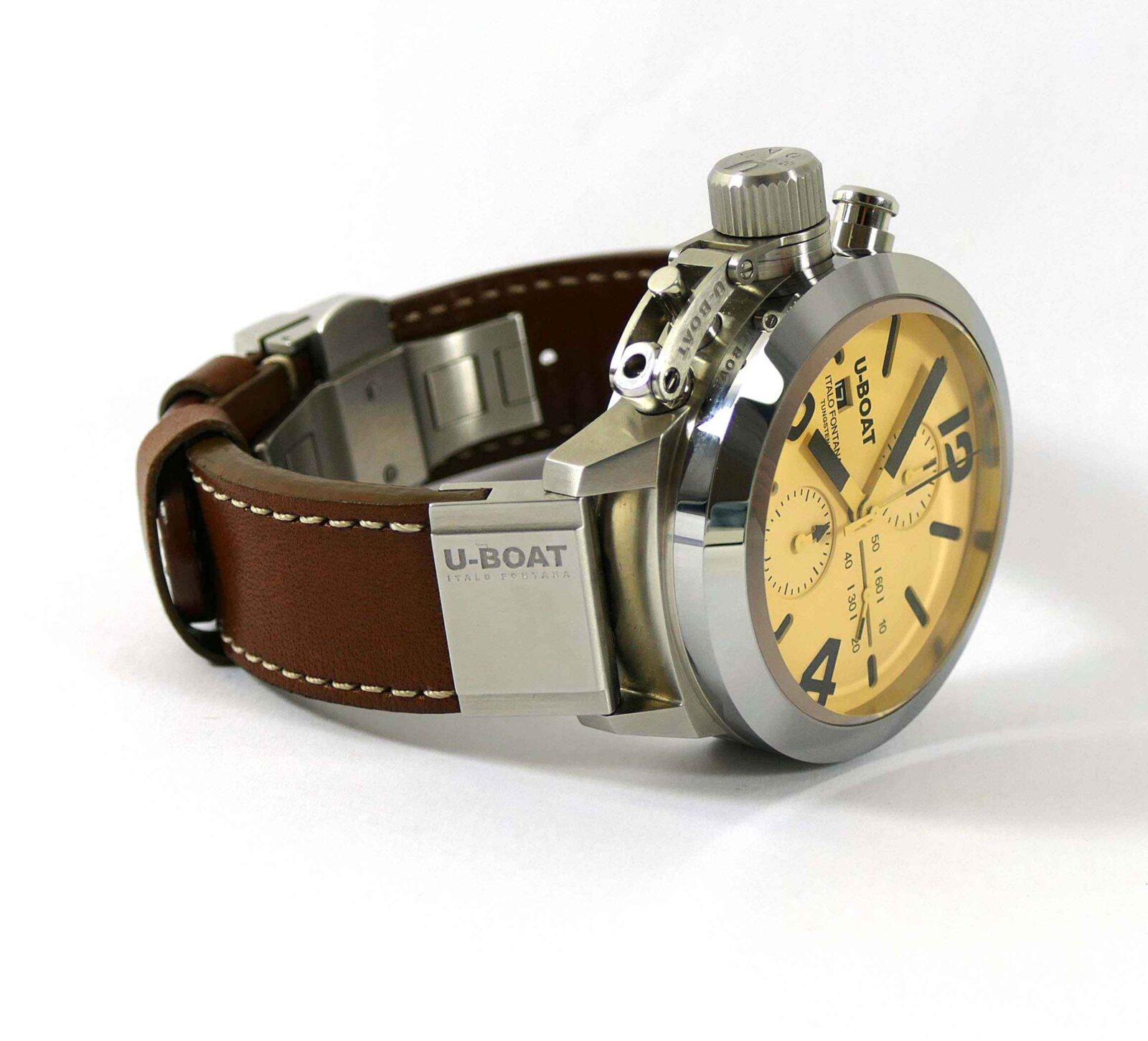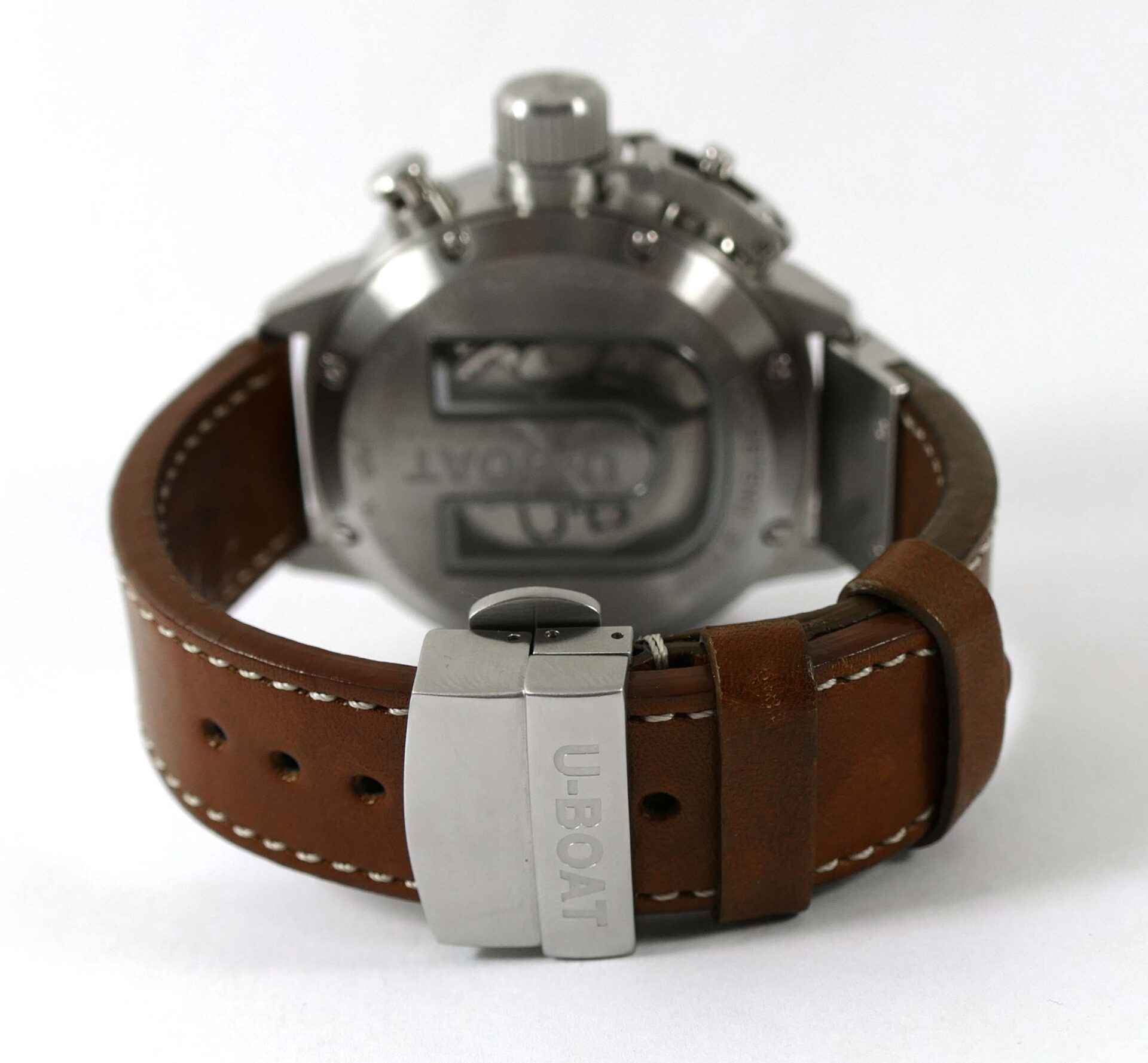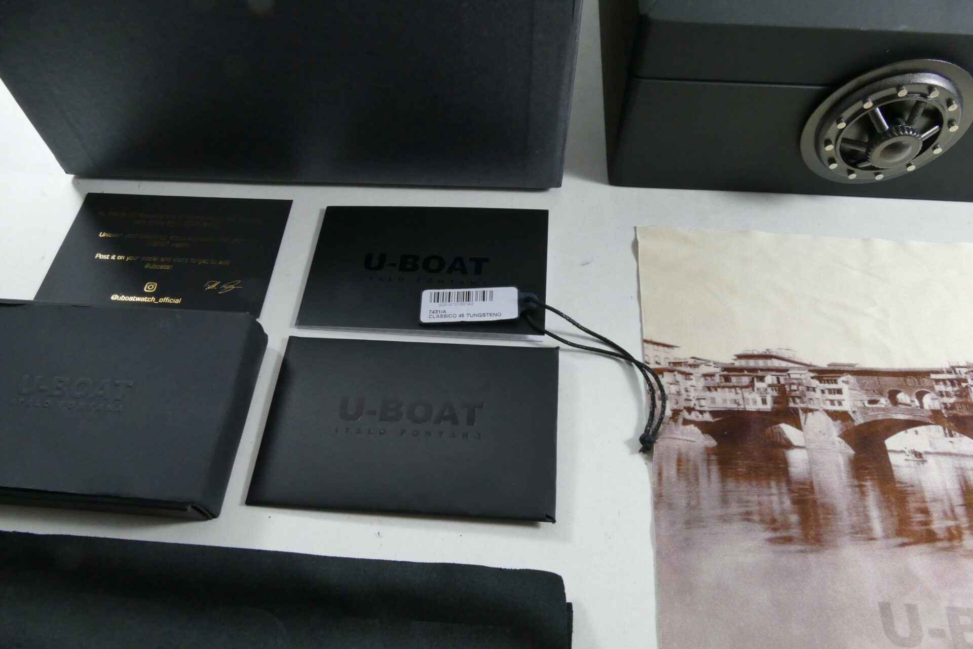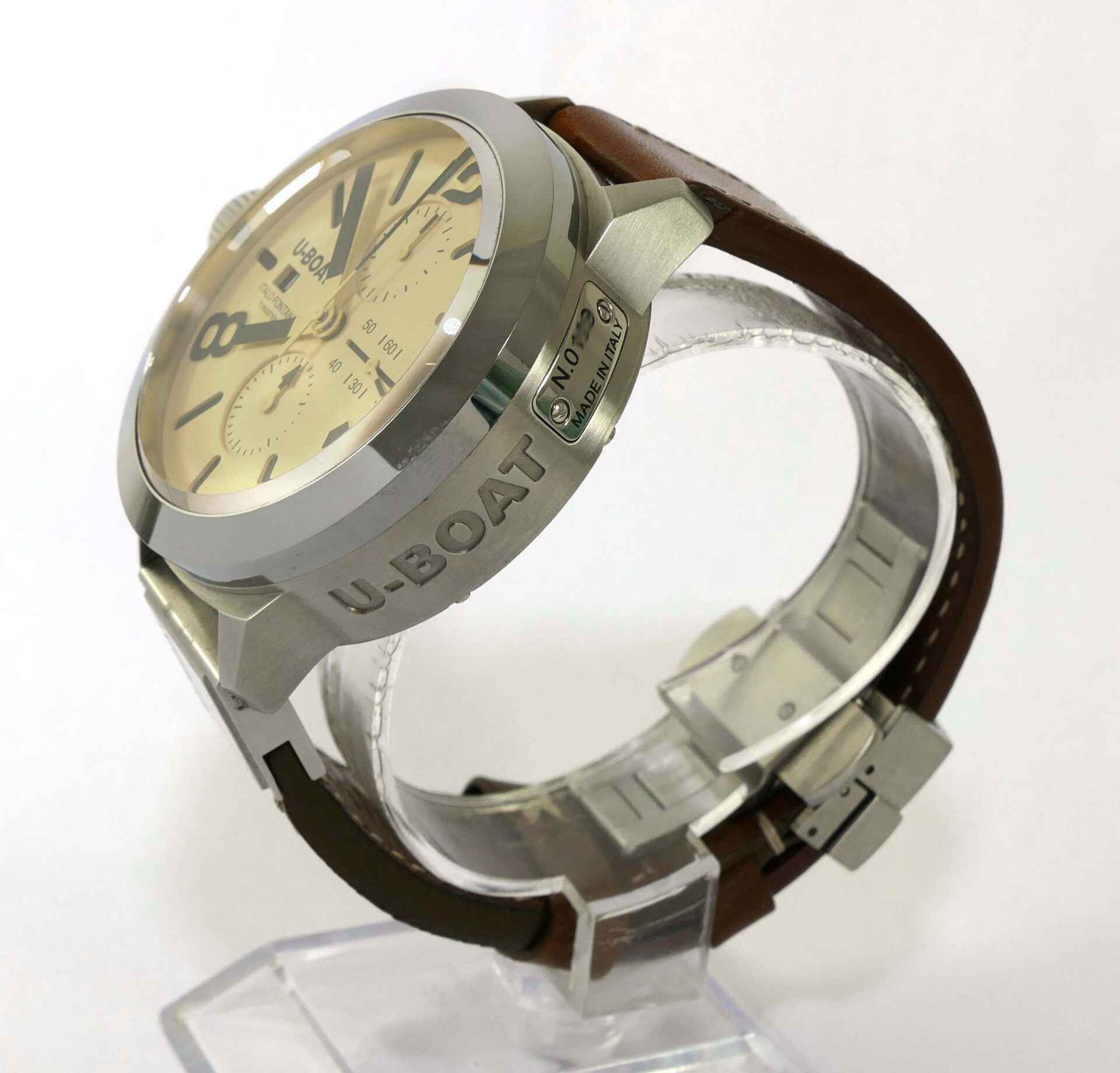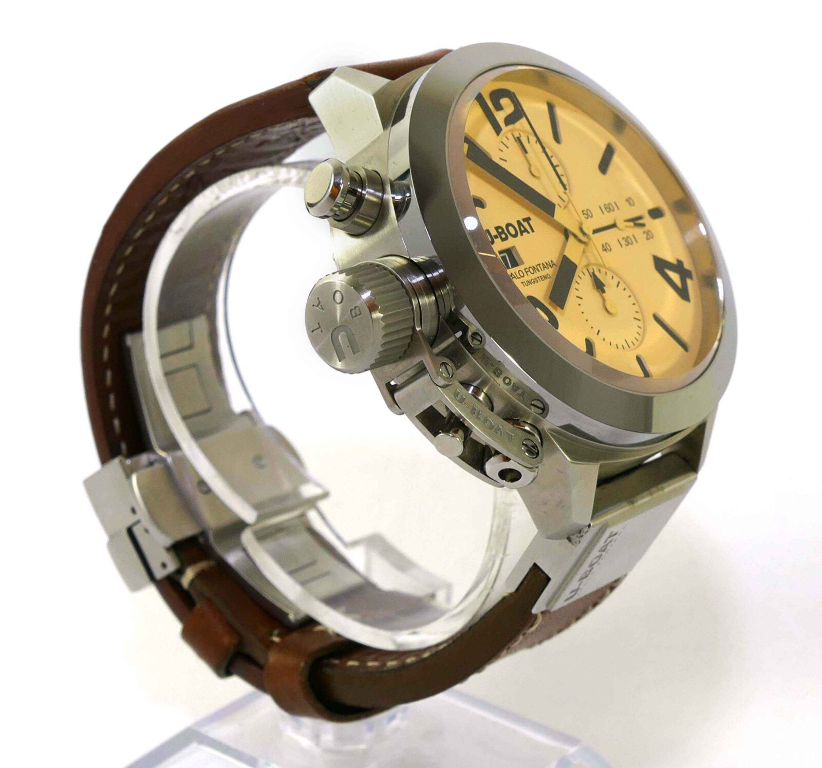 Read Morethis u-boat is in unworn condition and comes with its original box, papers, and anything else shown in the photos. The box is amazing, it is very heavy and features a twisting lock mechanism, as well as a magnifier from the top side to view the watch.
