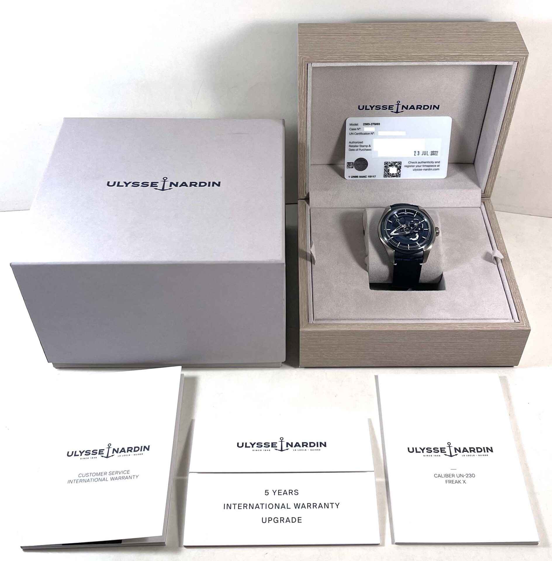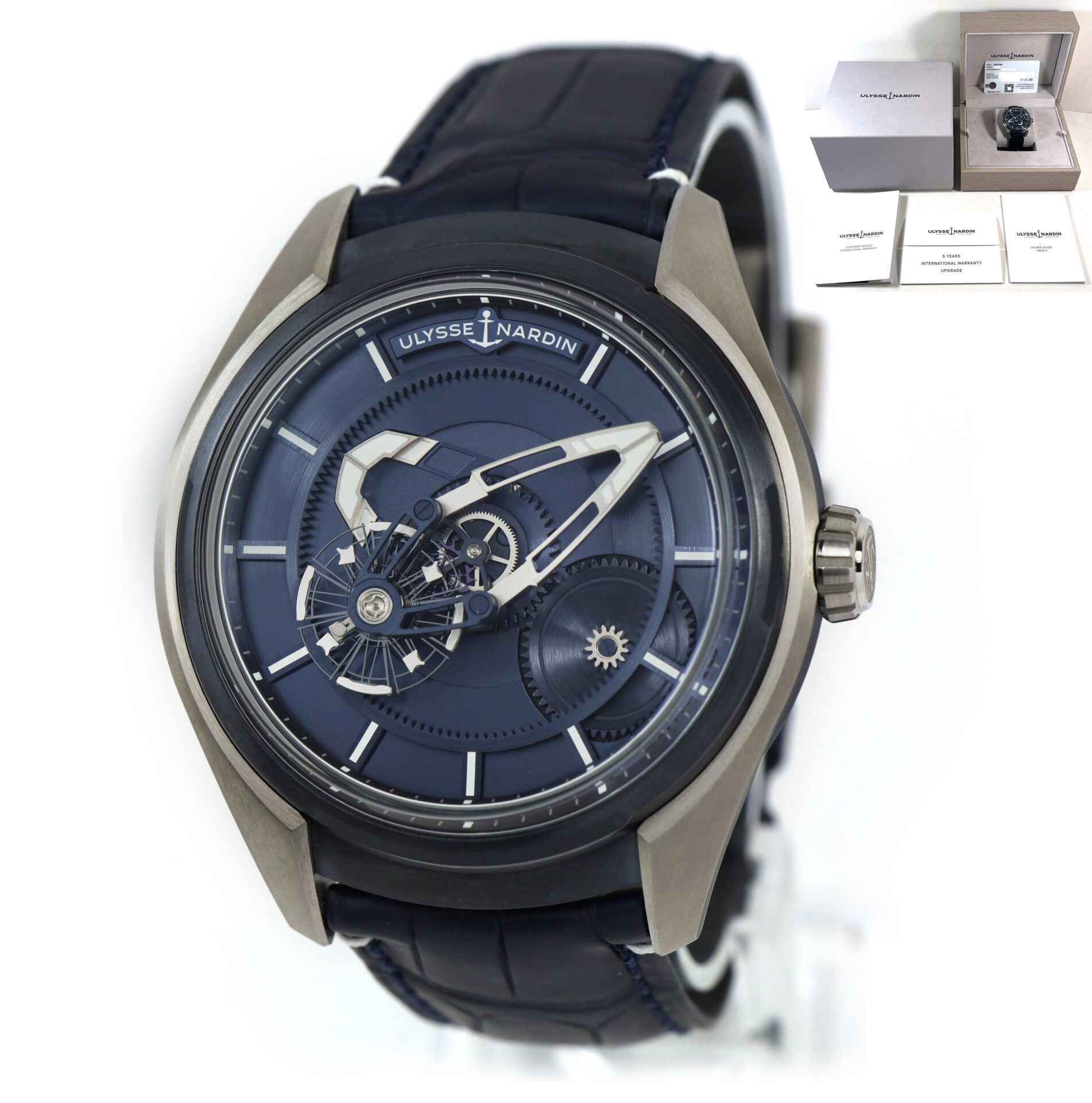 this ulysse nardin watch is new with stickers on the clasp and caseback as shown in the photos attached. This watch comes with its box, booklets, and warranty card dated july 23rd, 2022. this watch features a 43mm titanium case with a blue dial and comes on a blue leather strap. This watch is in stock and available to ship immediately!