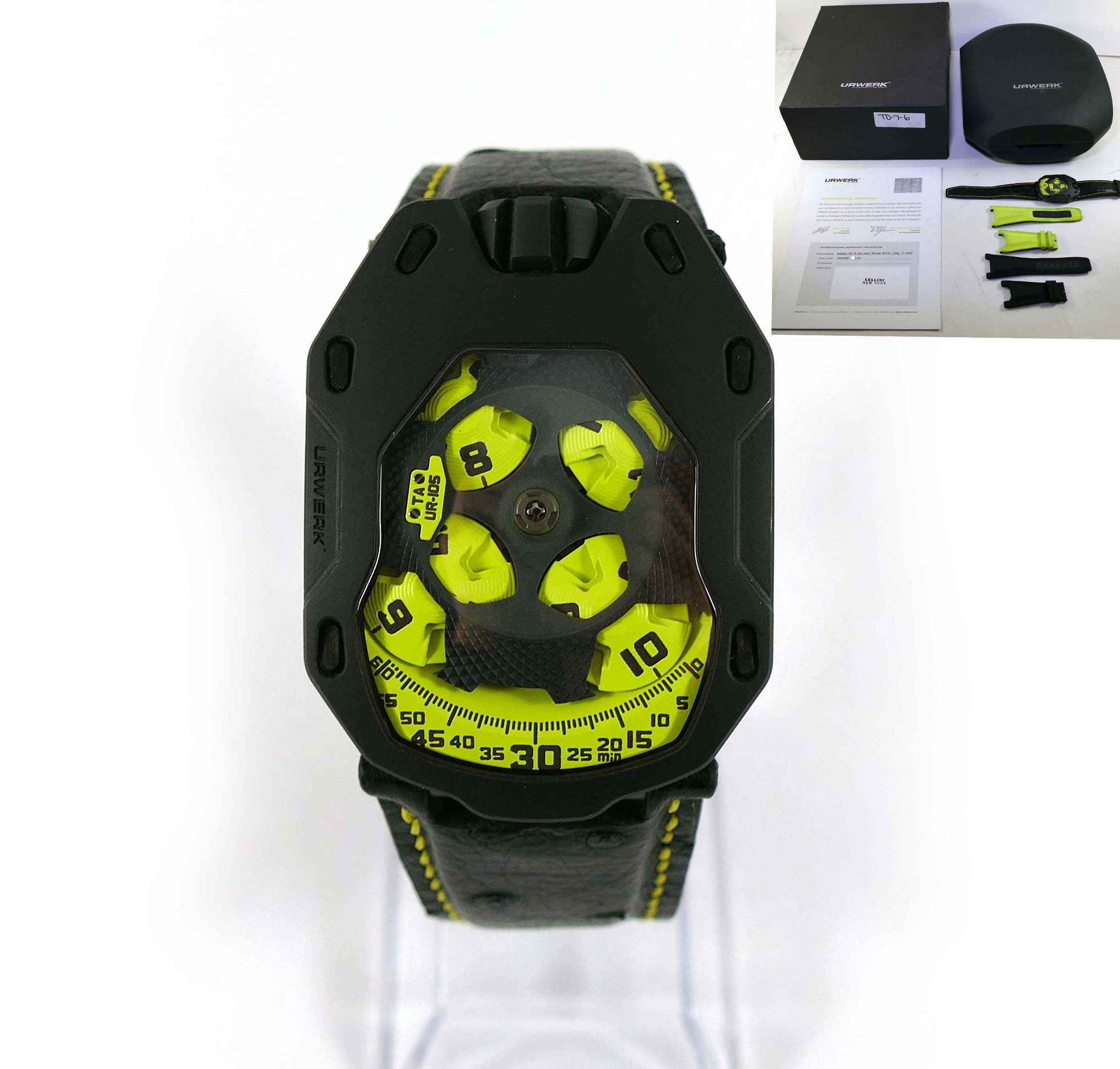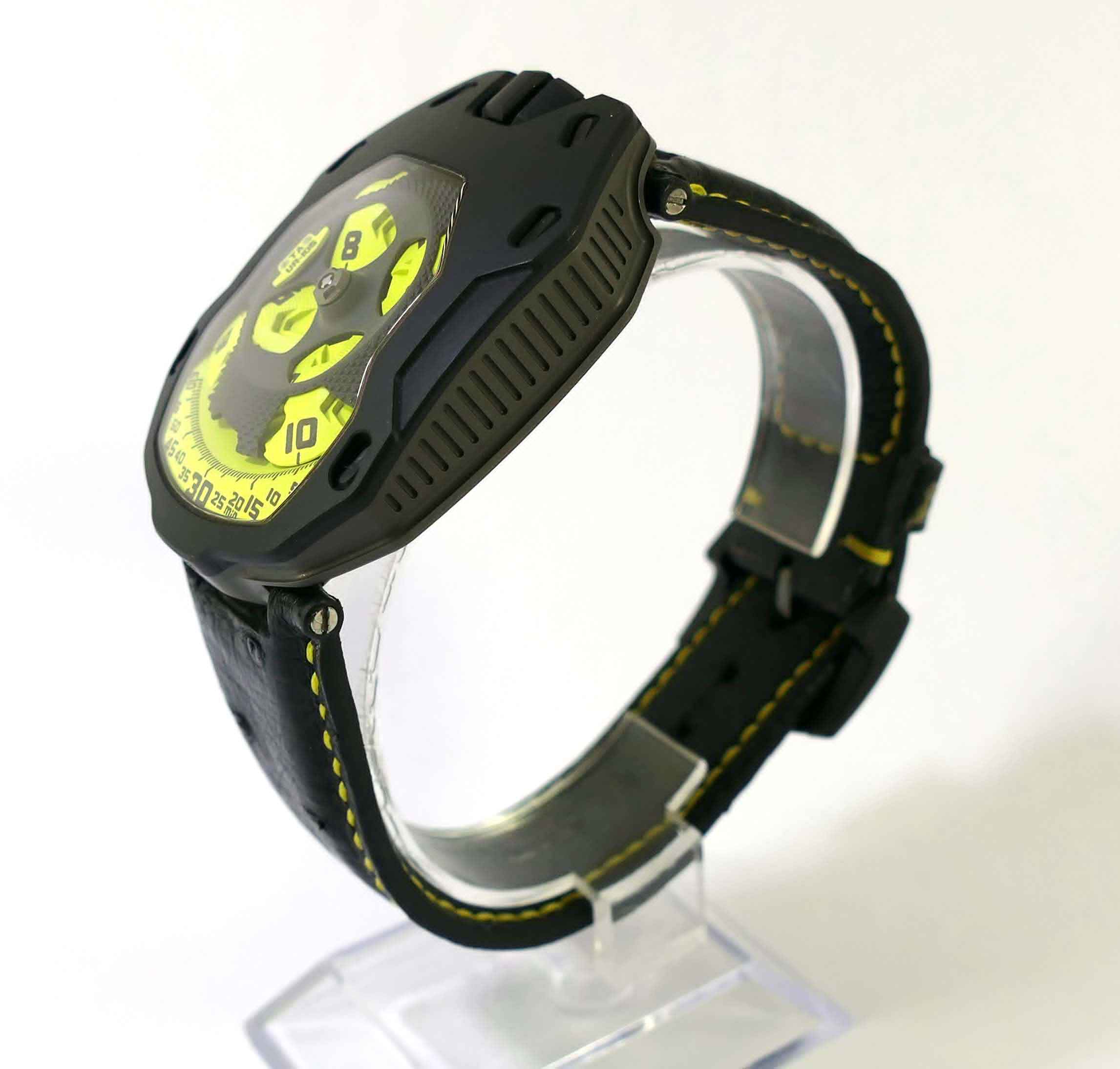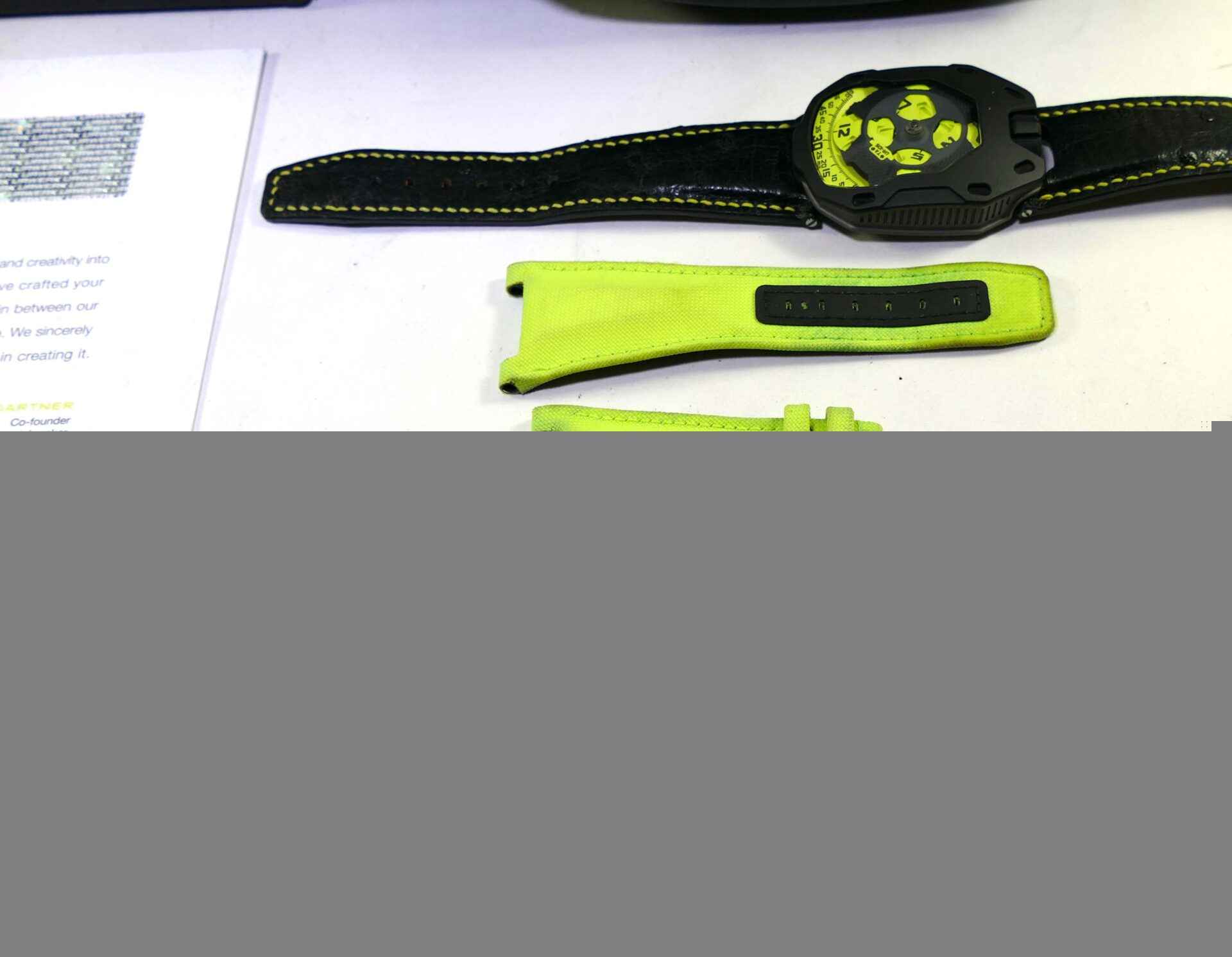 Read Morethis watch is in excellent condition and comes with its complete set of boxes, warranty papers, and 2 additional straps. It comes with its original black and yellow straps, as well as the custom ostrich leather with yellow stitch strap that the watch was photographed on. The black strap is unworn, the yellow strap shows some wear, but is in great condition. This watch is in super nice condition, showing very minimal wear throughout. The case is titanium with black coating, making it quite light. It is amazing to change time, as the “hour satellites” carousel around displaying the proper time.