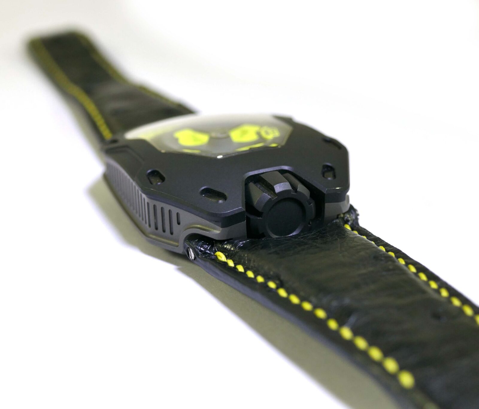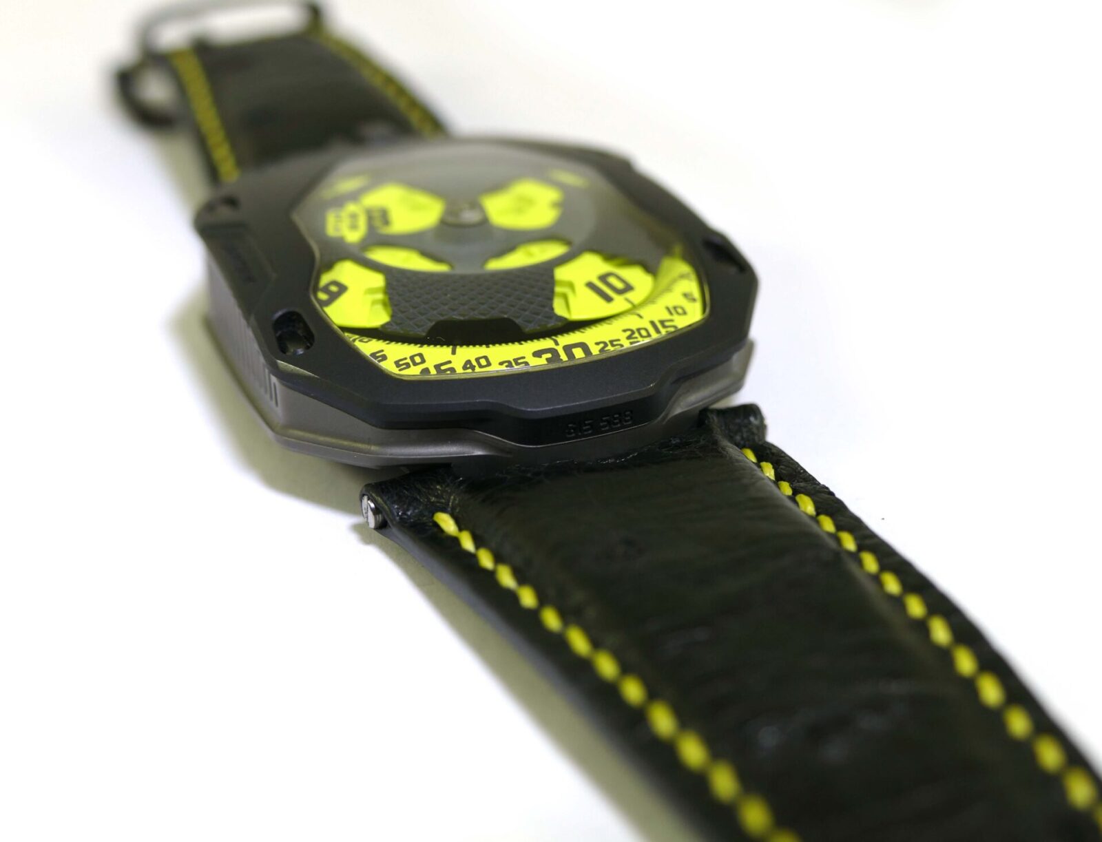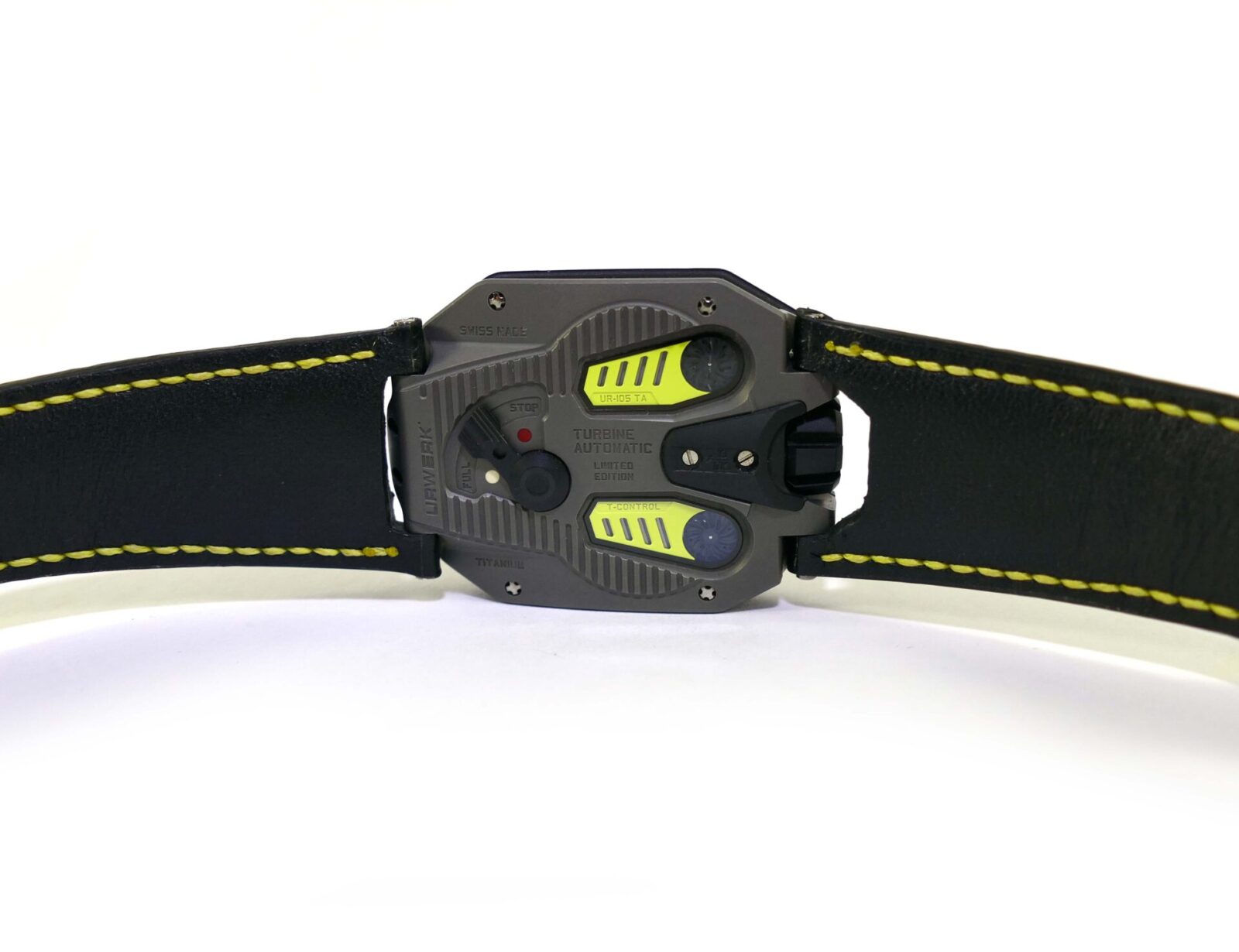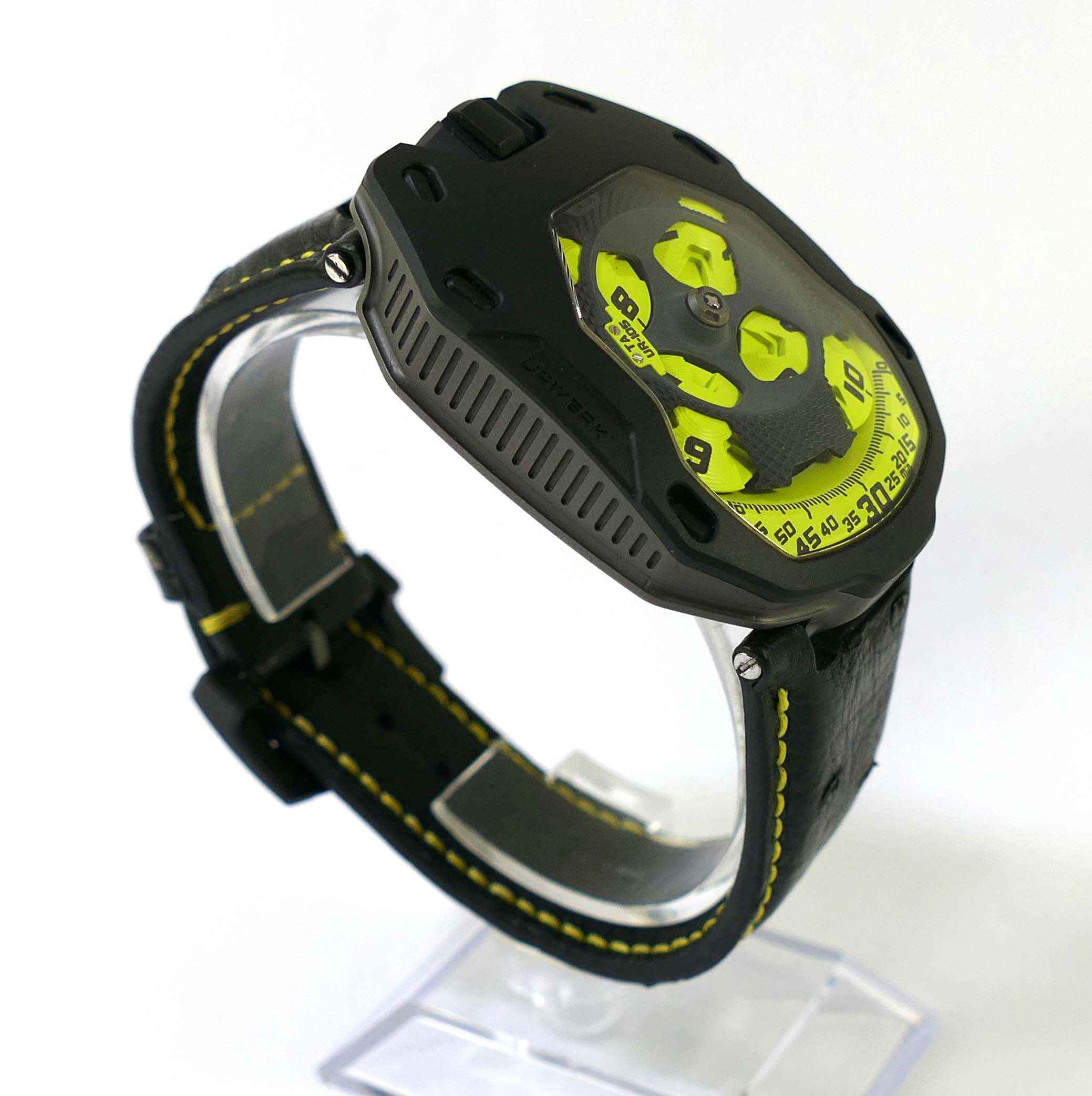Read Morethis watch is in excellent condition and comes with its complete set of boxes, warranty papers, and 2 additional straps. It comes with its original black and yellow straps, as well as the custom ostrich leather with yellow stitch strap that the watch was photographed on. The black strap is unworn, the yellow strap shows some wear, but is in great condition. This watch is in super nice condition, showing very minimal wear throughout. The case is titanium with black coating, making it quite light. It is amazing to change time, as the “hour satellites” carousel around displaying the proper time.