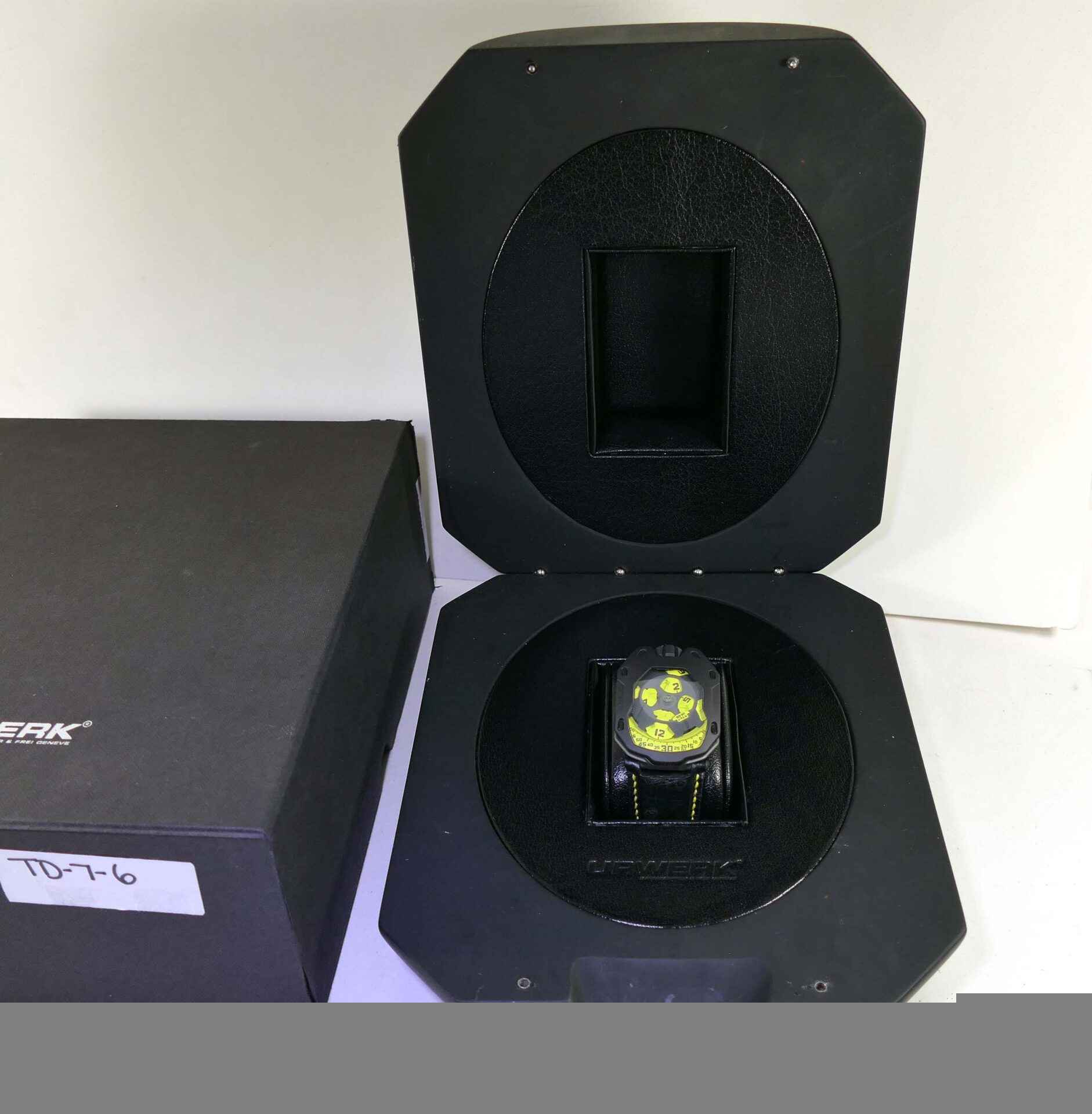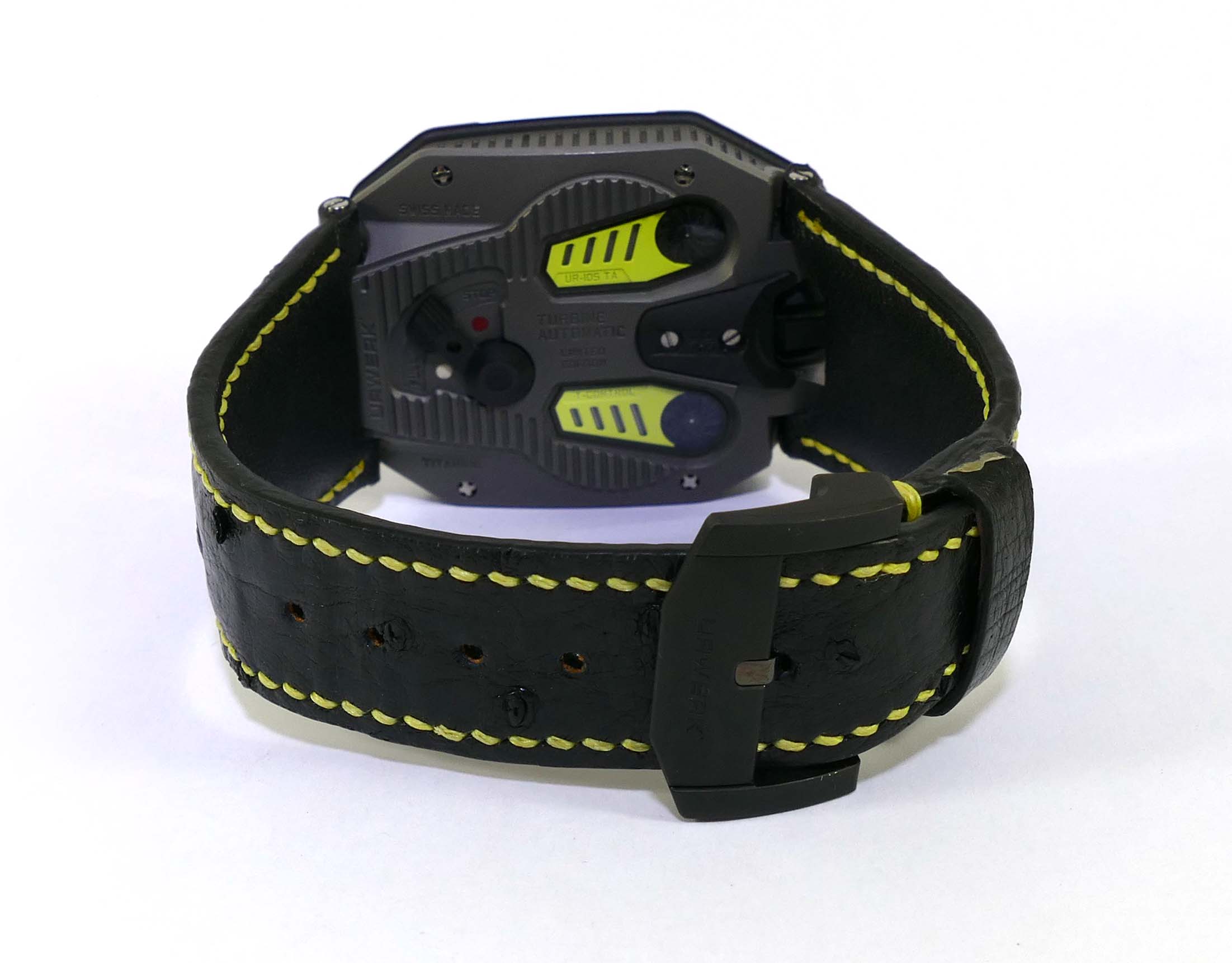 This watch is in excellent condition and comes with its complete set of boxes, warranty papers, and 2 additional straps. It comes with its original black and yellow straps, as well as the custom Ostrich Leather with Yel...